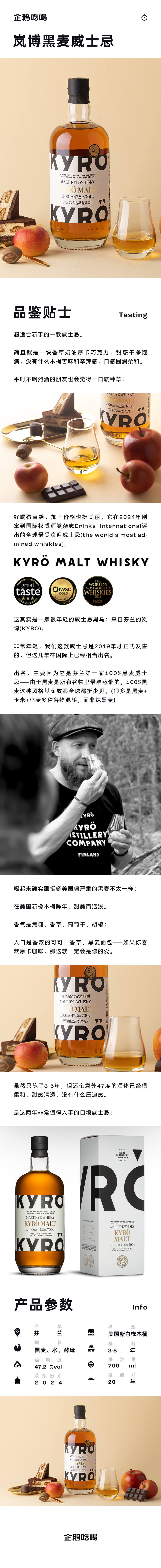 企鹅市集|岚博kyro黑麦威士忌700ml 美国新白橡木桶 香草奶油摩卡巧克力 入门友好
