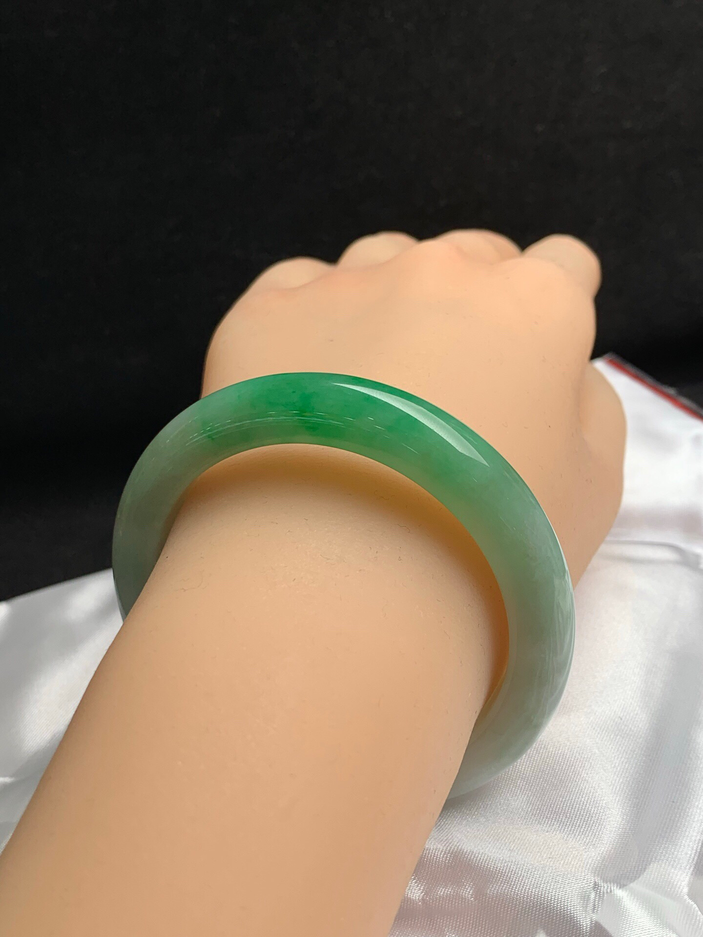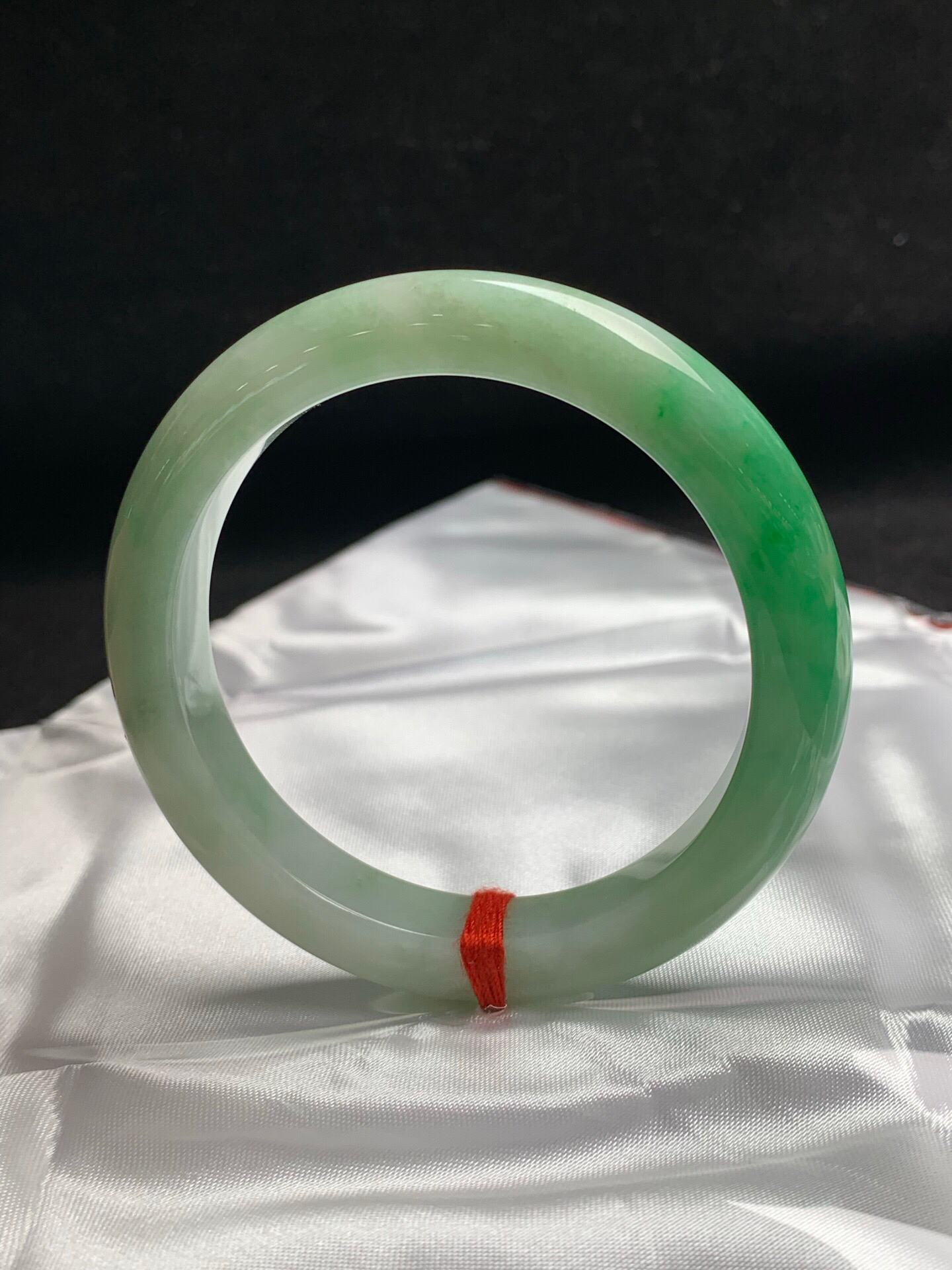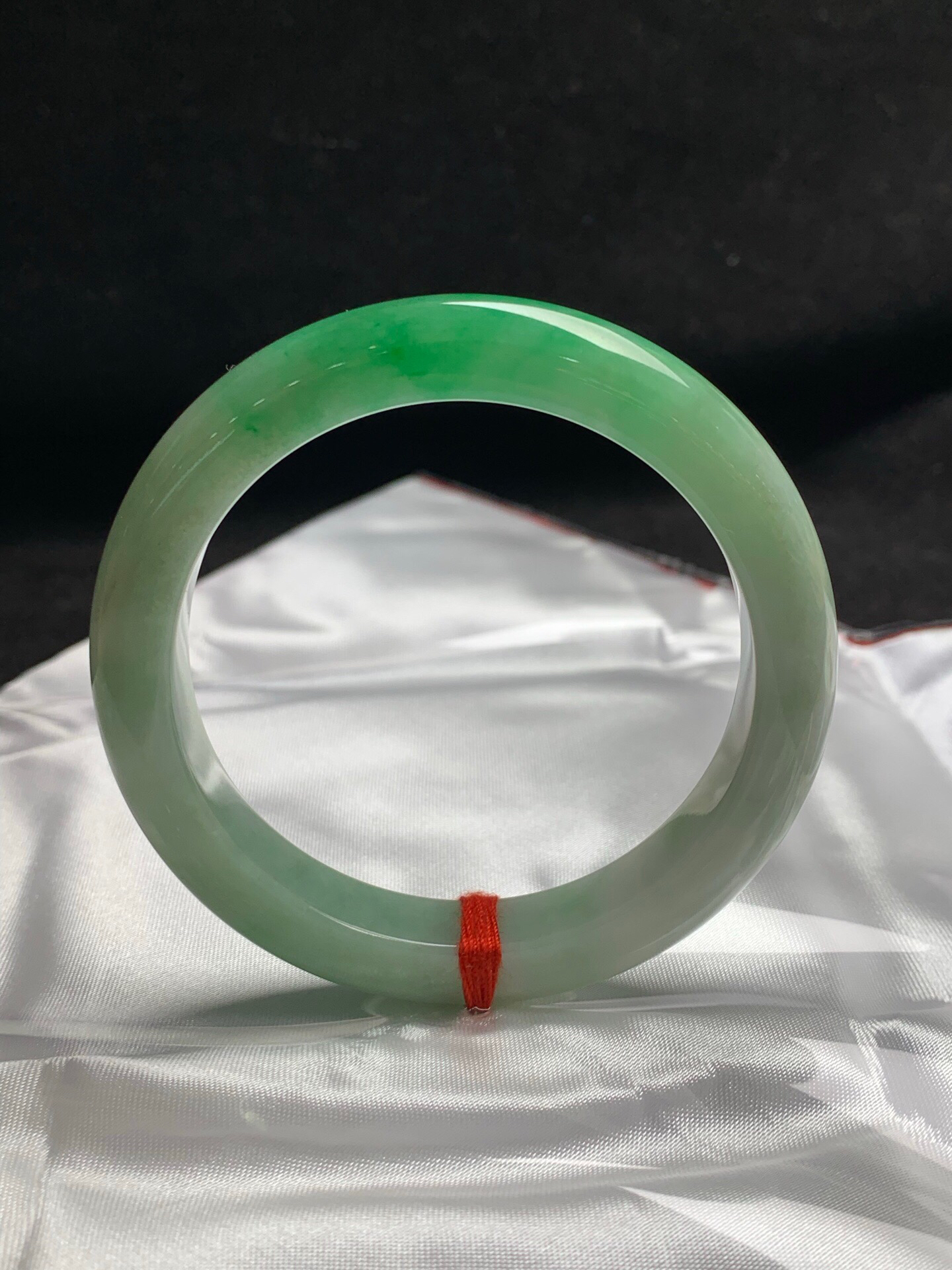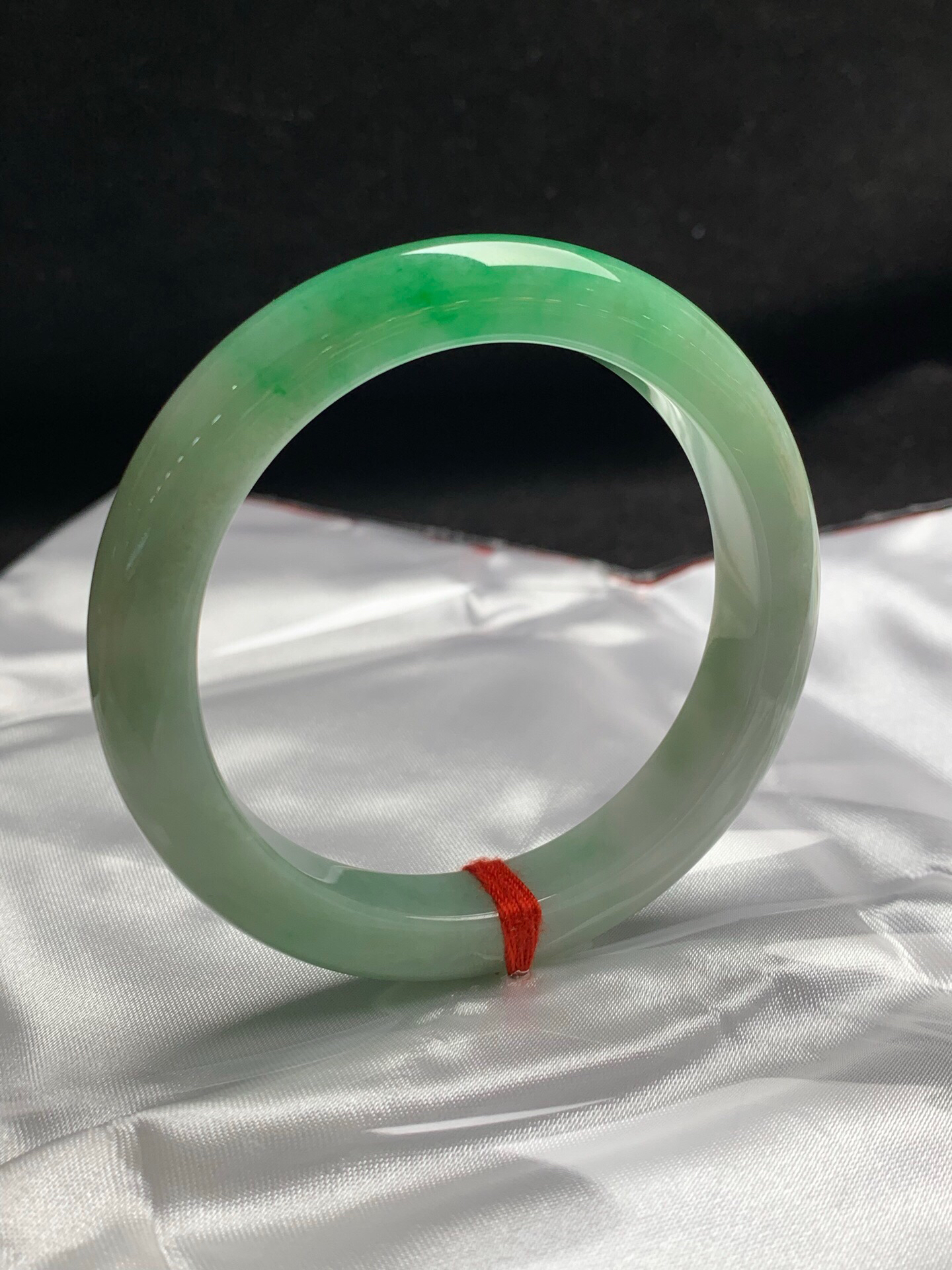 612784,53圈口,细糯飘绿正圈平安镯,细糯有水,淡底色飘阳绿,窄条
