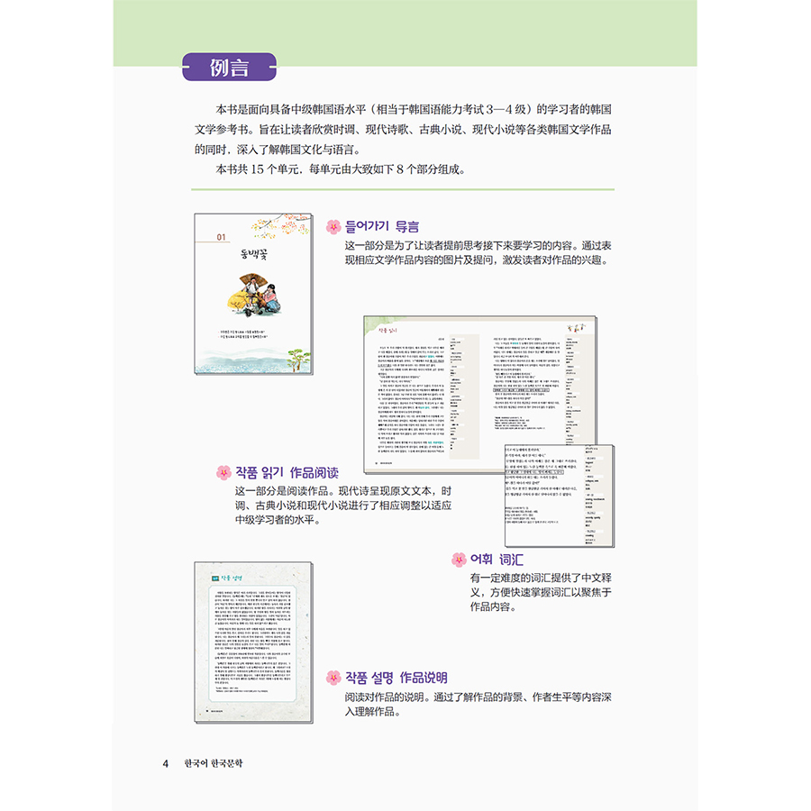 本书是面向具备中级韩国语水平(相当于韩国语能力考试3_4级)的学习者的韩国文学参考书。旨在让读者欣赏时调、现代诗歌、古典小说、现代小说等各类韩国文学作品的同时,深入了解韩国文化与语言。本书共 15 个单元,每单元由大致如下8个部分组成。