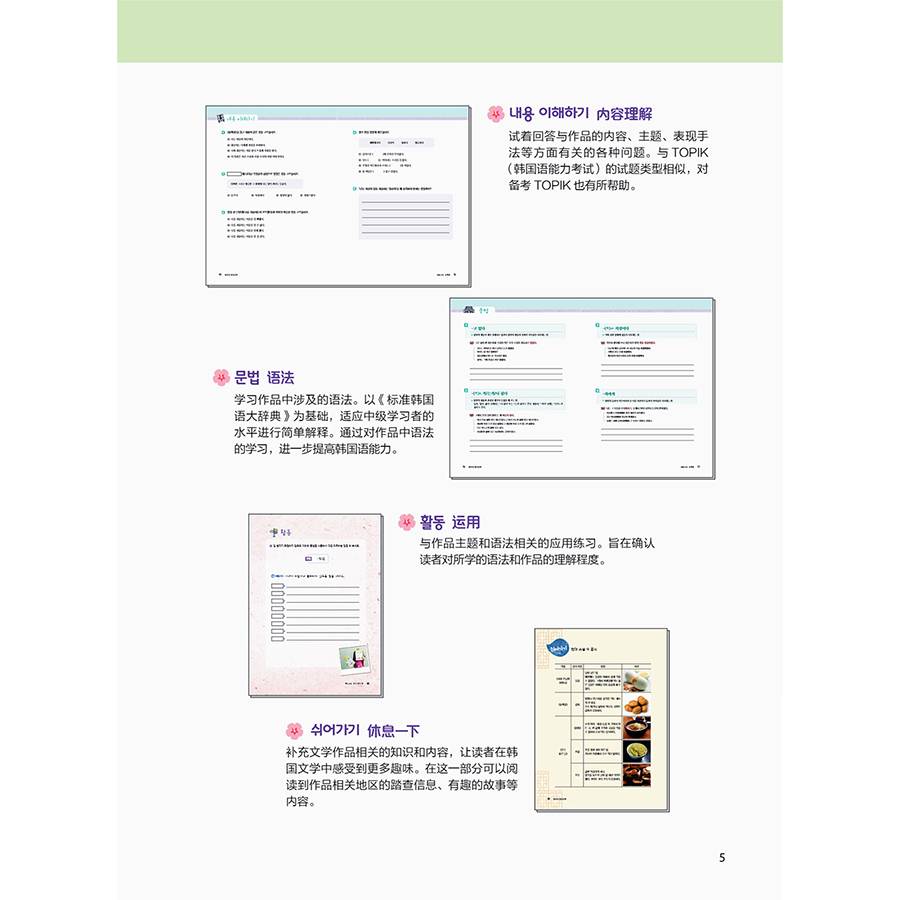 本书为针对韩国语能力达到中级(能力考试3_4级)水平的韩国语学习者而编写的韩国文学学习书。通过阅读时调(朝鲜古代诗歌形式之一),现代诗,古典小说,现代小说等类型的韩国经典文学作品,深入理解和学习韩国文化及韩国语。全书收录了各类16篇作品分为15个单元,每个单元设立了入门提示,阅读作品,词汇,作品说明,练习题,语法学习,作文等环节。