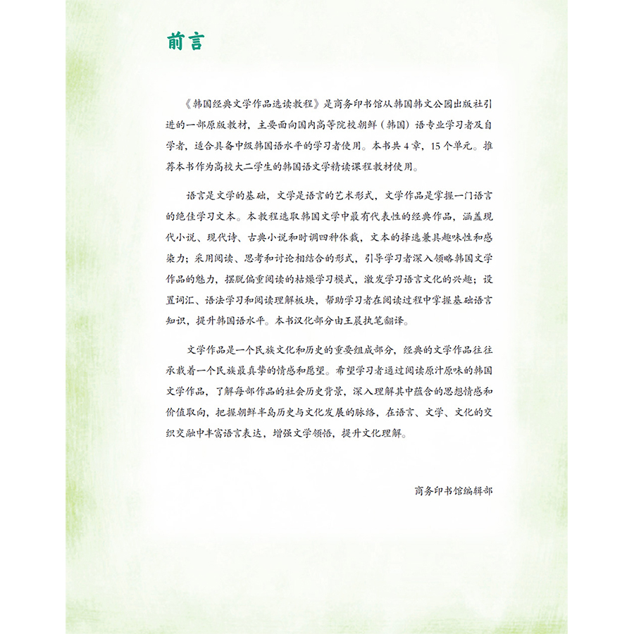 《韩国经典文学作品选读教程》是商务印书馆从韩国韩文公园出版社引进的一部原版教材,主要面向国内高等院校朝鲜(韩国)语专业学习者及自学者,适合具备中级韩国语水平的学习者使用。本书共4章,15个单元。推荐本书作为高校大二学生的韩国语文学精读课程教材使用。语言是文学的基础,文学是语言的艺术形式,文学作品是掌握一门语言的绝佳学习文本。本教程选取韩国文学中最有代表性的经典作品,涵盖现代小说、现代诗、古典小说和时调四种体裁,文本的择选兼具趣味性和感染力;采用阅读、思考和讨论相结合的形式,引导学习者深入领略韩国文学作品的魅力,摆脱偏重阅读的枯燥学习模式,激发学习语言文化的兴趣;设置词汇、语法学习和阅读理解板块,帮助学习者在阅读过程中掌握基础语言知识,提升韩国语水平。本书汉化部分由王晨执笔翻译。文学作品是一个民族文化和历史的重要组成部分,经典的文学作品往往承载着一个民族最真挚的情感和愿望。希望学习者通过阅读原汁原味的韩国文学作品,了解每部作品的社会历史背景,深入理解其中蕴含的思想情感和价值取向,把握朝鲜半岛历史与文化发展的脉络,在语言、文学、文化的交织交融中丰富语言表达,增强文学领悟,提升文化理解。
