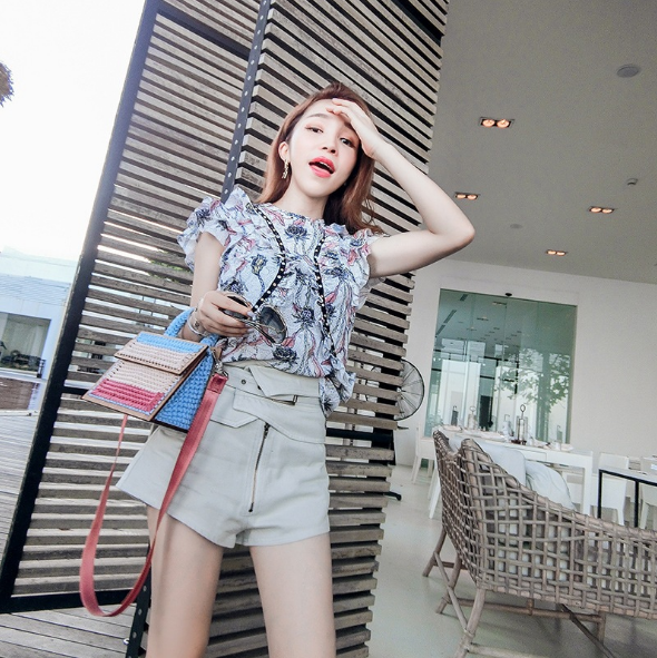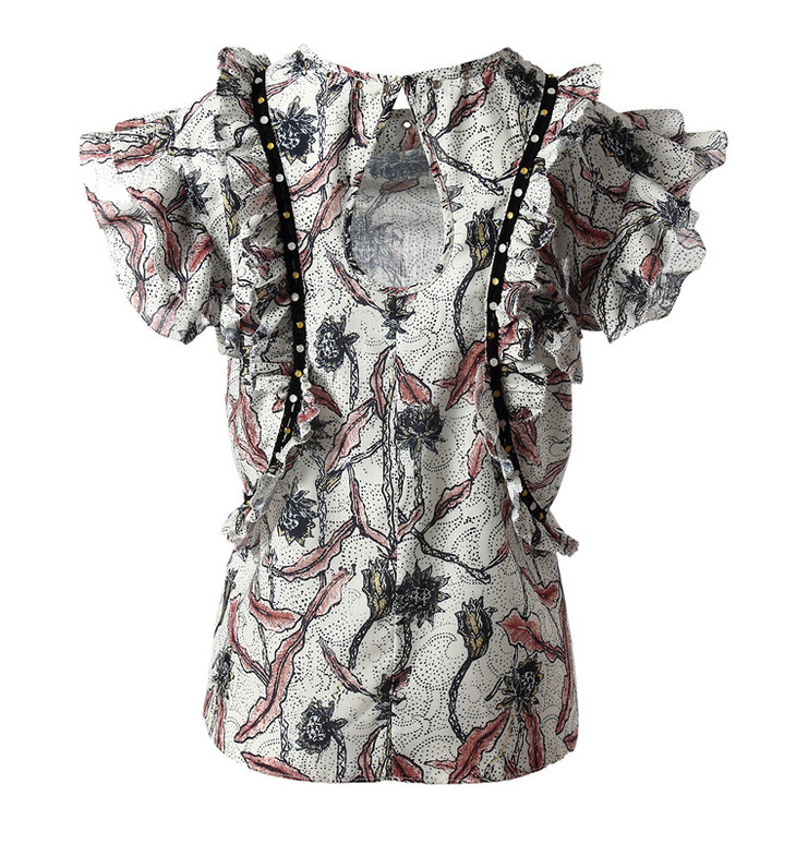 【服饰】。海报款 纯棉质铆钉装饰荷叶边印花无袖背心上衣