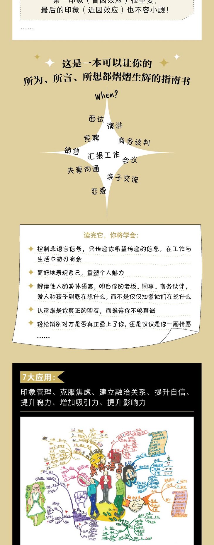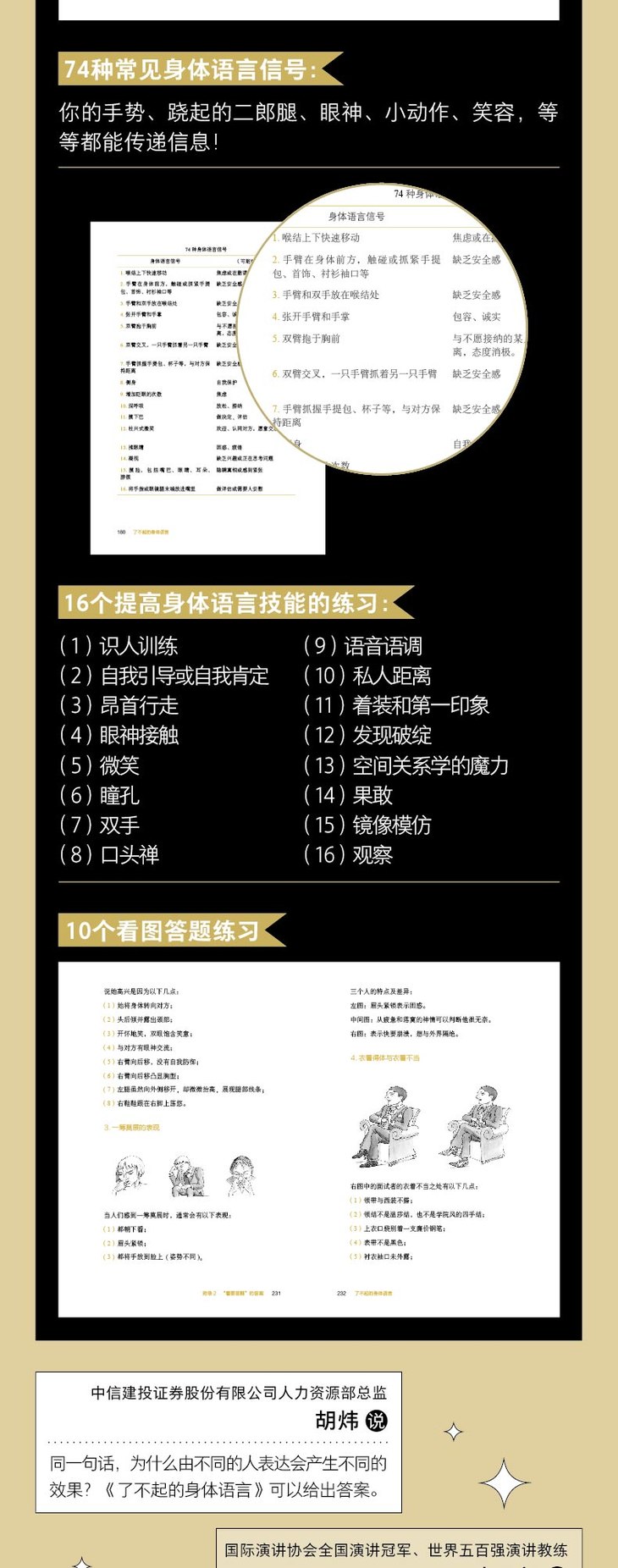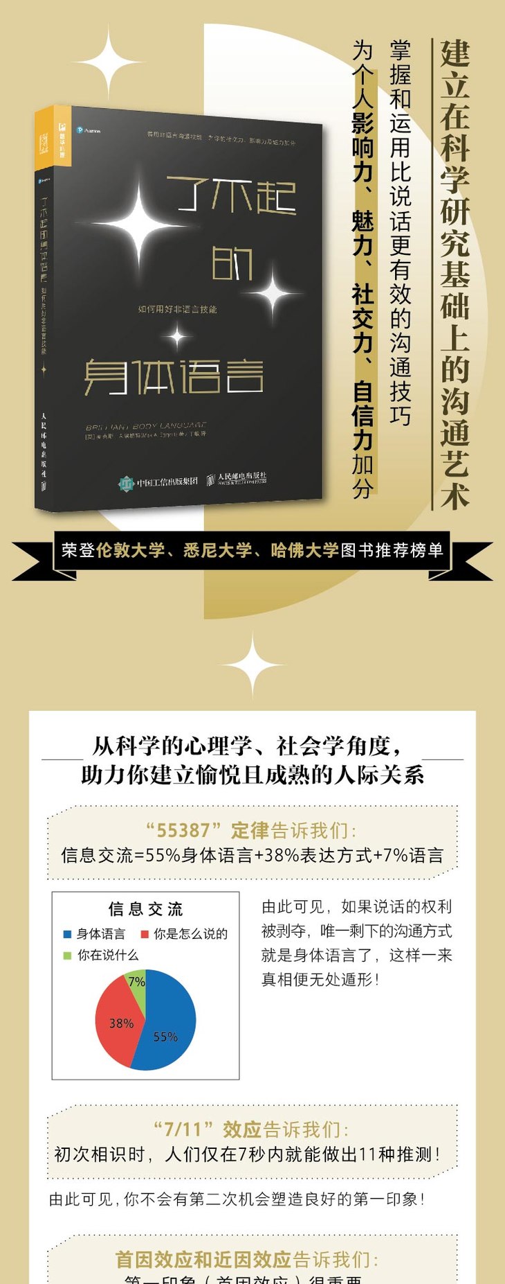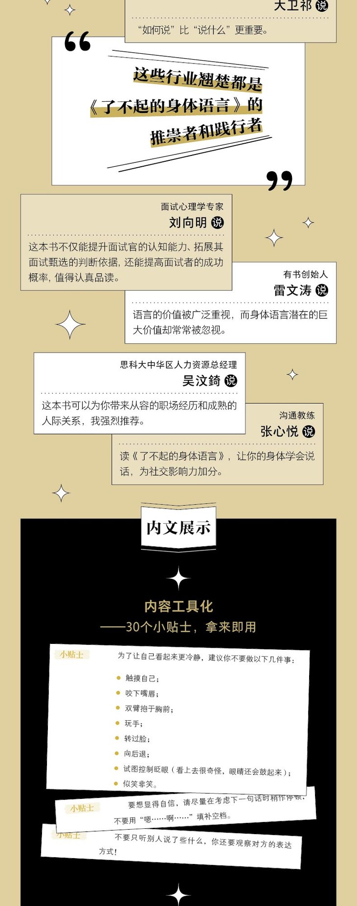 如何给他人留下良好的初印象?社交时哪些非语言沟通行为能为自己加分?如何在重要场合影响、说服他人?人以群分的真正含义是什么?能让自己更有魅力和吸引力的身体语言有哪些?如何运用身体语言克服焦虑、展现自信? 上述这些问题都涉及一门学科——身体语言心理学。人与人之间 93% 的信息交流都是通过非语言沟通进行的,管理心理学家麦克斯·A. 埃格特传授的兼具科学性和实操性的策略和技巧,能帮助读者打造融洽的人际关系、提升社交技能、给他人留下良好的印象、洞悉他人的真实想法和感受、控制焦虑并展现自信。本书提供的建议适合在职场、生活、恋爱、婚姻等所有场合运用,它们可以助力我们在实现自我提升的同时做到知己知彼。 希望每一个阅读本书的人都可以收获令人愉悦的社交经历,在人际关系中心怀善意地把控局面。