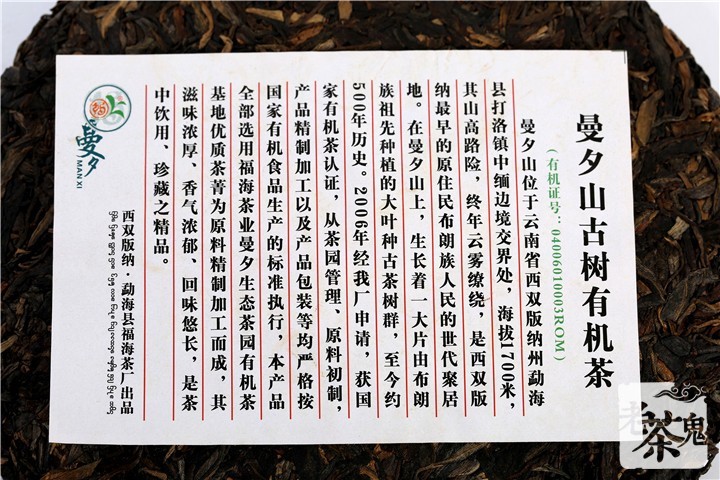 原料来自福海茶厂曼夕山生态茶园有机茶基地,以当年春季的优质古树茶菁精制而成。