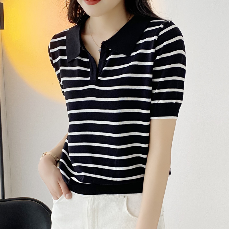 【绒叶依品 春夏慵懒条纹POLO针织衫】3色可选,可穿春夏秋三个季节,简约高级感,气质休闲,V领设计显颈部长,单穿有型,春秋叠穿有范!
