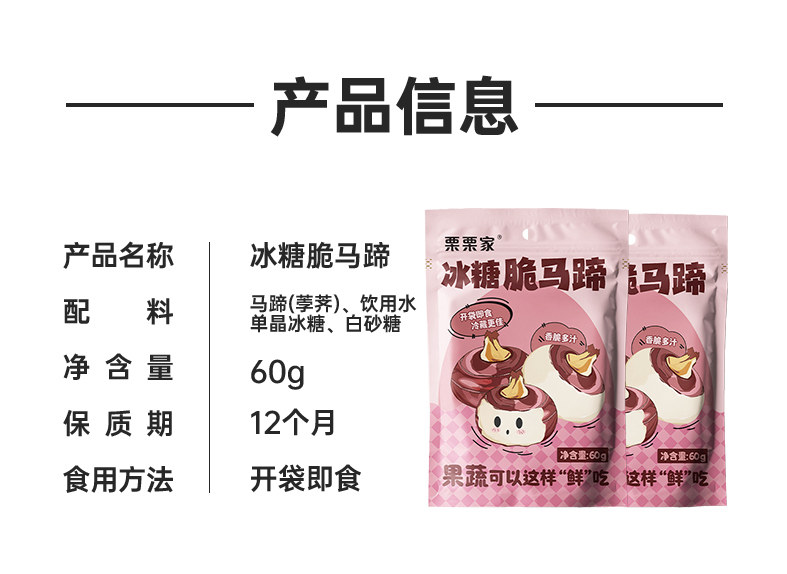 【品名】栗栗家 冰糖脆马蹄 颗粒饱满 爽脆可口 60g*10袋 【规格】60g*10袋 【产地】国内 【保质期】12个月 【发货包装】独立包装 【发货地】唐山 【发货快递】圆通 【不发货区域】新疆、西藏、港澳台 【补邮费地区】内蒙古、云南、海南、青海+10元/单 【发货时效】48-72小时,周末节假日顺延 |