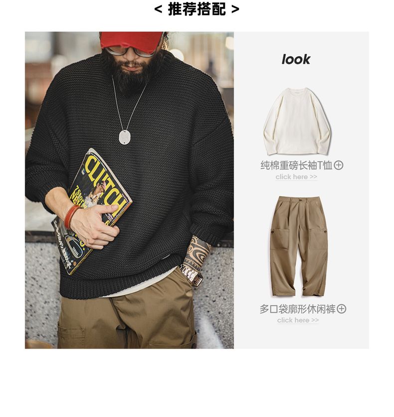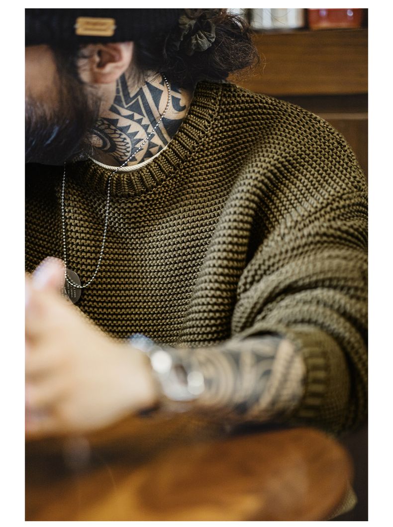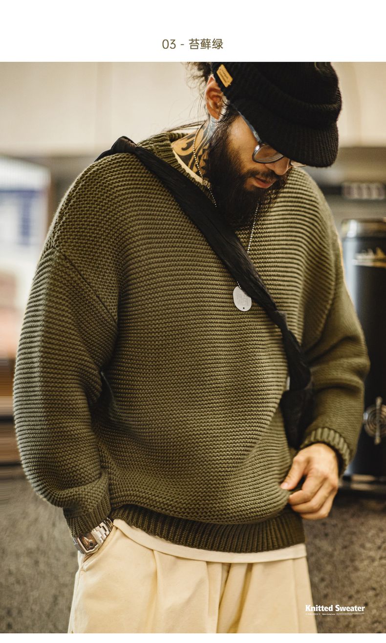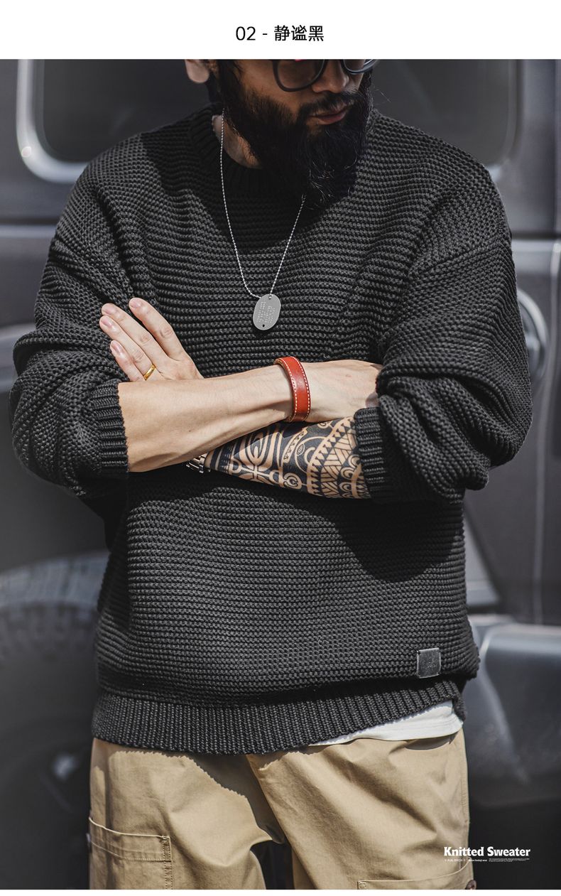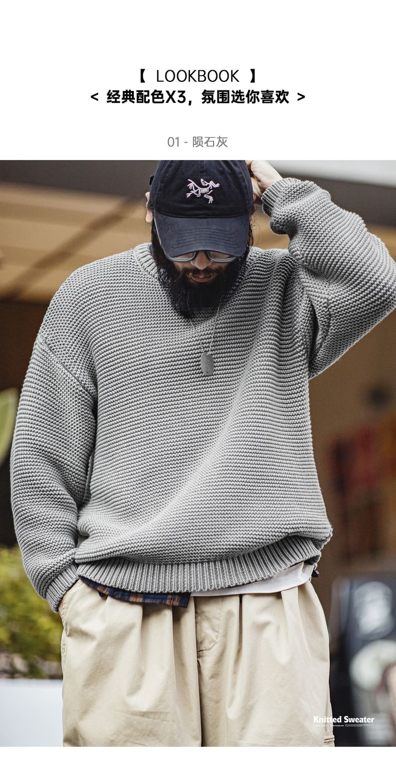 工装优选美式复古重磅肌理针织毛衣宽松落肩圆领套头打底衫男秋冬