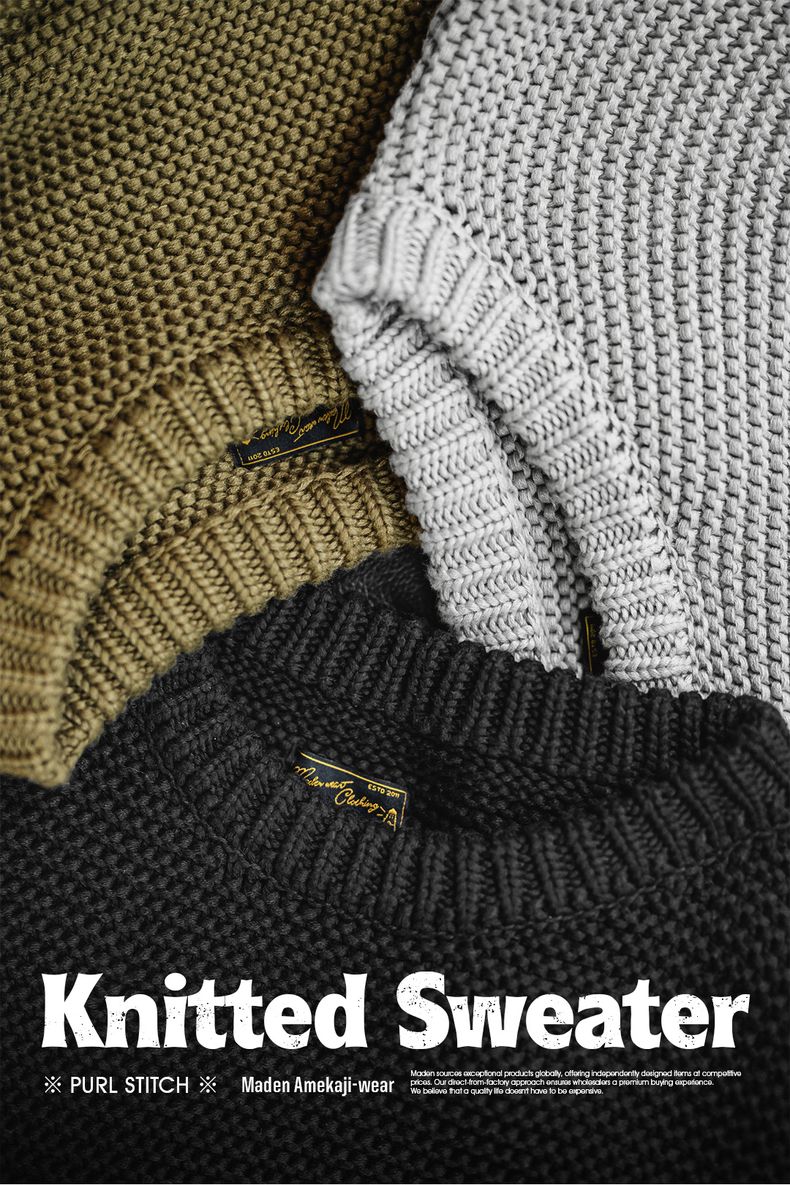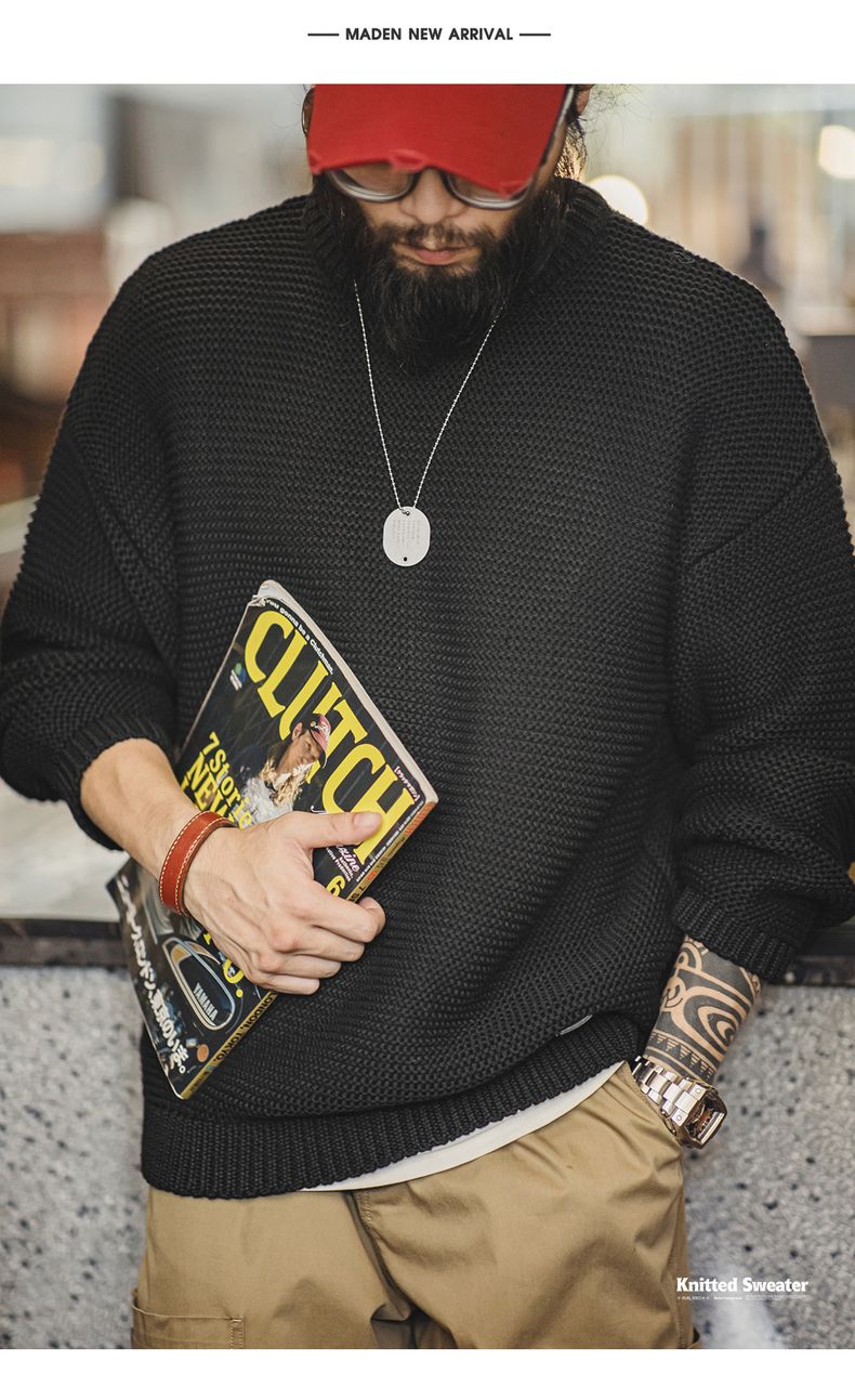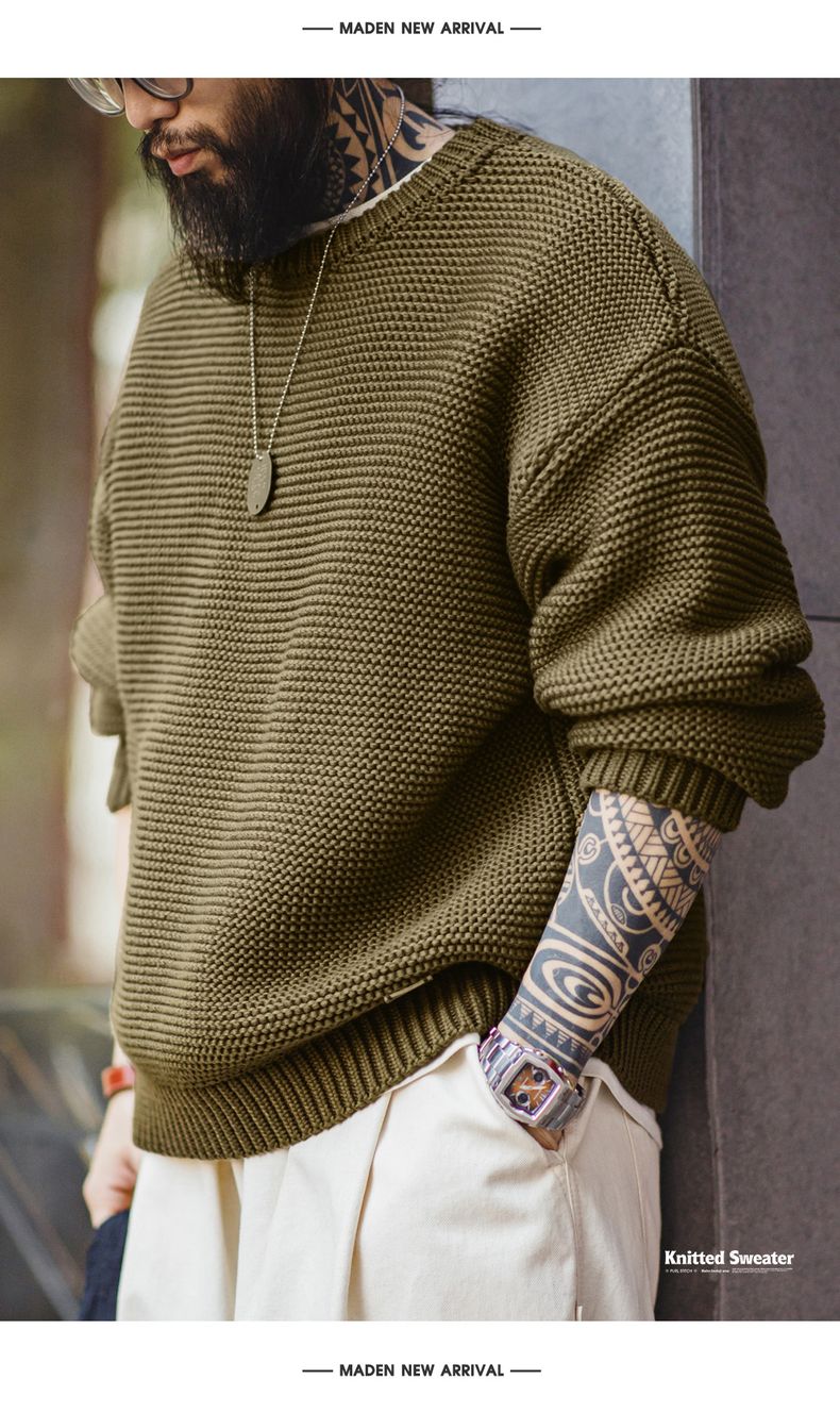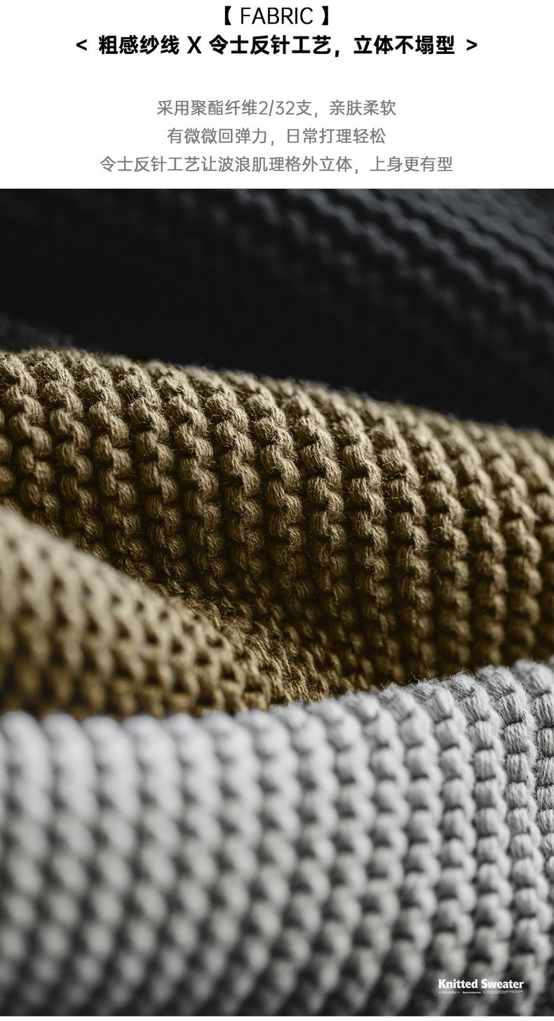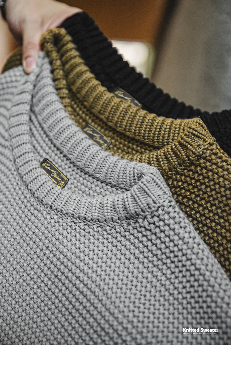 工装优选美式复古重磅肌理针织毛衣宽松落肩圆领套头打底衫男秋冬