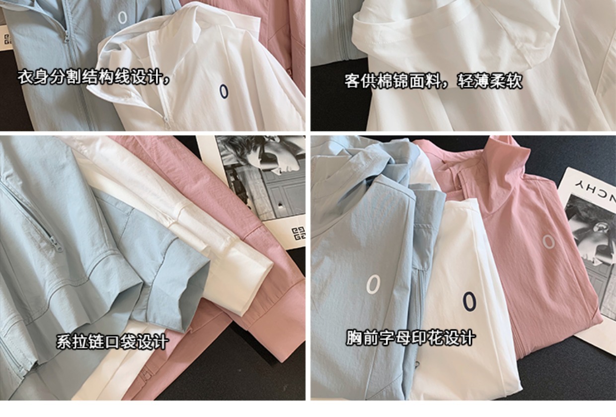 立领连帽设计,全方位防晒,再也不怕晒黑了,胸前字母印花设计,丰富穿搭层次衣身分割结构线设计,整体版型大小适中,两侧定染同色系拉链口袋设计,日常放个手机、贵重物品啥的都很有安全感。