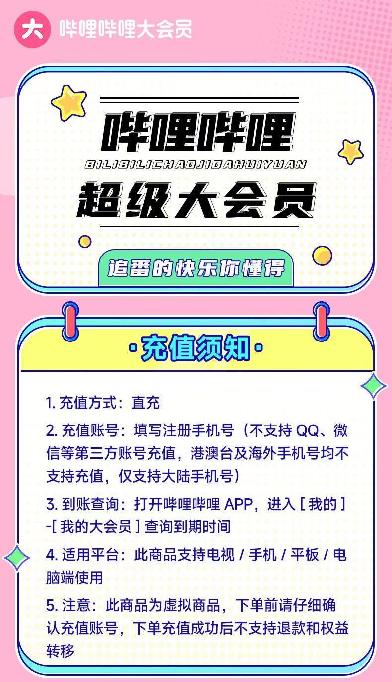 购买须知: ★ 下单前请您务必仔细阅读产品中各项说明,然后在下单订购 ★ 下单购买后,则视为您已仔细阅读本产品中的各项说明,并认同此声明以及产品规则,否则责任自负,不在售后服务之内 产品说明: 支持端口:手机、Pad、电脑、不支持电视端 充值账号:请填写哔哩哔哩登录绑定的手机号,不支持在备注填写充值号码,仅支持下单默认的充值手机号,请不要填错 充值时间:本产品为直充,下单后10-60分钟内到账,急单勿拍 到账核实:下单后1小时内未到账,请先登录账号查看,如确实未到账,请及时联系客服 注意事项: 顾客下单后自动充值,发货状态并不会立刻变成已发货,已经充值成功无法退换 虚拟充值产品不适用于七日无理由退货条款,一经购买,不退不改 |
