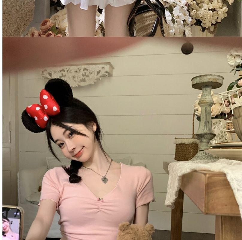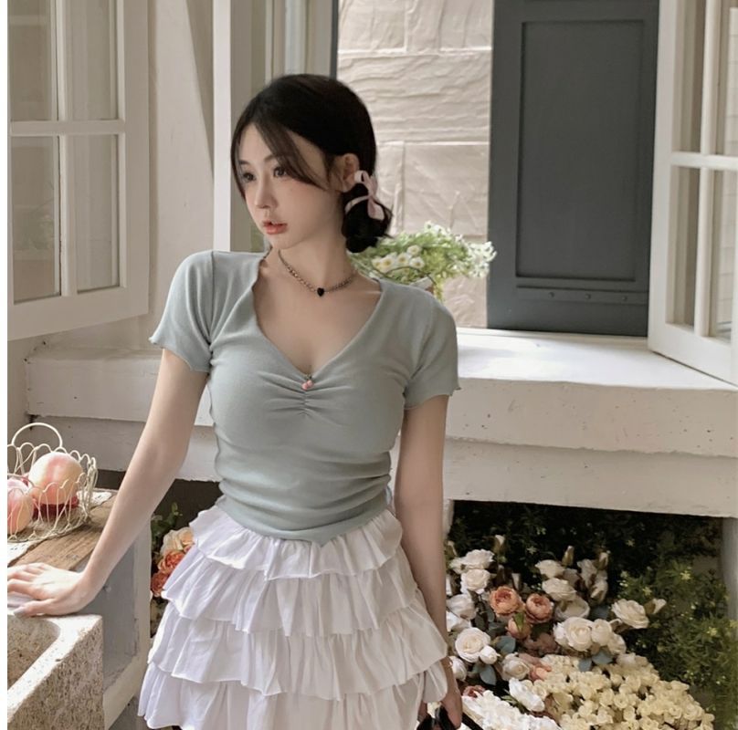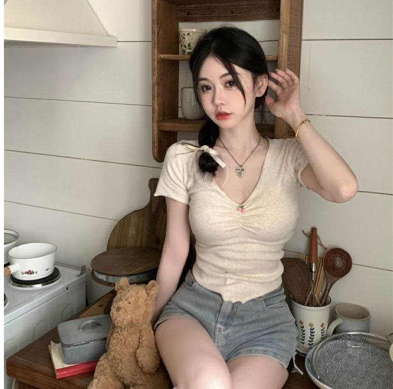 【大V领展露迷人锁骨❗️泰式V领T恤】又a又飒小性感,百搭时尚修身显瘦,胖mm必备,冷淡系T恤女内搭短款短袖L
