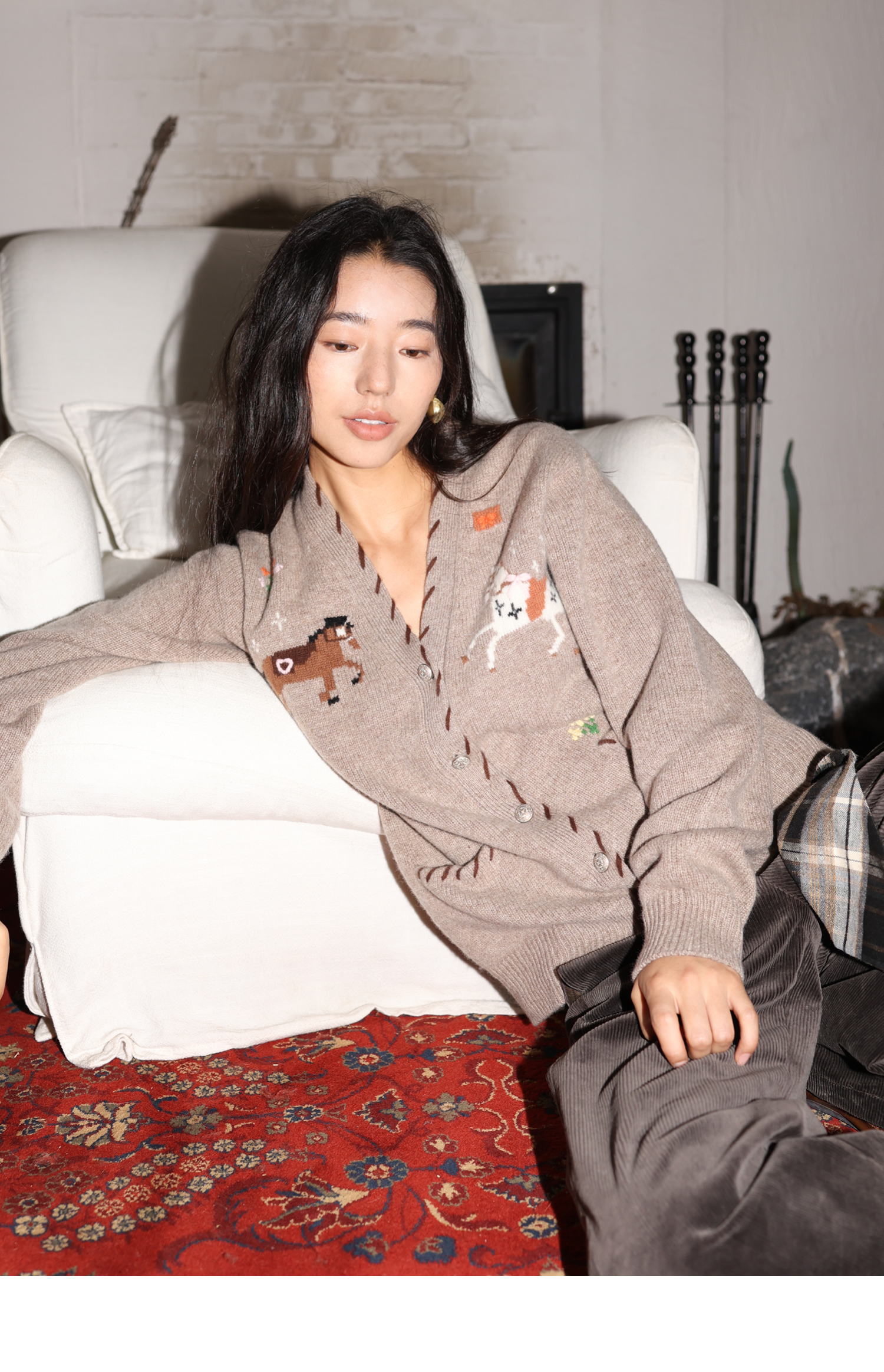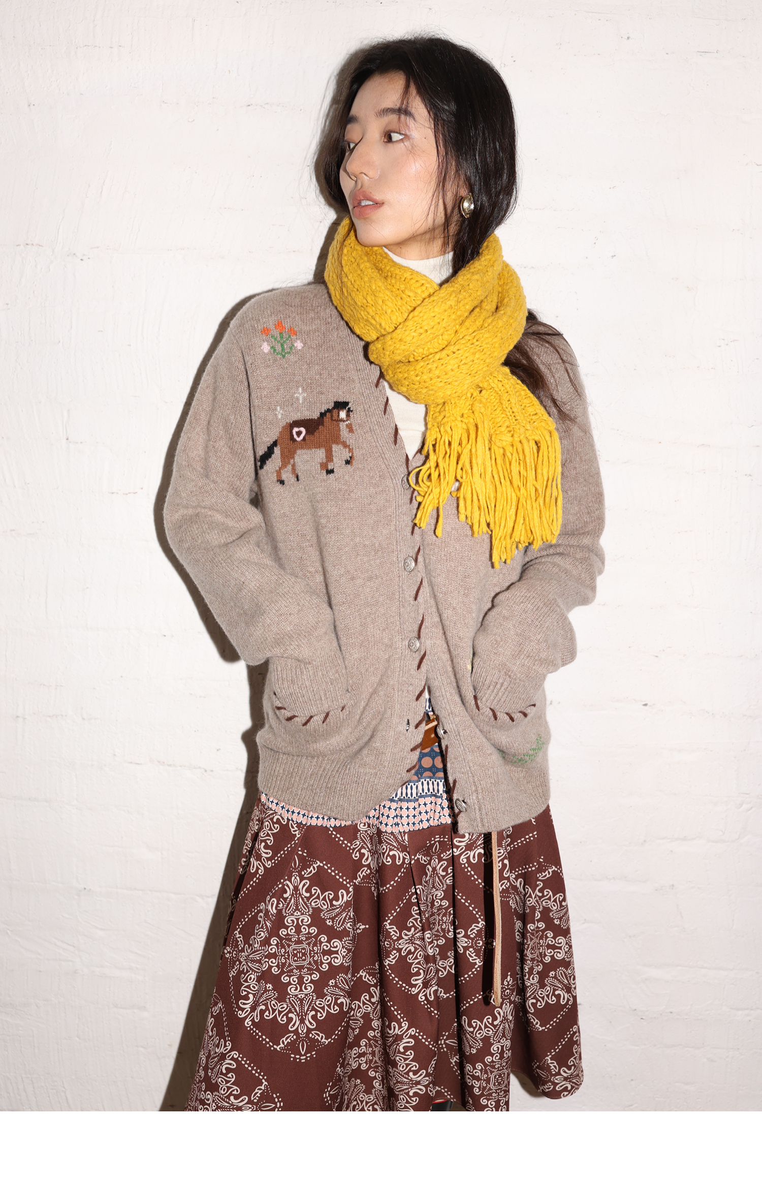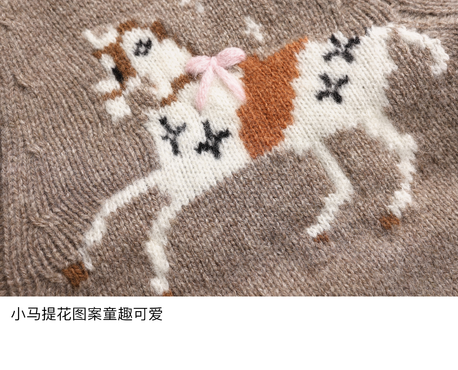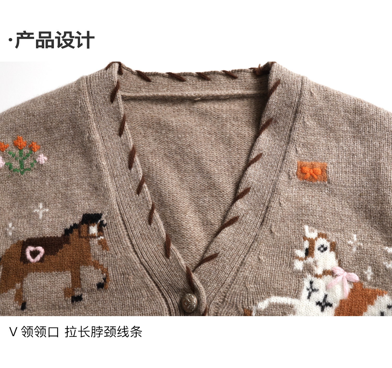 素舶 澳洲美利奴羊毛手工绣花氛围感小马V领提花针织开衫