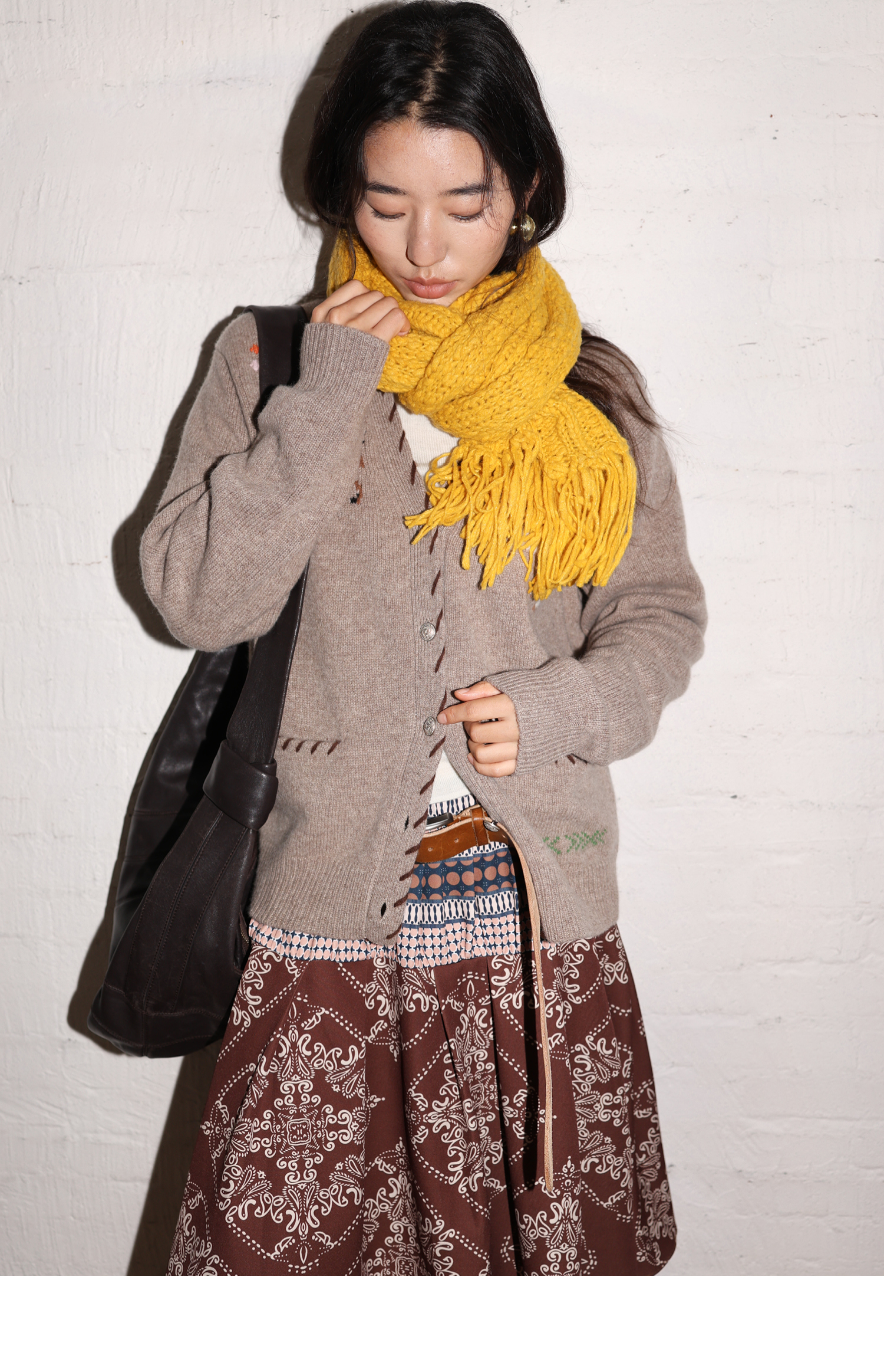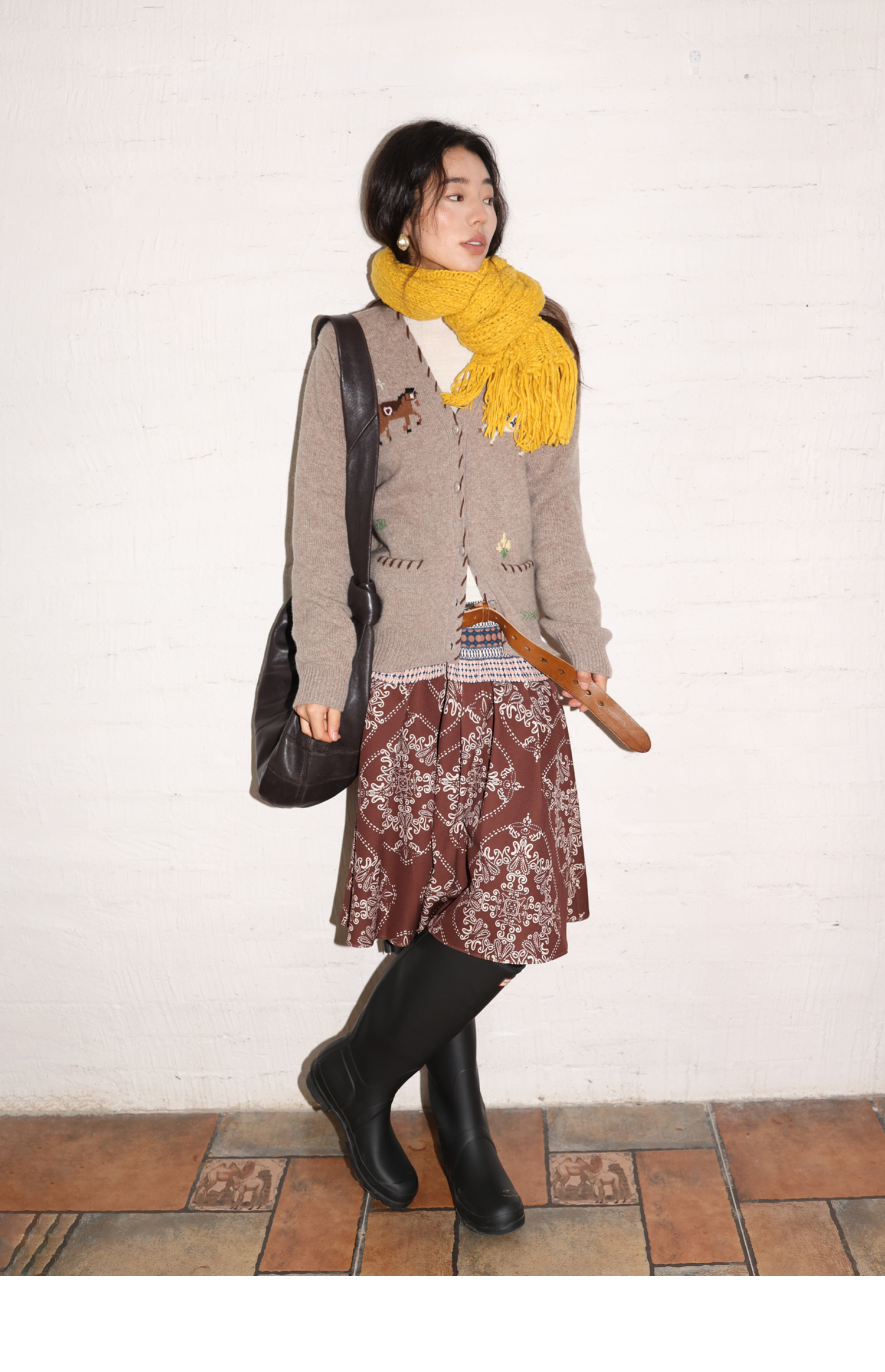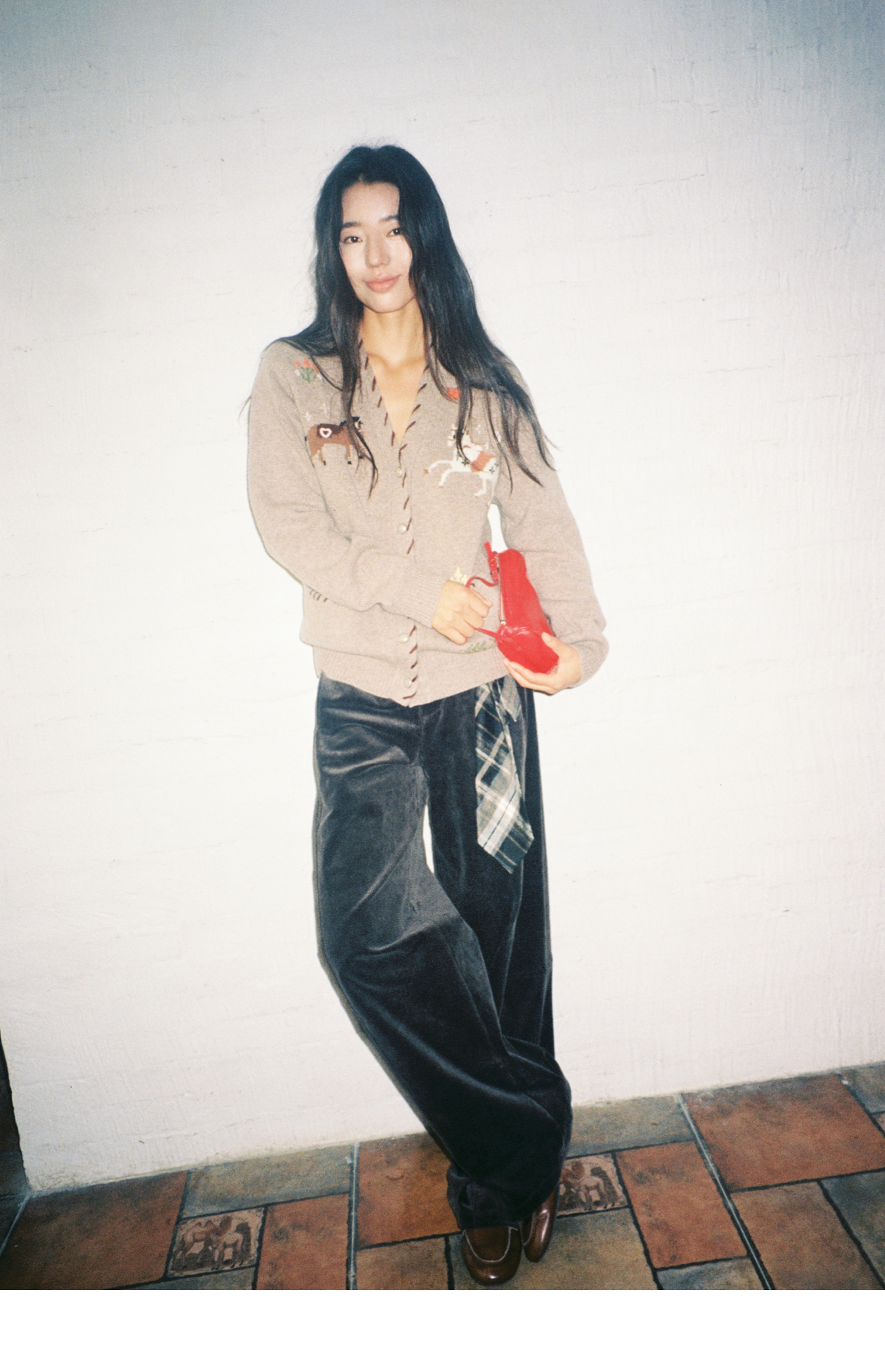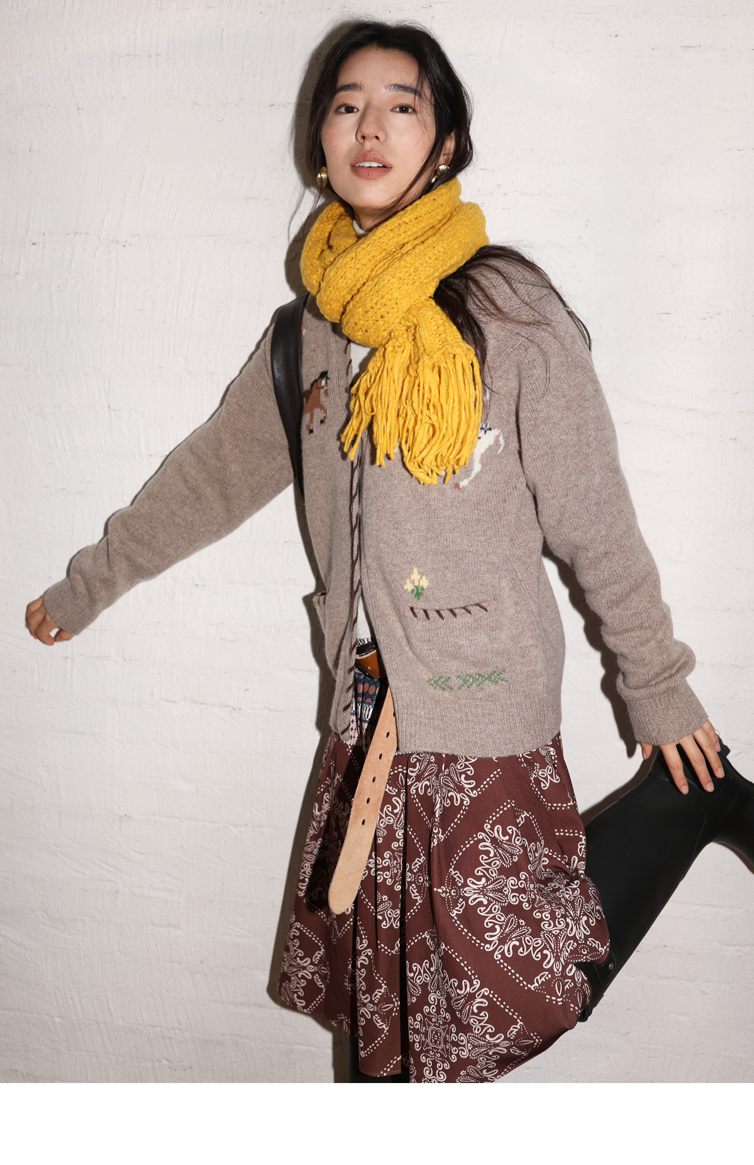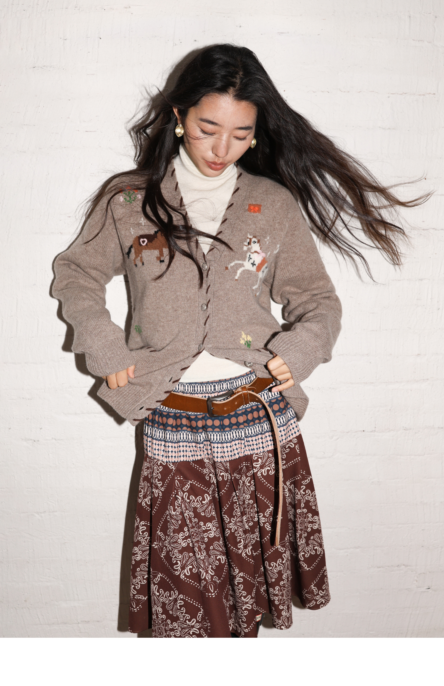 素舶 澳洲美利奴羊毛手工绣花氛围感小马V领提花针织开衫