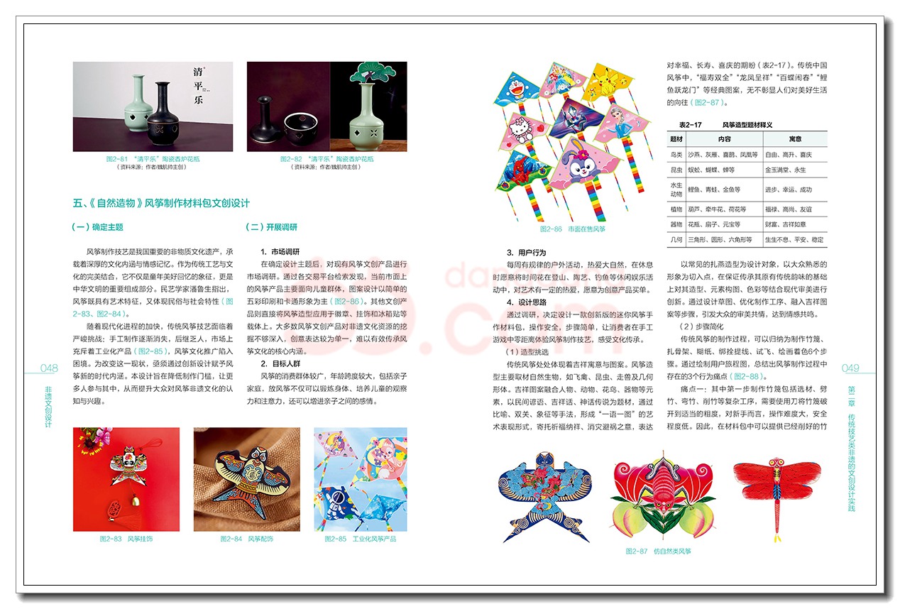 第二章 传统技艺类非遗的文创设计实践016 一、传统技艺类非遗概述016 (一)传统技艺类非遗的概念016 (二)传统技艺类非遗的特征016 (三)传统技艺类非遗的价值017 (四)传统技艺类非遗保护与传承的现状与困境017 (五)传统技艺类非遗文创设计的实例019 二、;知布知竹非遗文创品牌设计实践019 (一)确定主题019 (二)前期调研020 (三)文化基因提取026 (四)设计实践033 三、苗族蜡染技艺体验设计实践033 (一)确定主题034 (二)前期调研034 (三)传统蜡染文化基因提取036 (四)基于Kano模型的蜡染技艺体验设计实践042 (五)效果展示042 四、清平乐陶瓷香炉花瓶文创设计实践042 (一)确定主题042 (二)前期调研042 (三)文化基因提取045 (四)设计思路046 (五)设计实践047 (六)效果展示048 五、《自然造物》风筝制作材料包文创设计048 (一)确定主题048 (二)开展调研050 (三)方案推演051 (四)成品展示052 六、知织宋锦制造工艺儿童拼装玩具设计052 (一)确定主题052 (二)开展调研053 (三)设计思路054 (四)方案推演055 (五)效果展示056 习题