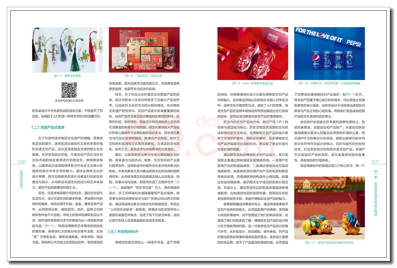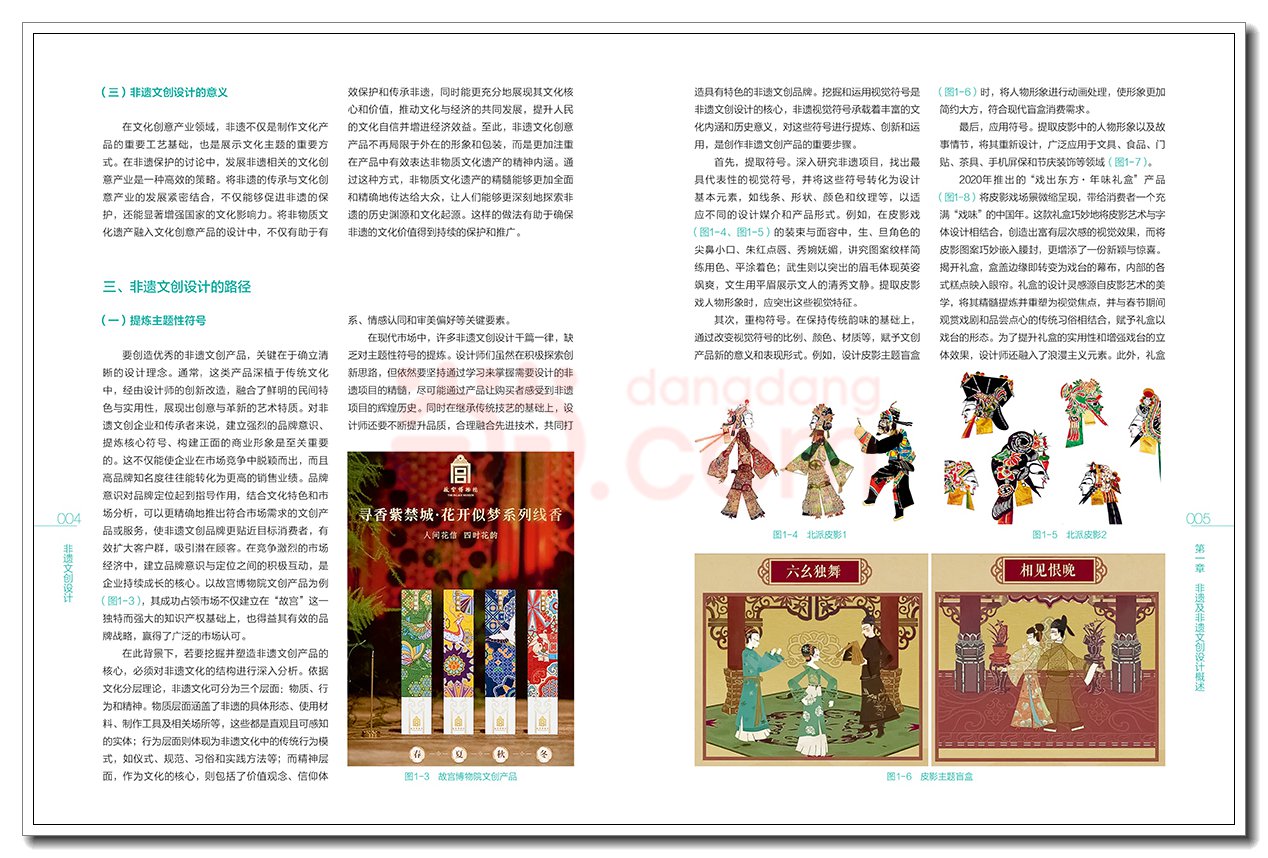 第一章 非遗及非遗文创设计概述001 一、非物质文化遗产概述001 (一)非物质文化遗产的概念001 (二)基于我国非物质文化遗产保护的思考002 (三)非物质文化遗产的当代价值002 二、非遗文创设计概述002 (一)文创设计的概念003 (二)非遗文创设计的现状004 (三)非遗文创设计的意义004 三、非遗文创设计的路径004 (一)提炼主题性符号006 (二)搭建产品式载体006 (三)开发情感化IP008 (四)创造参与式情境009 四、非遗文创设计的应用领域009 (一)在博物馆领域的应用011 (二)在影视领域的应用012 (三)在旅游纪念品领域的应用012 (四)在饮食领域的应用013 (五)在美妆领域的应用014 (六)在服饰领域的应用015 习题