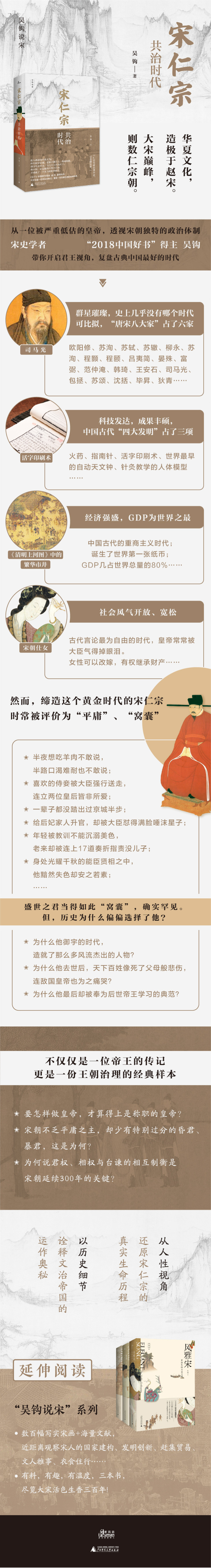 3、吴钩认为,宋仁宗开创了一个真正的君臣共治时代,真正做到皇帝与士大夫臣工各司其职,共治天下。宋朝为何取得如此高的文化、科技成就?作者认为就在于宋朝有一套较为先进的政治运作机制。在这套机制之下,皇帝负责任命政府主要的执政大臣,由执政大臣主导帝国大小事务,并设置独立的台谏系统严密监督政府人员。这套体制具有明显的分权制衡的特点,有点像英国君主立宪制的雏形,既保证了宋朝可以选举出最优秀的宰辅人才,同时又能保证臣工真的做到各司其职。而这套中古时代较为先进的政治体制的真正缔造者,乃是宋朝第四位君主宋仁宗。从这点看,他的功劳不比开国的太祖、太宗小。