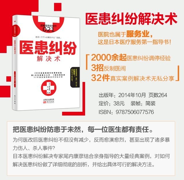 日本医患纠纷解决专家尾内康彦在其著作《医患纠纷解决术》中,结合亲身指导的大量经典案例,对如何解决医患纠纷做了详细彻底的剖析,并给出具体可行的解决方法。因其内容全面,通俗易懂,具有较强的针对性和实用性,在医疗一线的广大医务人员中引起较大的反响,出版两年中多次加印,是当之无愧的“日本医疗服务第一指导书”。