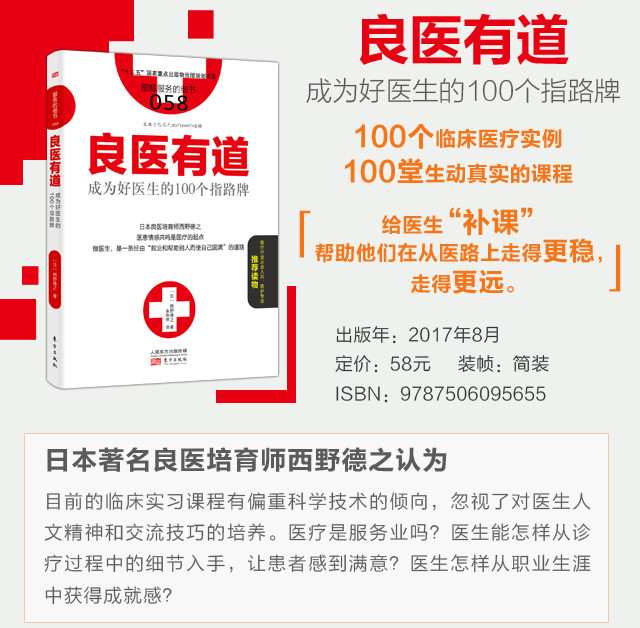 医学是一种科学,但它所包含的远远不止是科学。要培养一个好医生,在教授他们医疗技术的同时,还必须关注他们内心的成长,重塑他们的精神,坚定他们的信念,传授他们与患者相处的经验之道,帮助他们在医生这个岗位上生根发芽,壮大优秀的医疗队伍。在成为临床医生前要做好哪些准备?怎样才能在诊疗过程中尽量减少病人的痛苦?医生该如何通过帮助患者圆满自己的生命?日本著名指导医生西野德之通过100堂生动真实的课程——《良医有道:成为好医生的100个指路牌》,给了我们新的启迪。