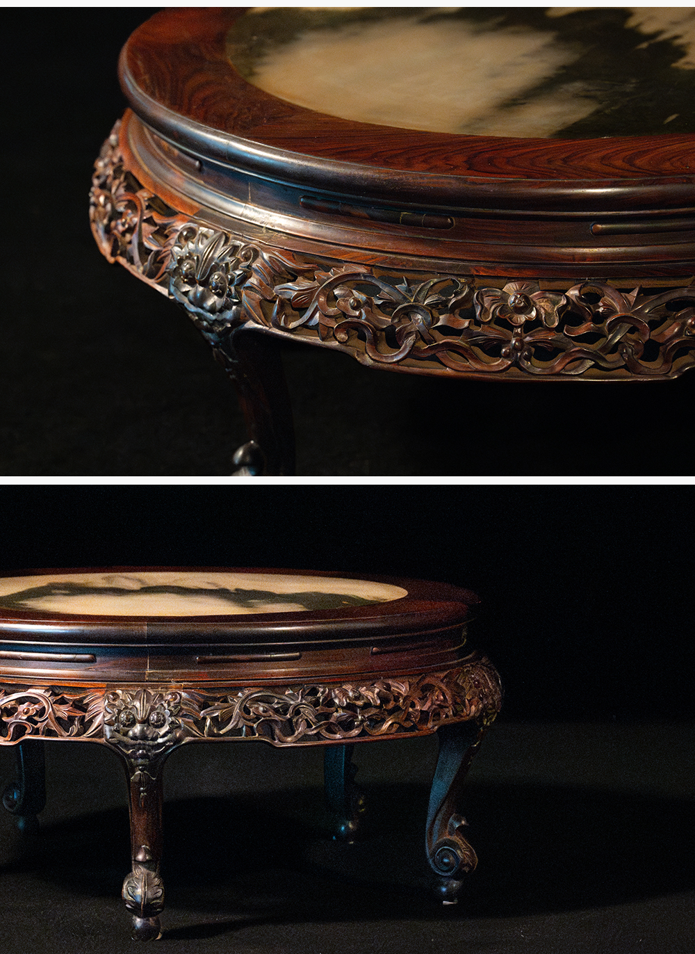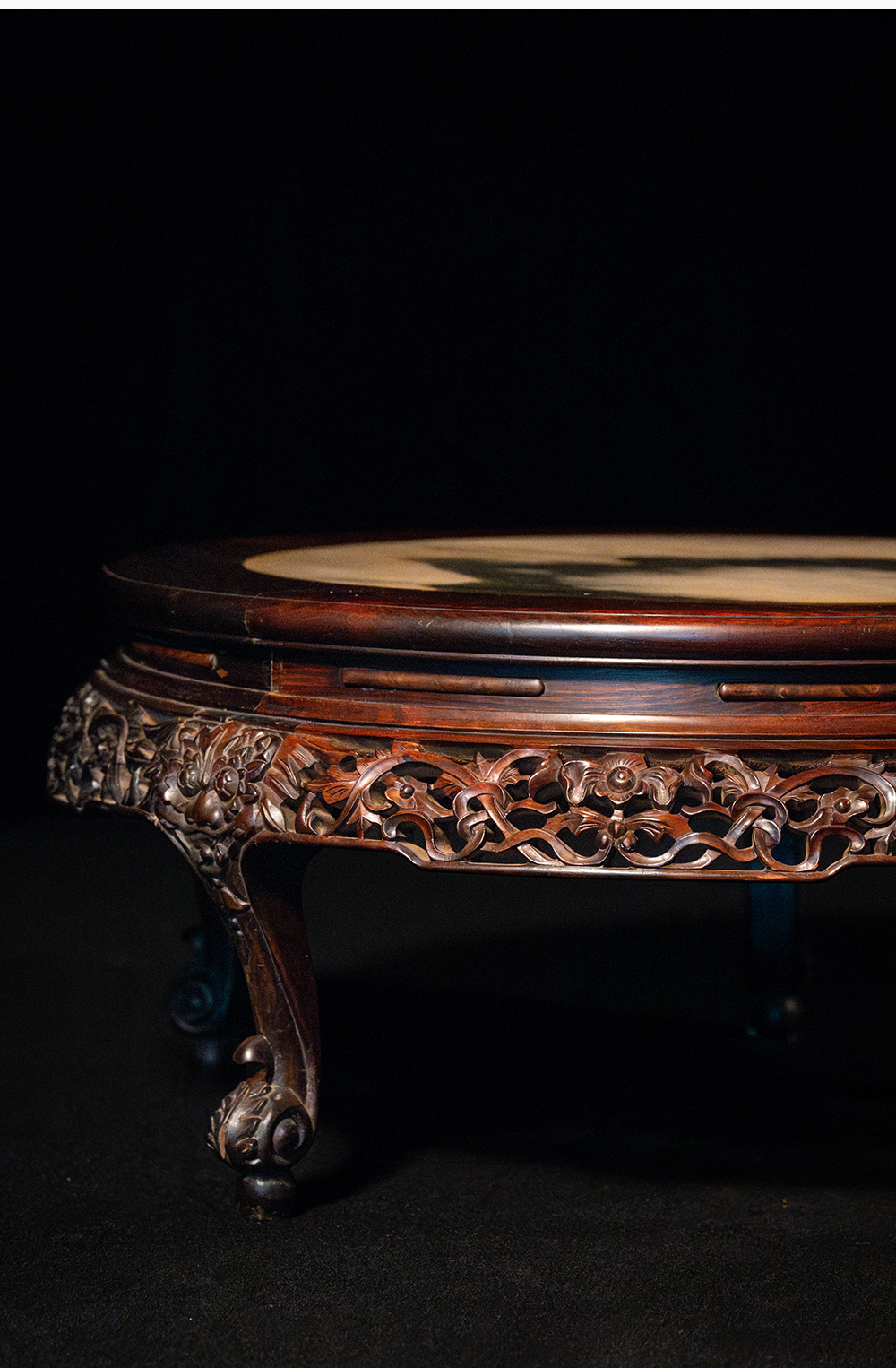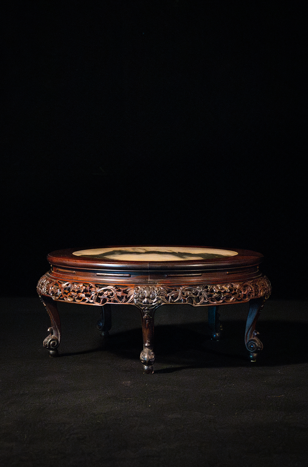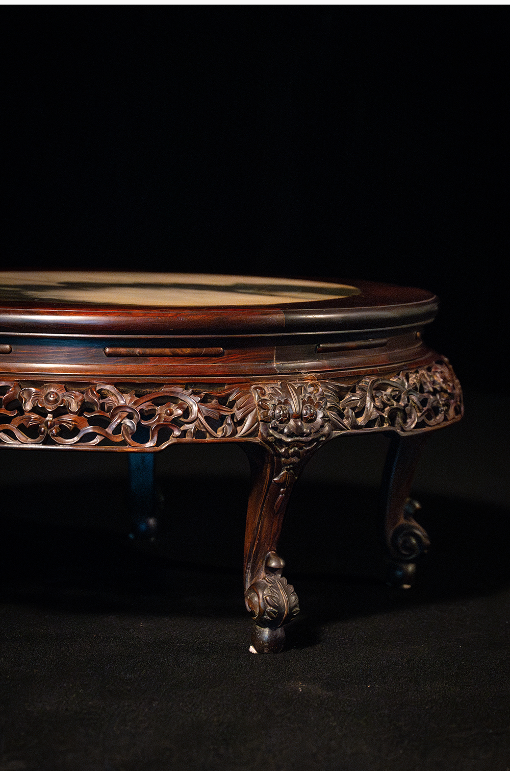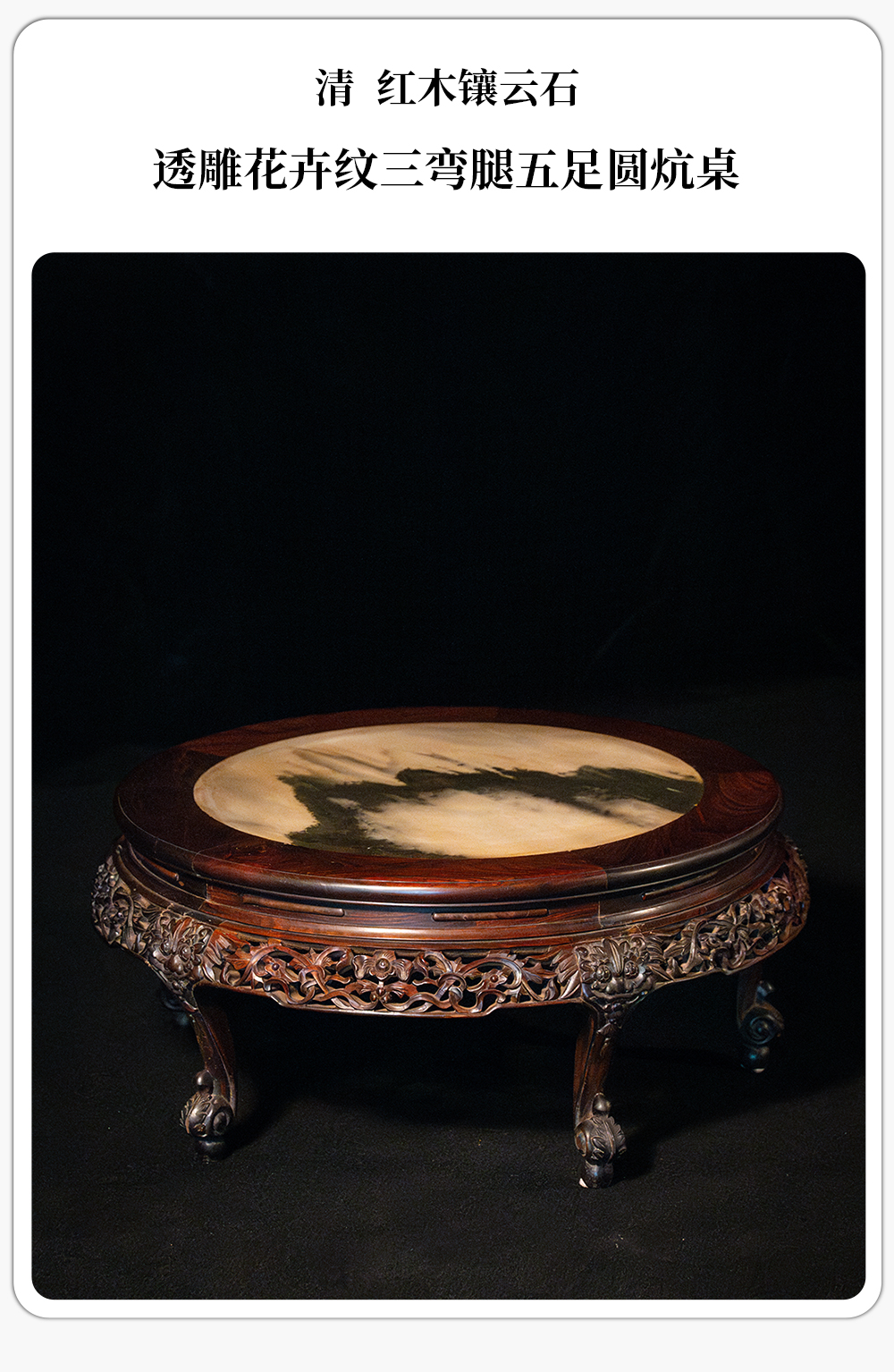 清 红木镶云石透雕花卉纹三弯腿五足圆炕桌