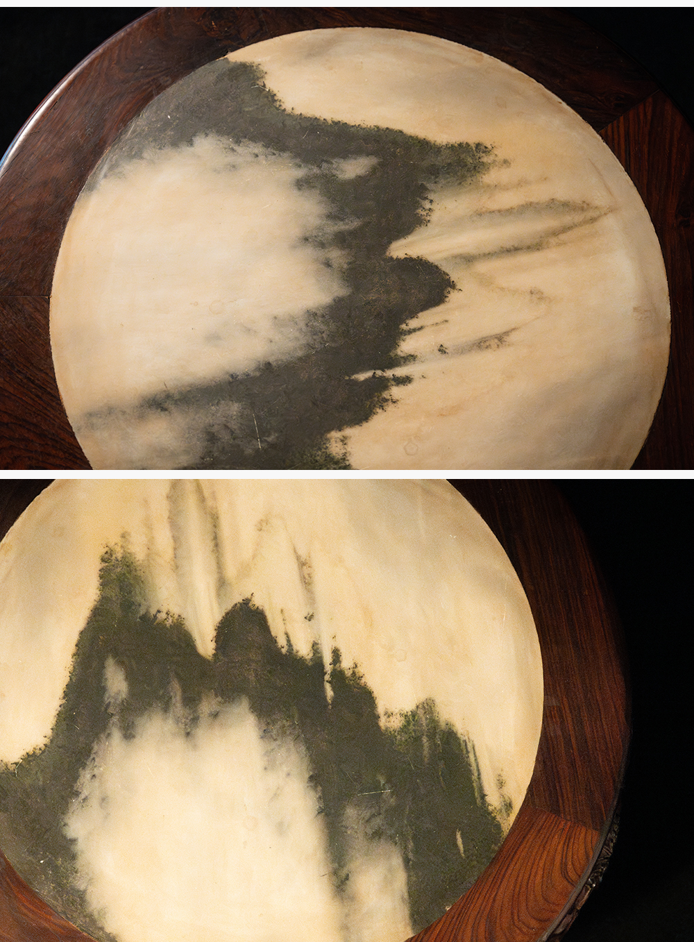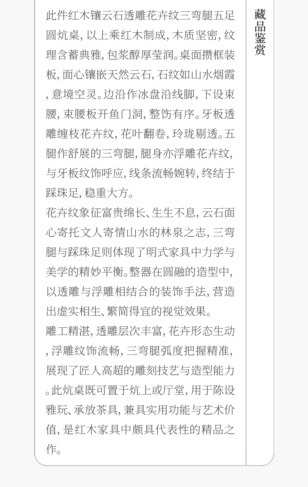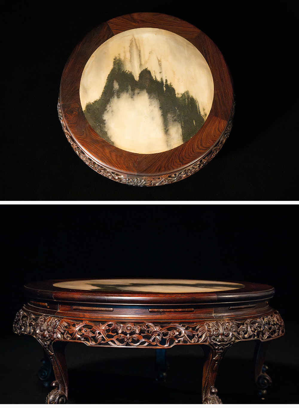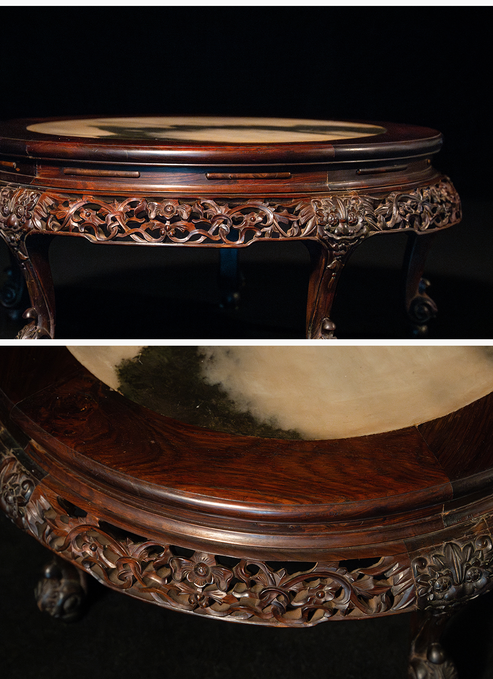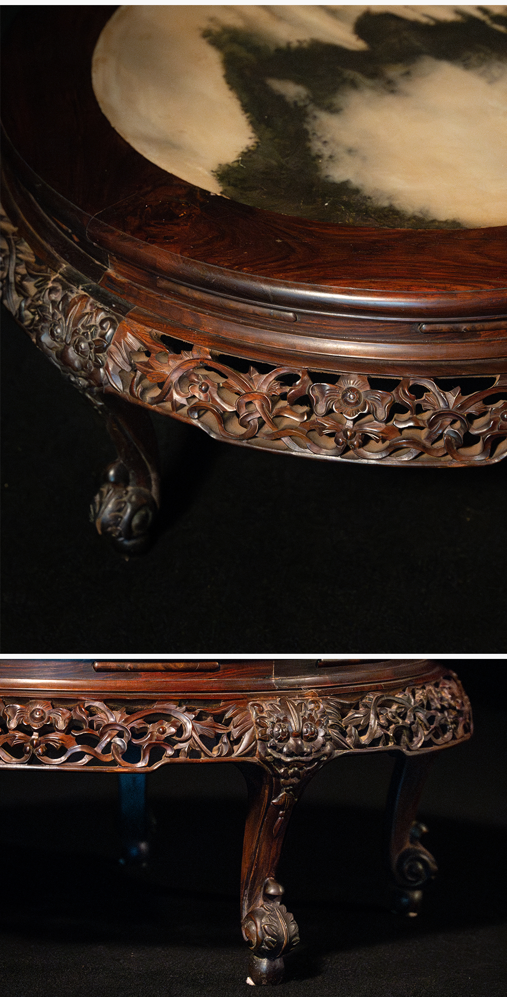 清 红木镶云石透雕花卉纹三弯腿五足圆炕桌