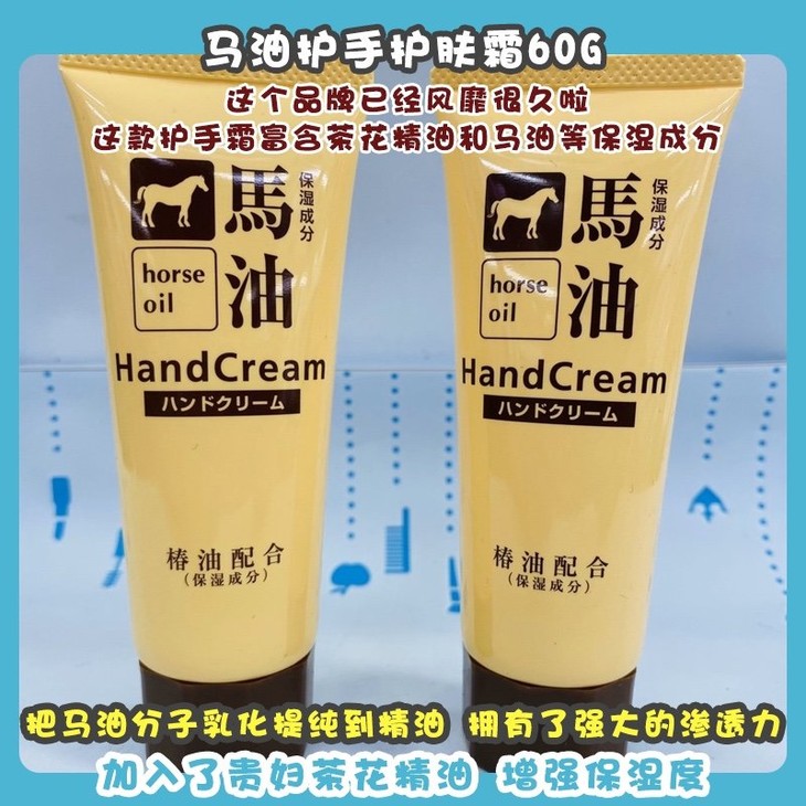 马油护手护肤霜60G 👍这个品牌已经风靡很久啦🔥,这款护手霜富含茶花精油和马油等保湿成分💦,把马油分子乳化提纯到精油💧,拥有了强大的渗透力😮,对肌肤上的微细毛孔能短时间渗透👏。加入了贵妇茶花精油,增强保湿度,涂抹较厚一层然后戴上手套睡觉💤,相当于做了个几百元一次的手部护理哦🉑~