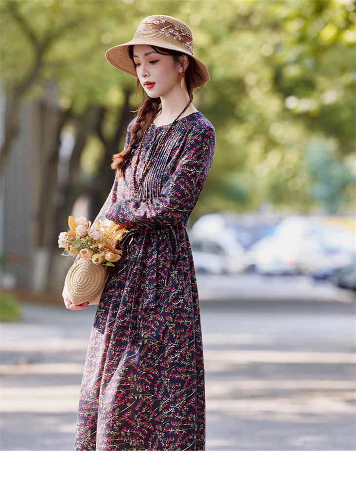 气质遮肚子减龄棉麻,复古裙子长袖碎花连衣裙HR-SYY2657