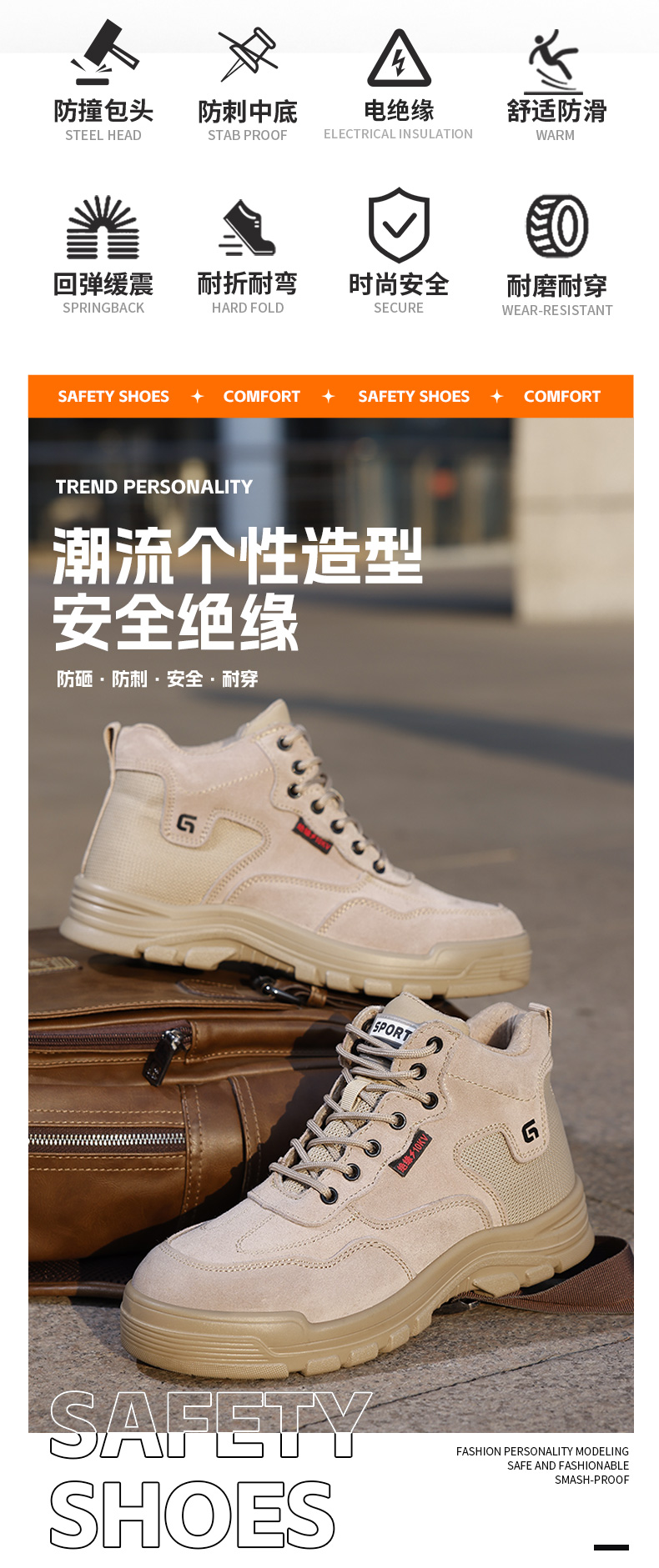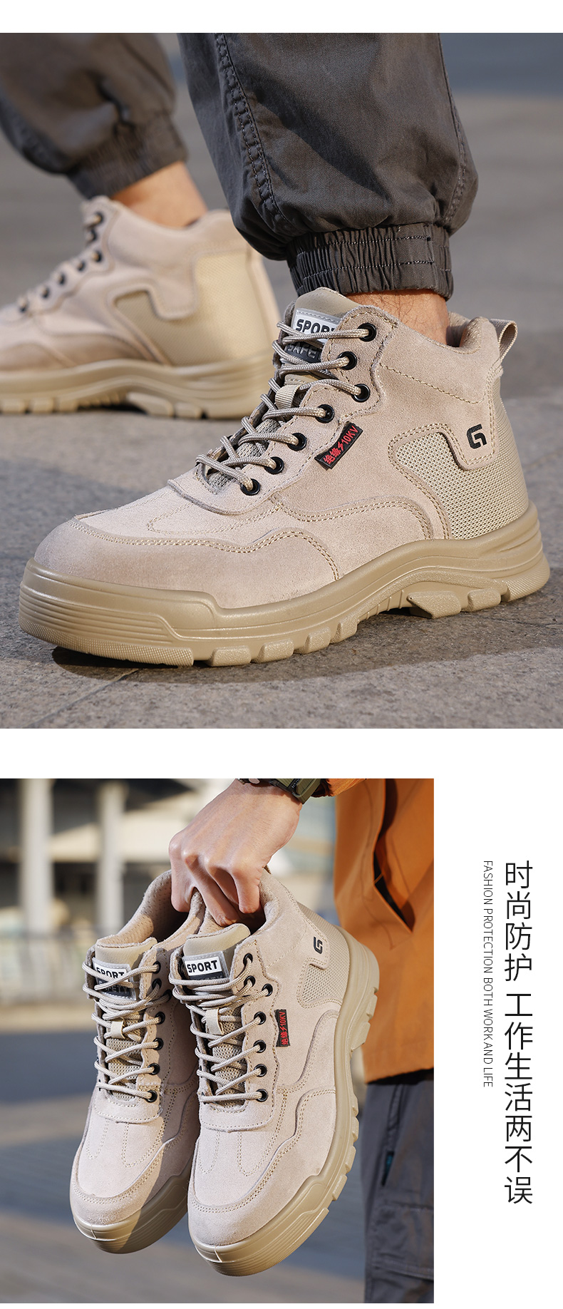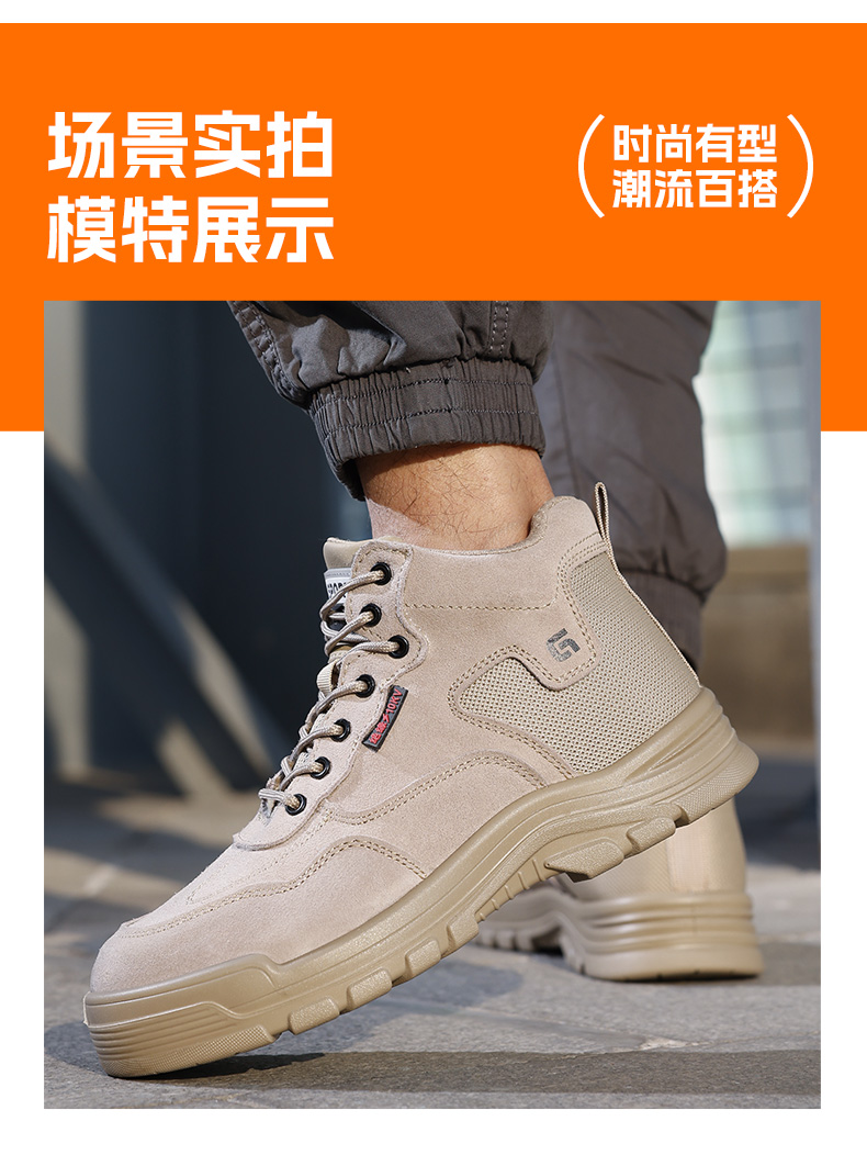 2025新款四季款劳保鞋防砸防刺穿绝缘10KV达标塑包头凯夫拉底实心底反绒皮棕色高帮安全鞋