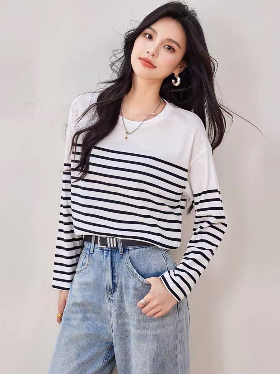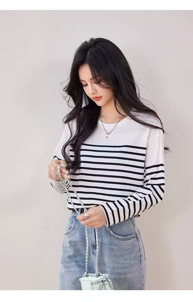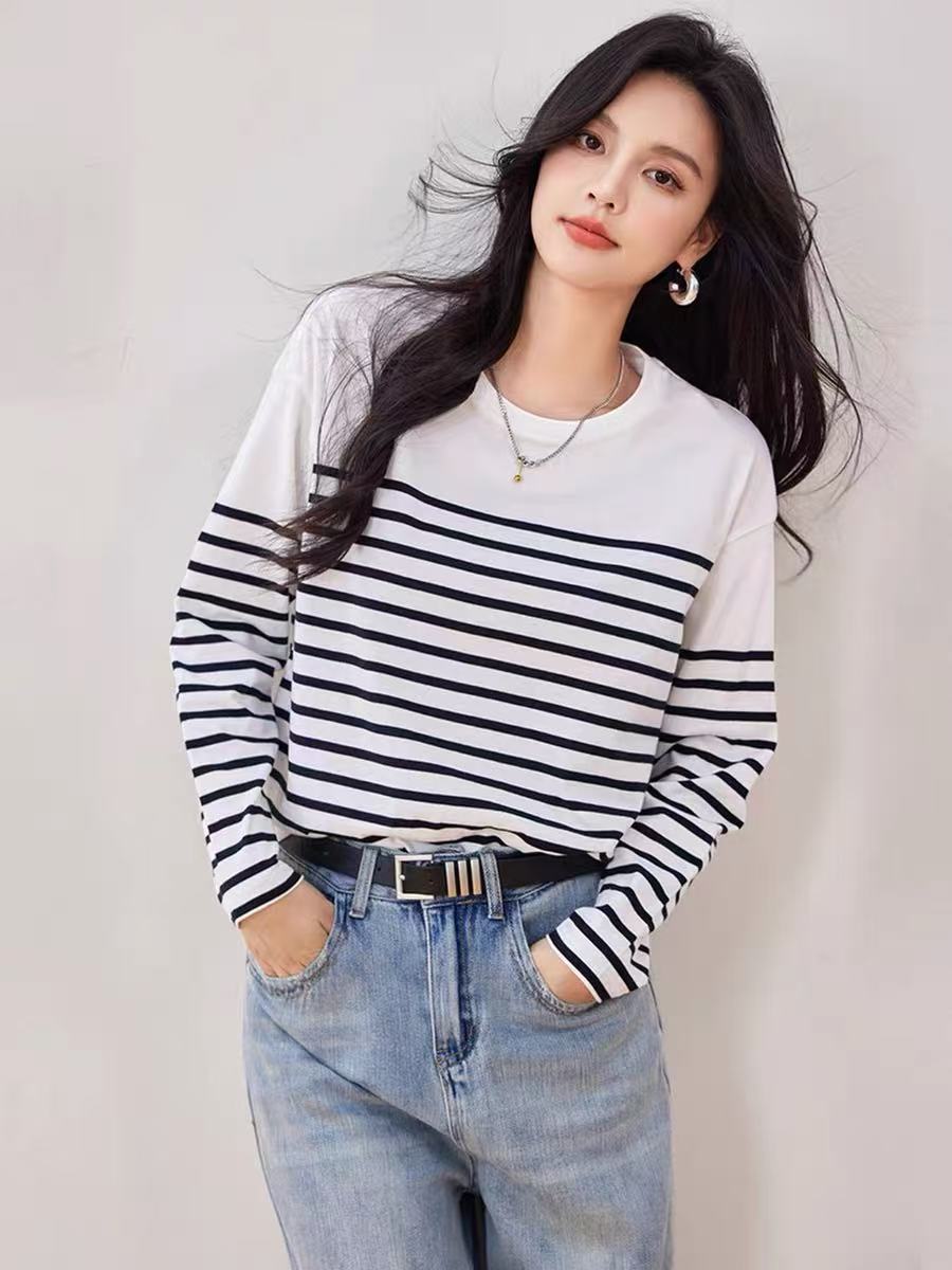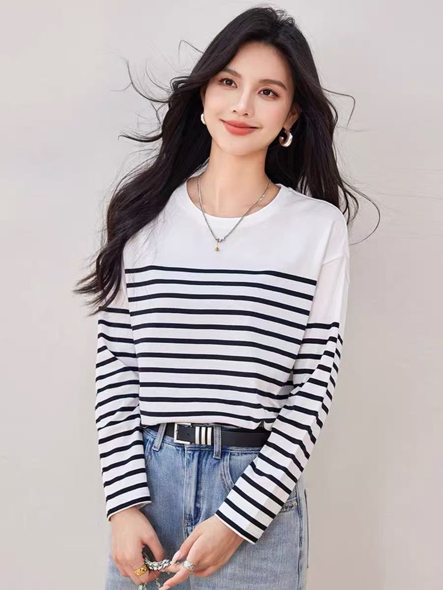 【超值特卖】黑白条纹长袖百搭打底衫-喜出