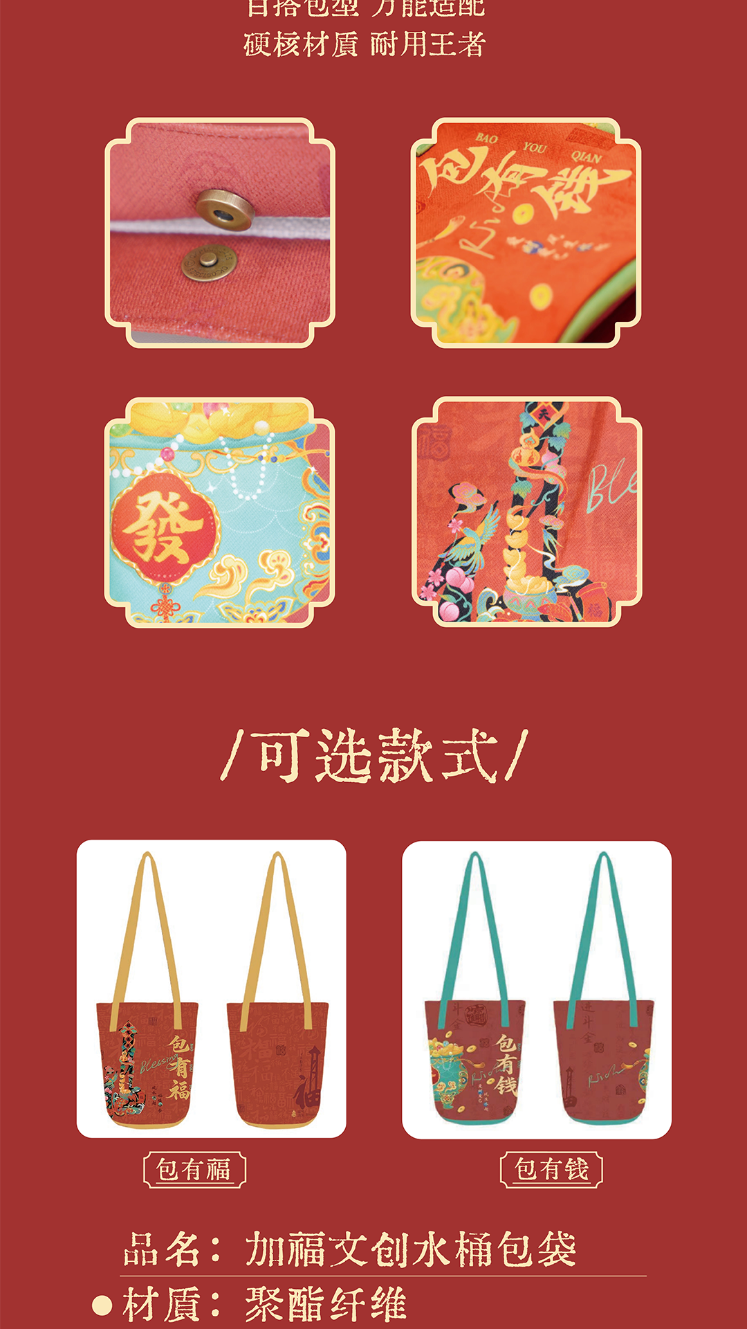【重要说明】:本品印有“【包】有钱、【包】有福,为趣味谐音梗设计,取其“水桶包”的“包”字,表达对美好生活的一种祝愿和寓意,并非对本产品有任何实际功效的承诺。请以趣味文创品的视角欣赏它。