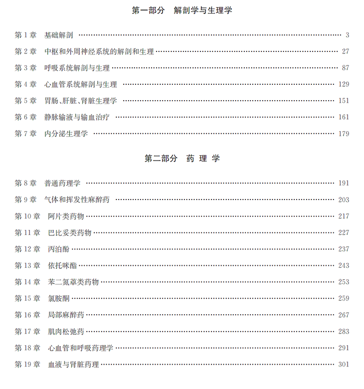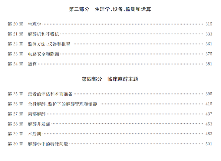 该书分为30个章节,归类为4个主要部分:第1部分:解剖学和生理学;第2部分:药理学;第3部分:物理,设备,监测和运算;第4部分:临床麻醉主题。