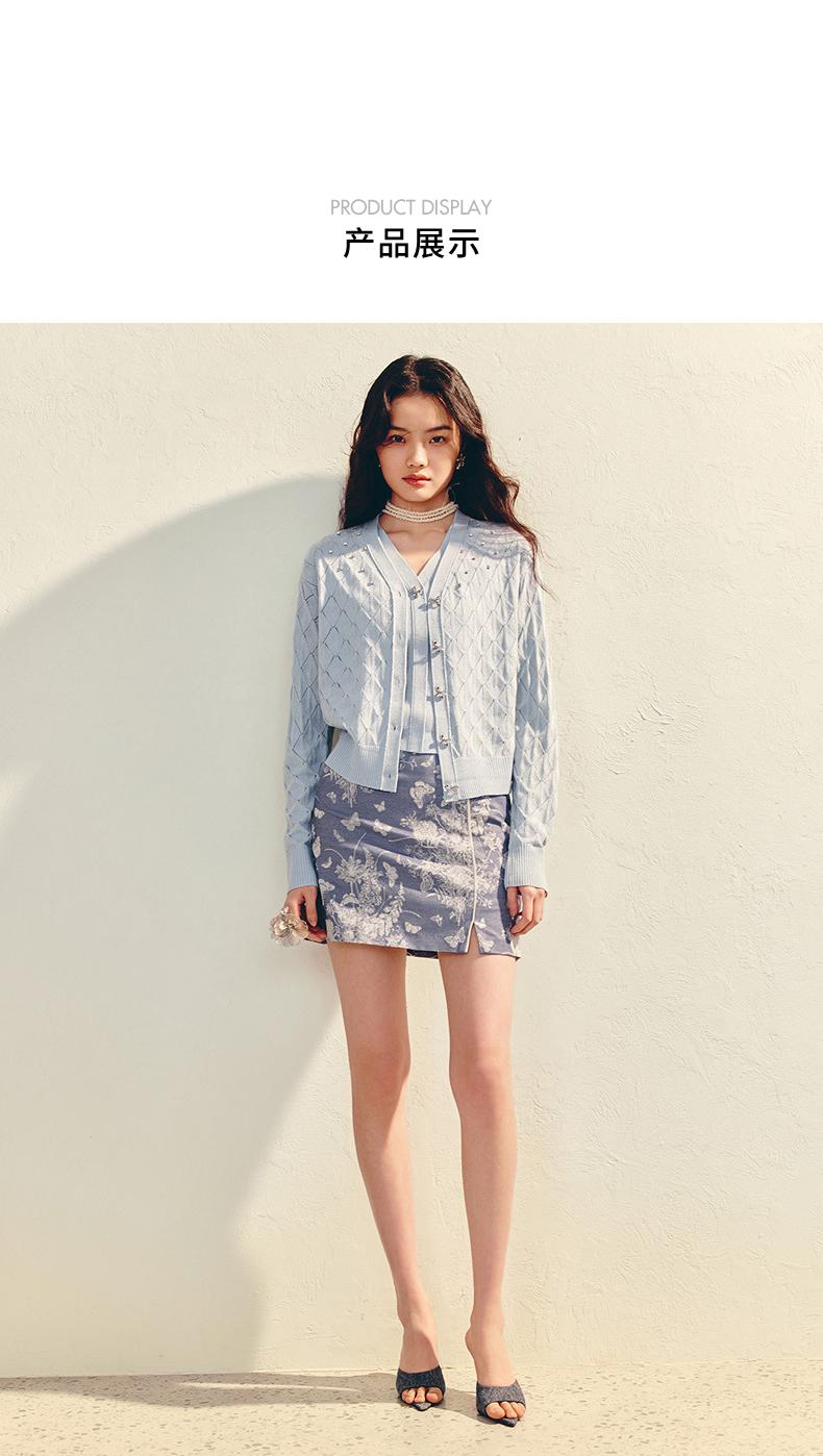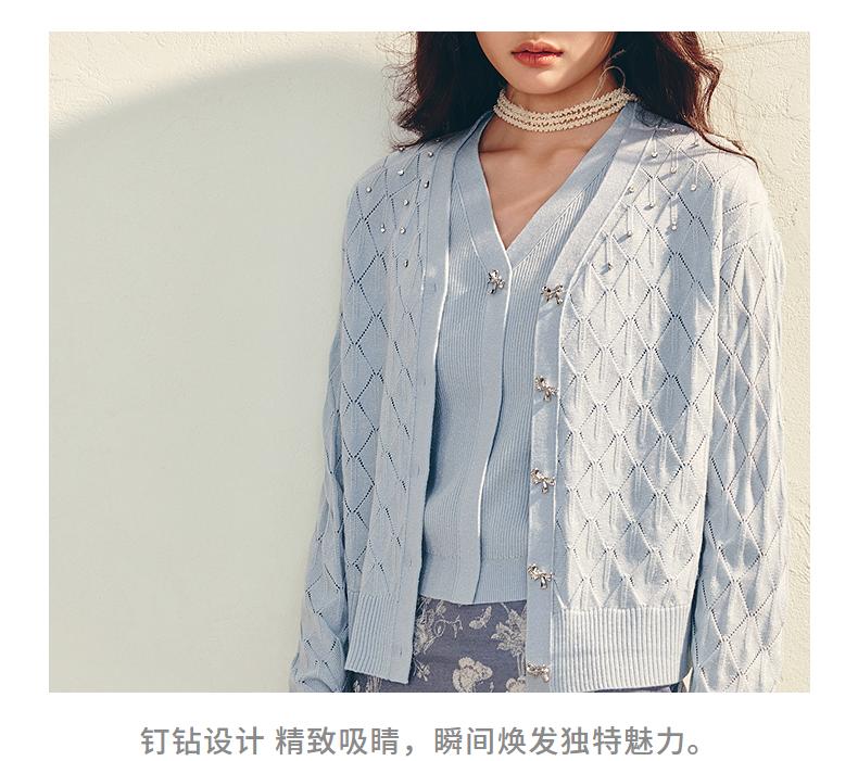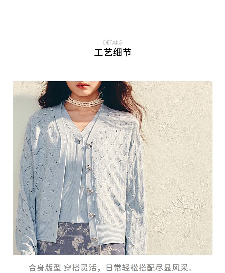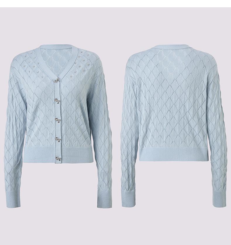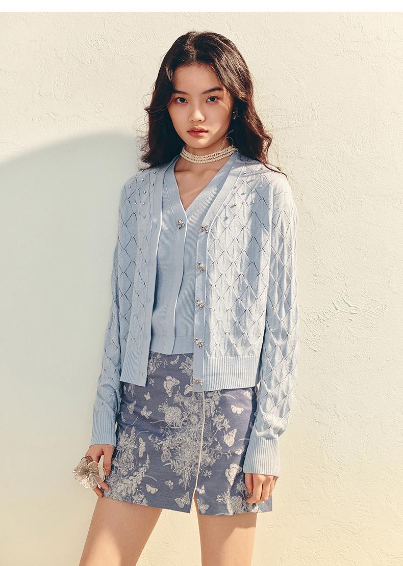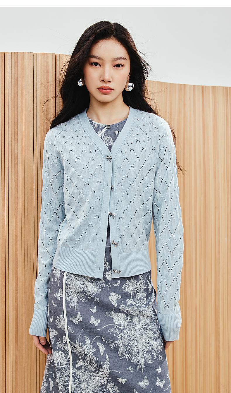 MAXRIENY蝴蝶纽扣精致复古菱格上衣2025春款针织修身日常百搭外套(货号:MS86JA022)