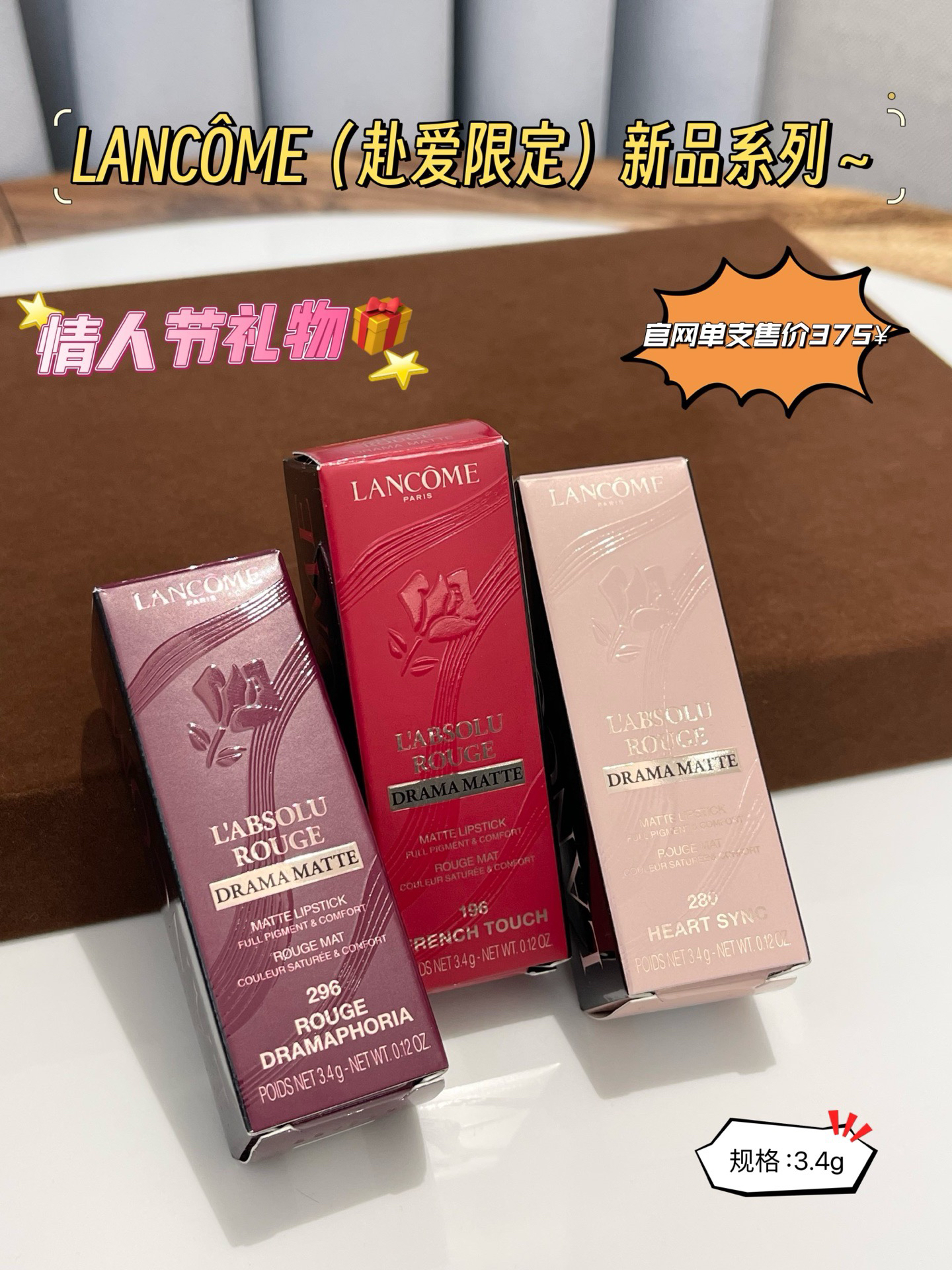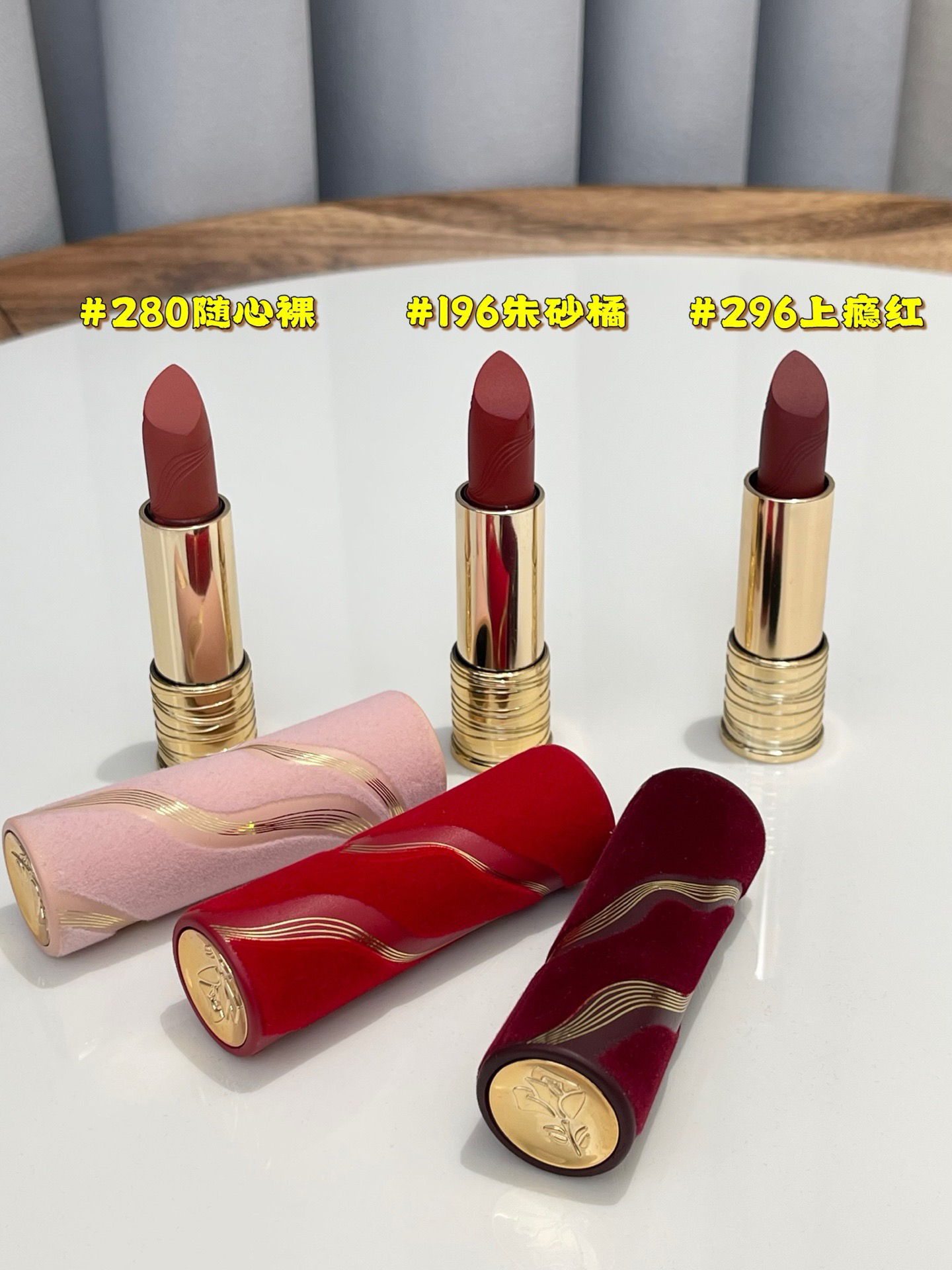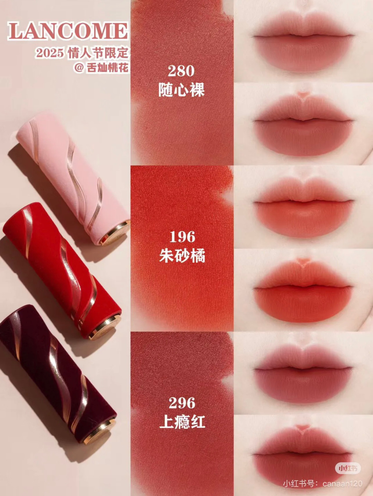 可作为情人节礼物🎁,兰蔻推出的“赴爱限定”口红 鎏金线条 勾勒心之所想,丝绒缱綣 一路向爱而驰!开年及王炸的存在 精致的鎏金线条搭配丝绒外壳 整一个艺术品 高级又有质感 赴爱系列 三个色号: 280#随心裸“ 196#朱砂橘“ 296#上瘾红“ 都是超级经典色号 各路明星大咖追捧的的单品!建议多色入!不啰嗦 喜欢的抓紧囤吧!官网在售375 月销量10W➕ 断货王!真的是太火爆了!开年及王炸!