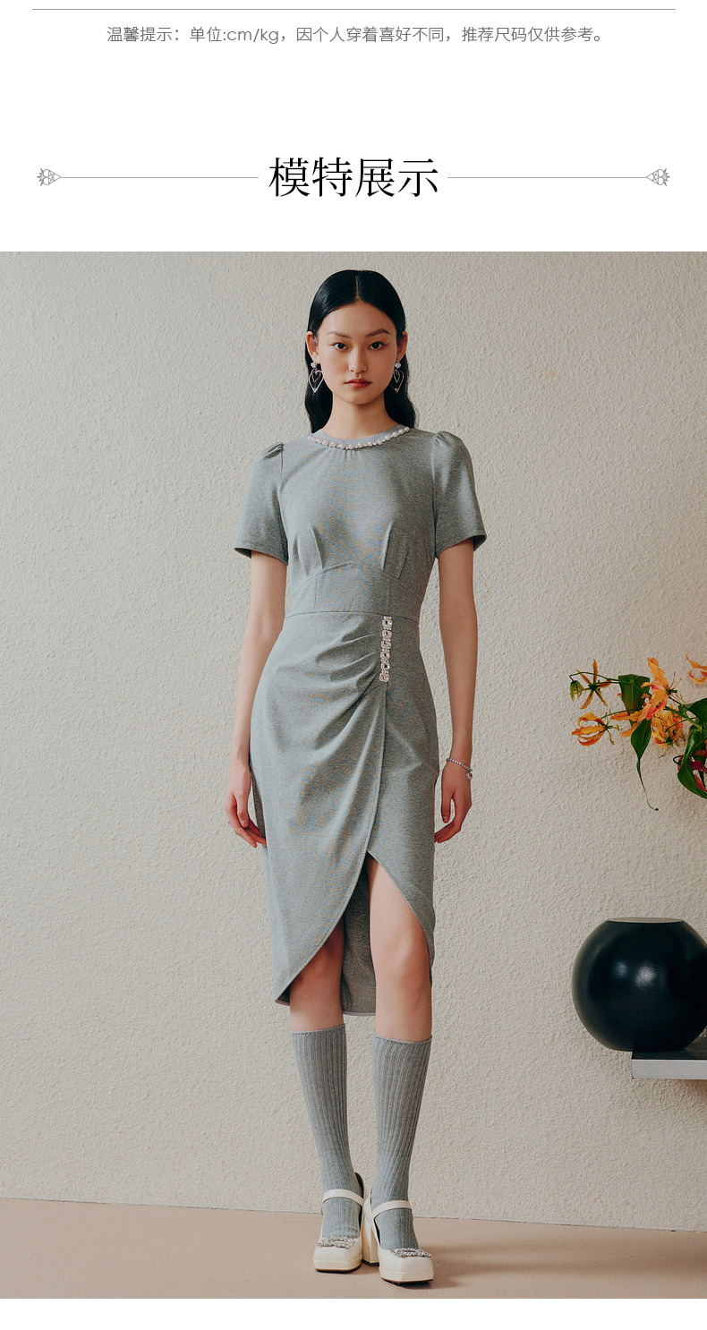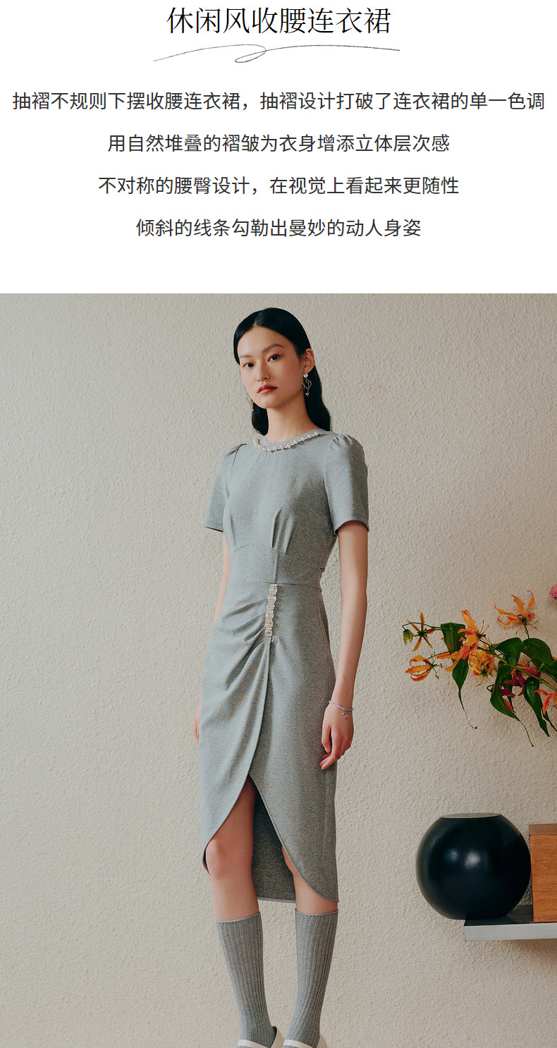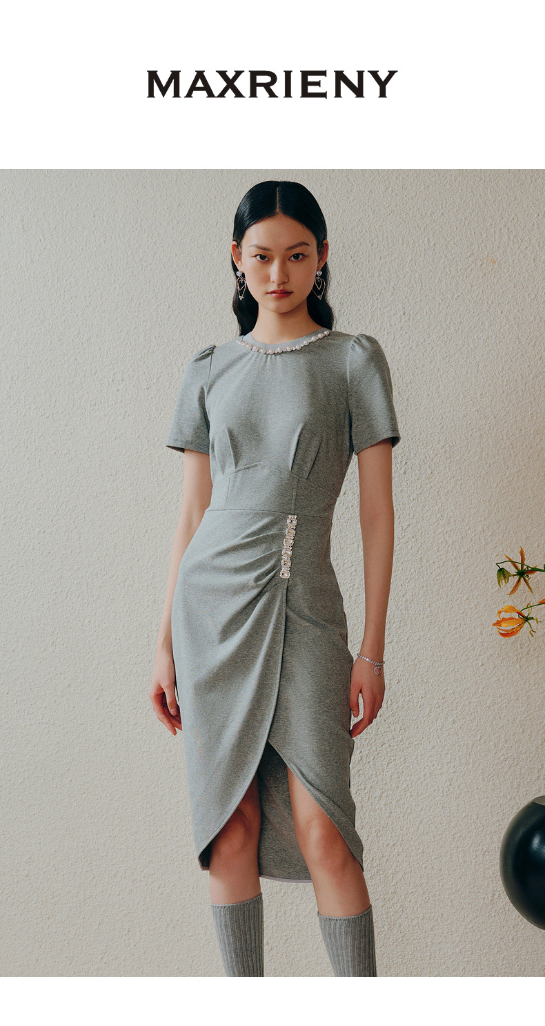 【商场同款】MAXRIENY精致轻奢感不对称抽褶连衣裙修身遮肉开叉裙(货号:MC88DR334)
