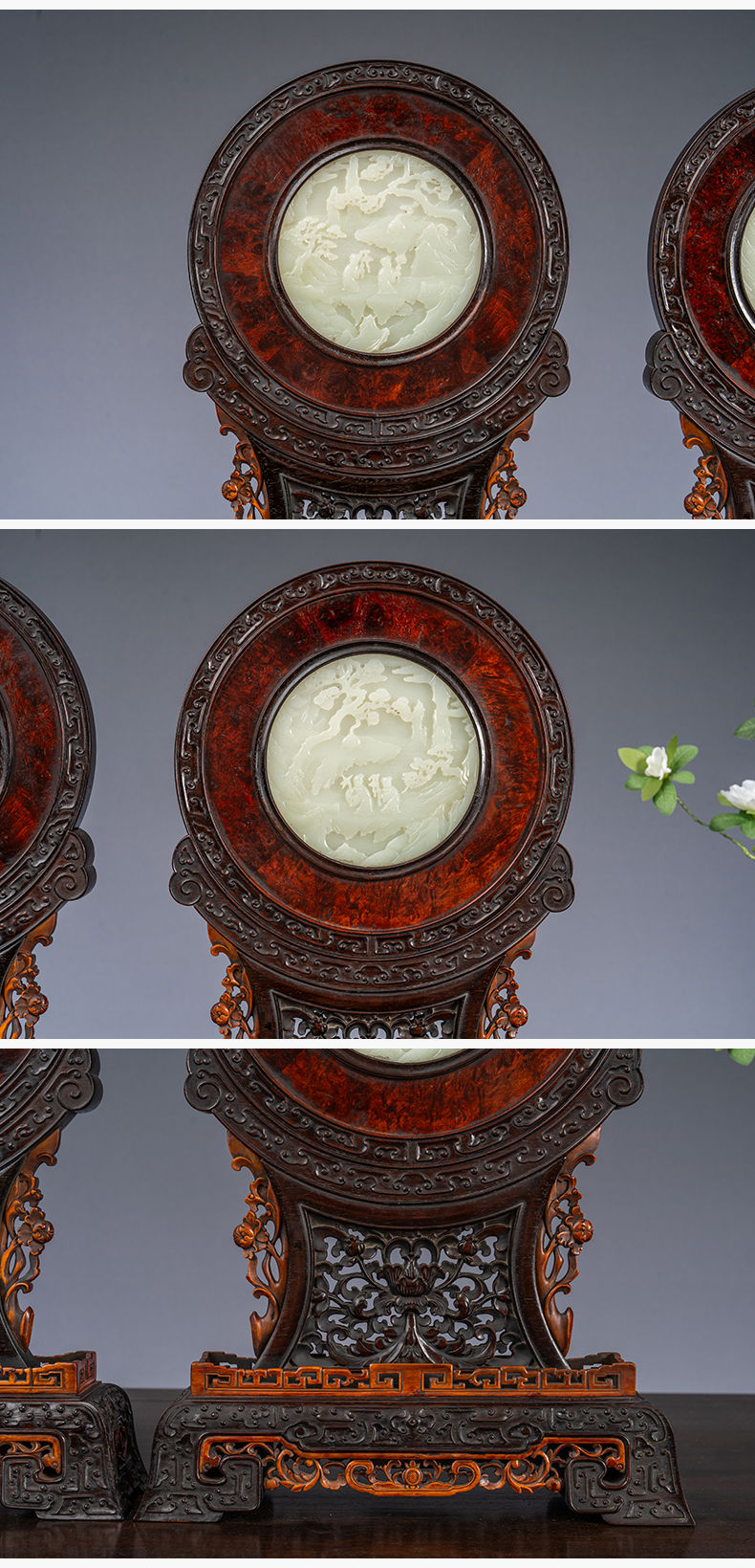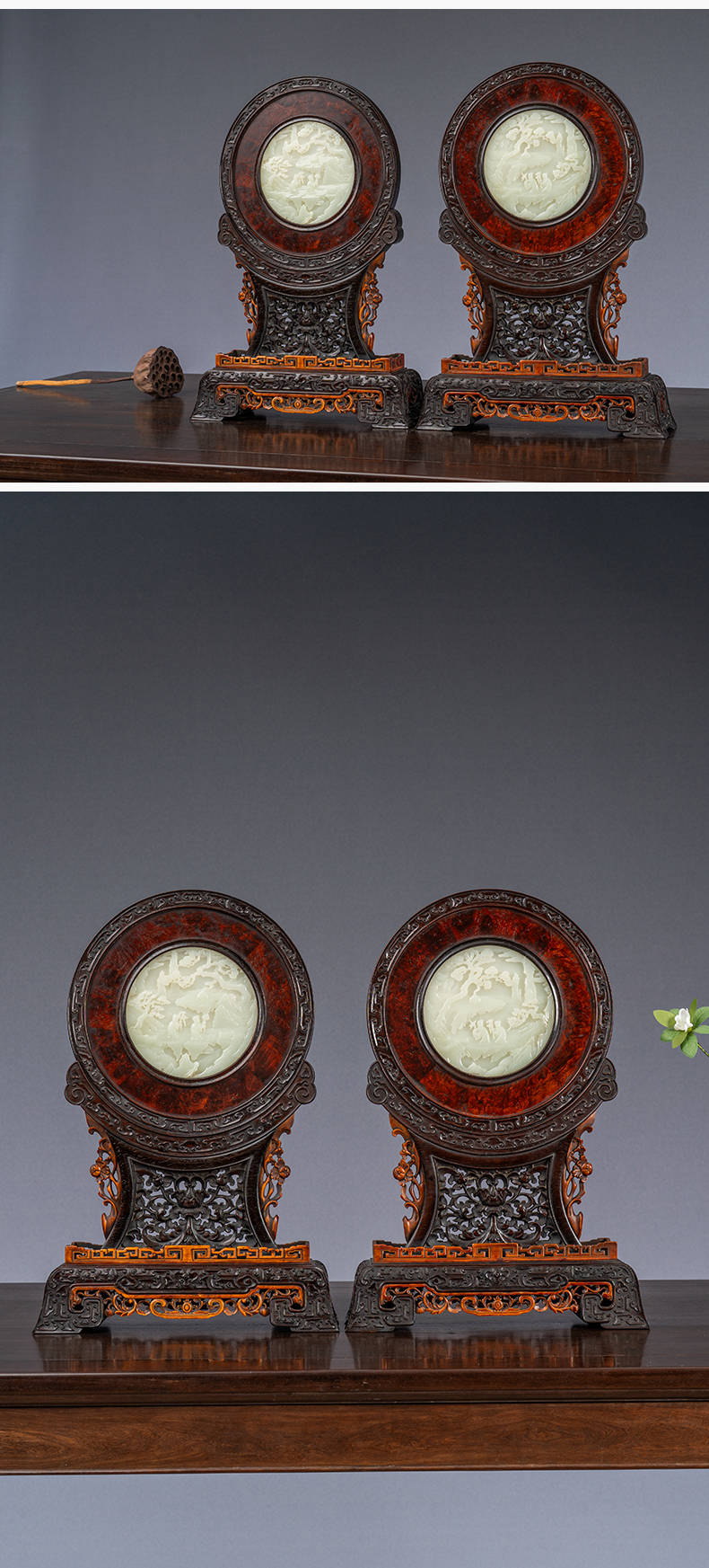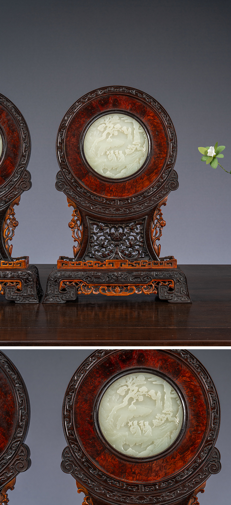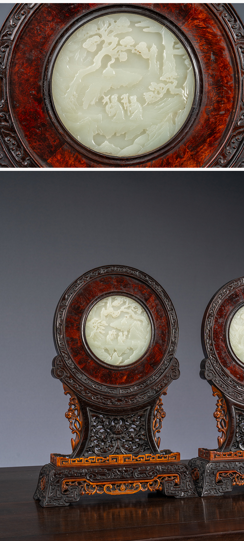 清 红木及黄杨木镶瘿木嵌玉雕山水人物圆形插屏(一对)