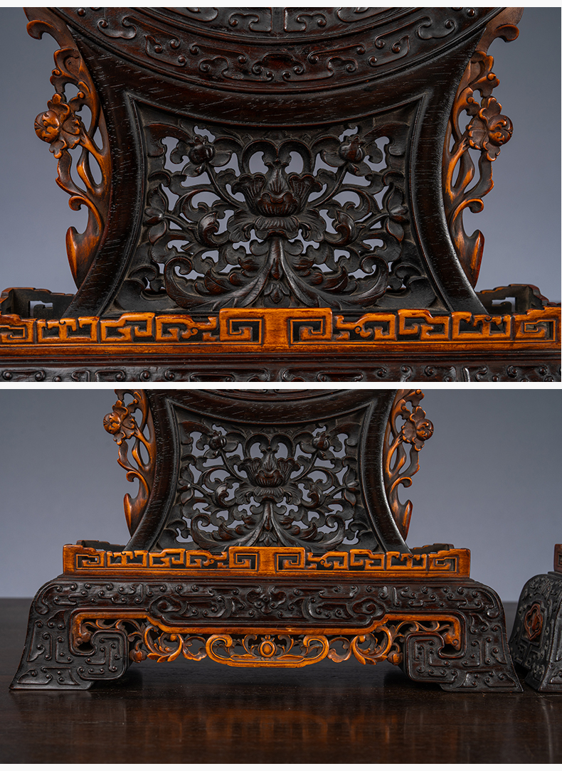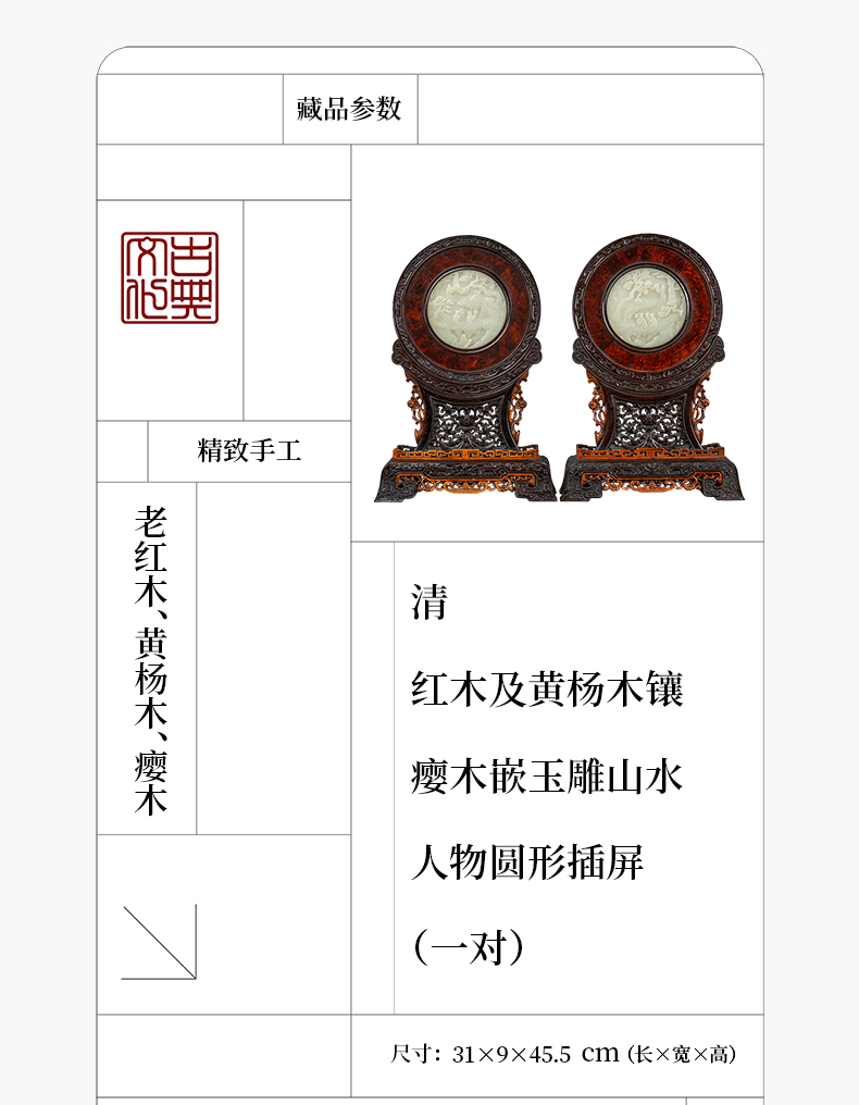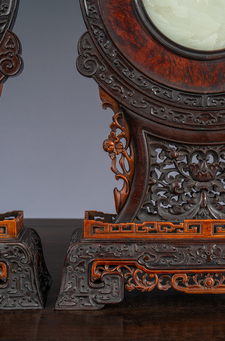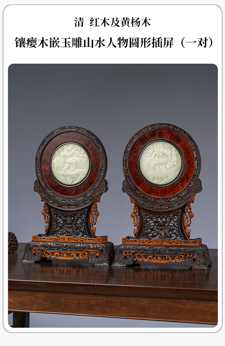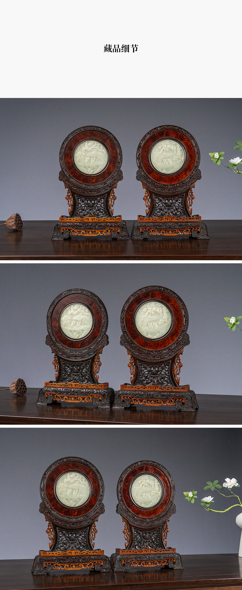 清 红木及黄杨木镶瘿木嵌玉雕山水人物圆形插屏(一对)
