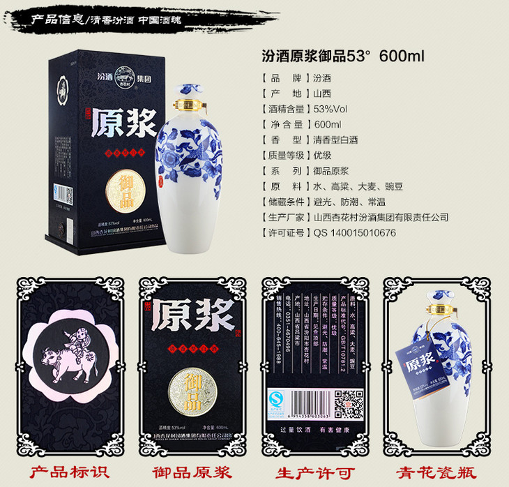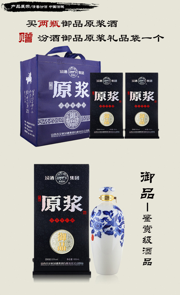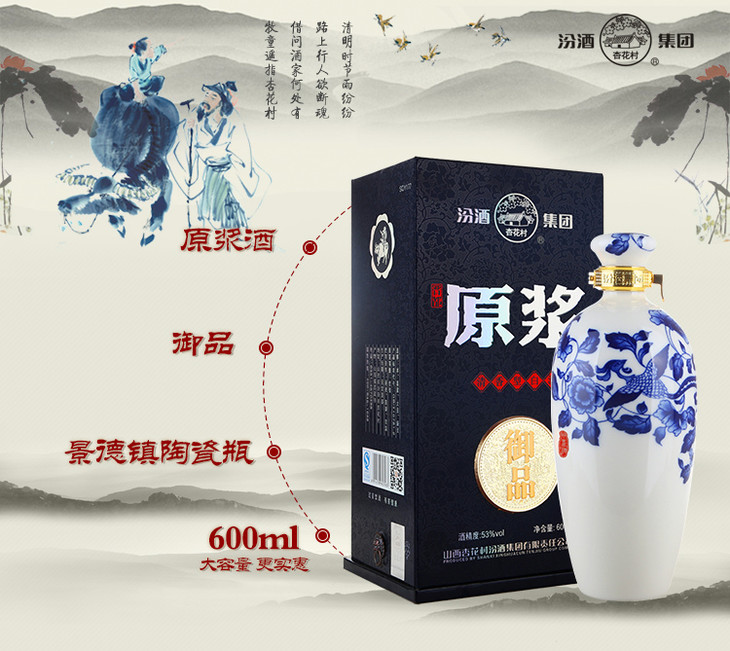 【推荐】汾酒集团杏花村 御品原浆 53度 600ml 清香型白酒 单瓶