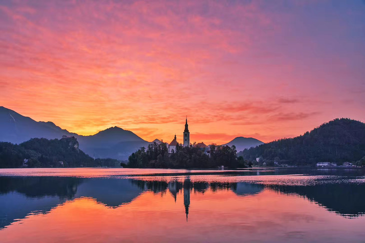 多洛米蒂山区代表的湖边日出拍摄;前往阿尔卑斯山南麓的斯洛文尼亚最美的布莱德湖,布莱德湖风景优美,湖水清澈见底,周围漫山景色迷人,阿尔卑斯雪峰在太阳的映照下显得清晰可见,一幅风景名画;各角度拍摄;顺光傍晚拍摄日落。