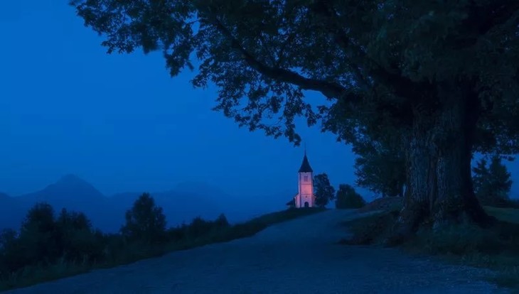 拍摄最美的布莱德湖日出,布莱德湖拍摄不同角度拍摄美景。布莱德湖最佳角度拍摄;拍摄象一颗眼睛般镶嵌在群山峻岭之间;风景如画的山脉、映衬着蓝天白云、山丘和森林秋色日落拍摄蓝调照片拍摄。