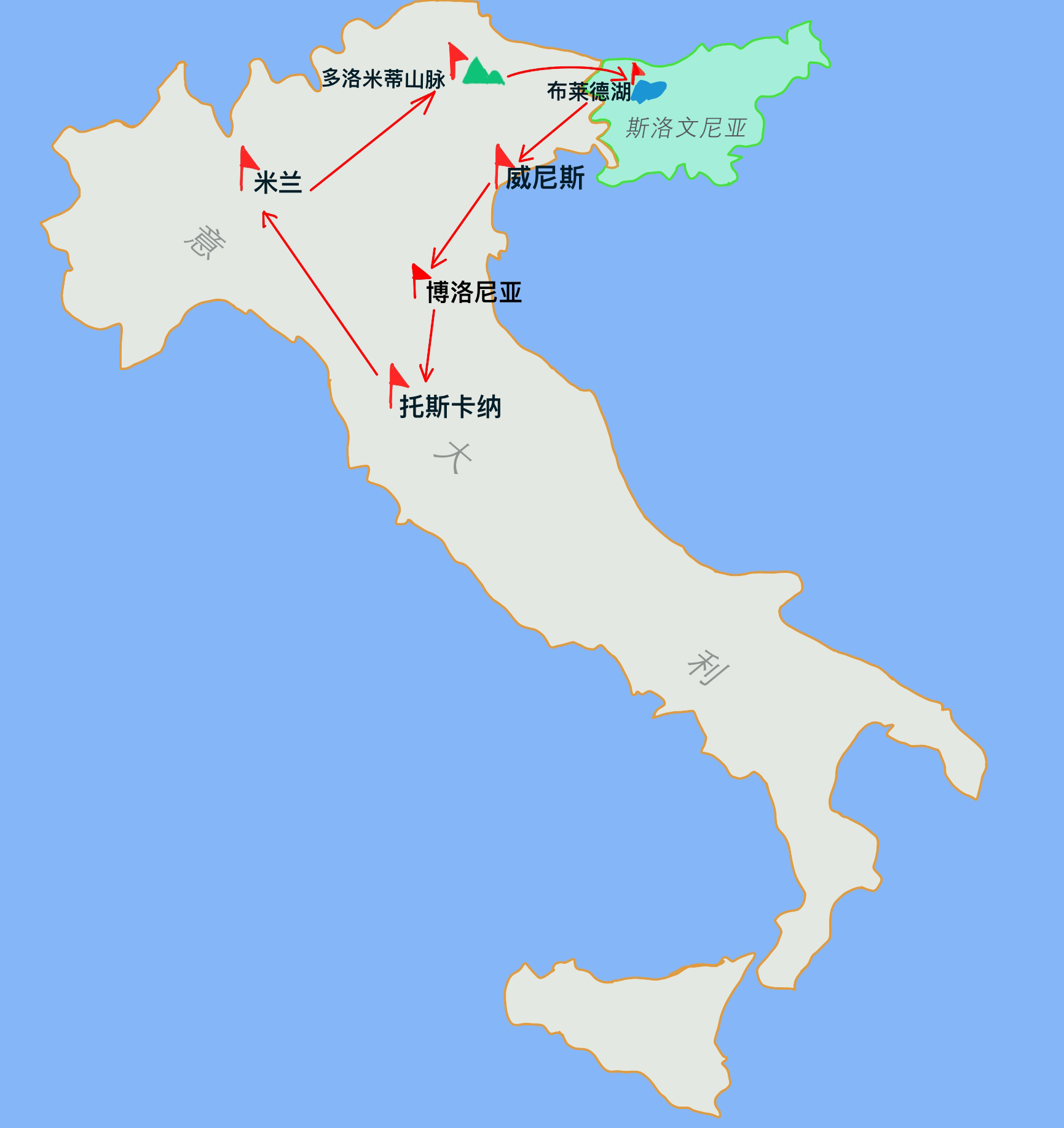 米兰时间当日抵达,乘车欣赏沿途风光前往多洛米蒂山区,下午拍摄多洛米蒂山脉日落景色及蓝调照片。