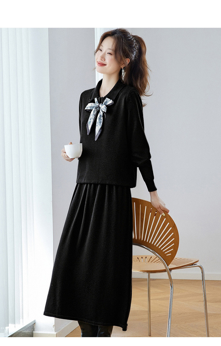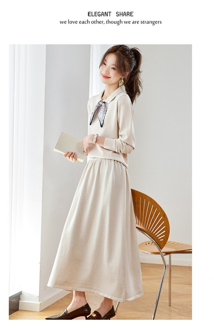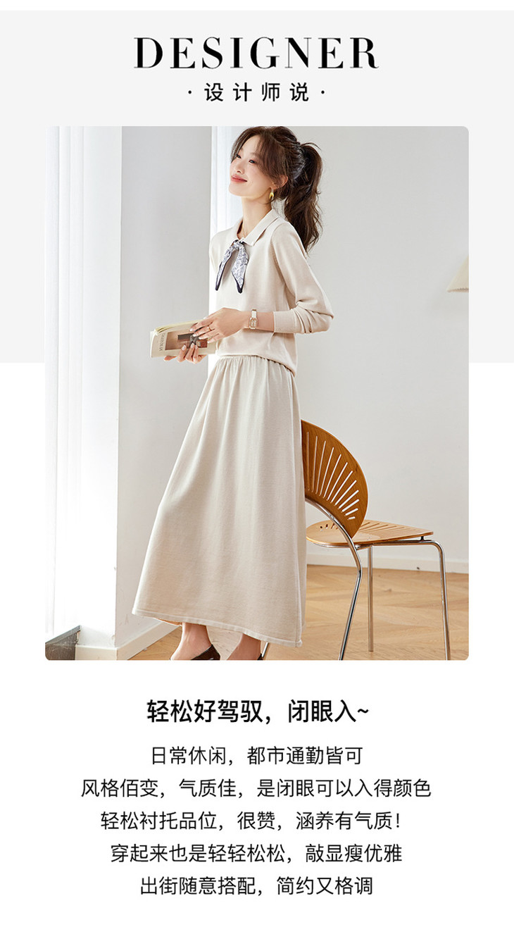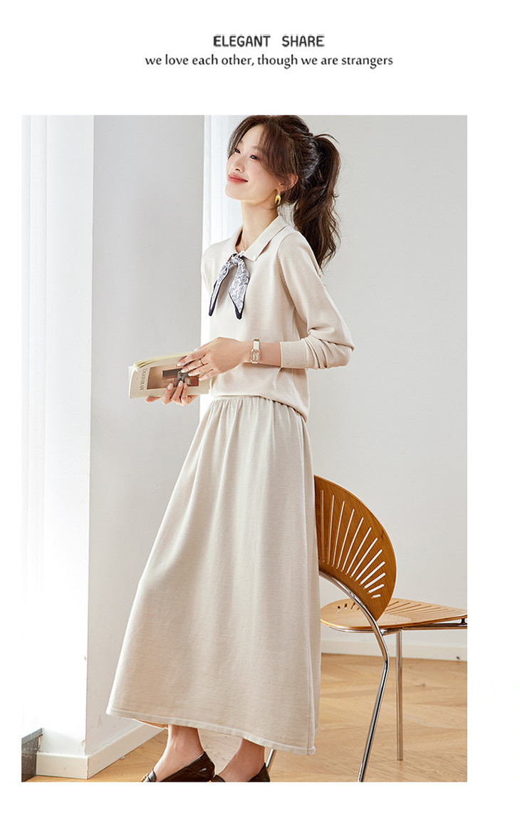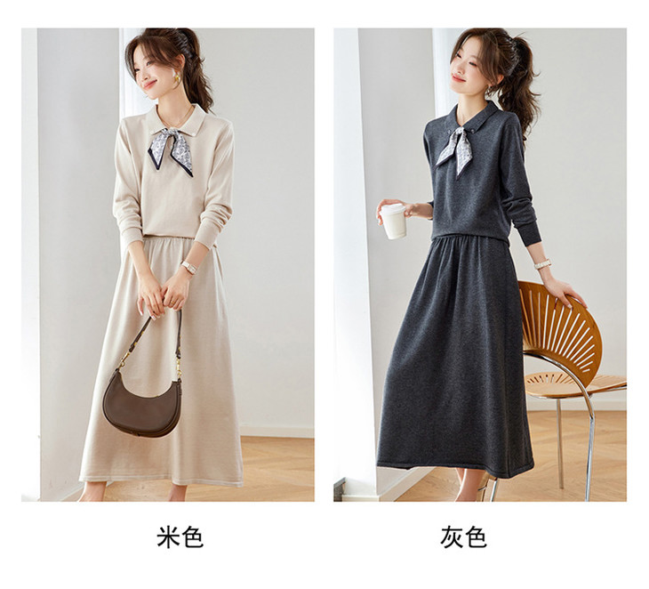 法式温柔风丝巾翻领上衣,针织半身裙套装CC-ML-9967