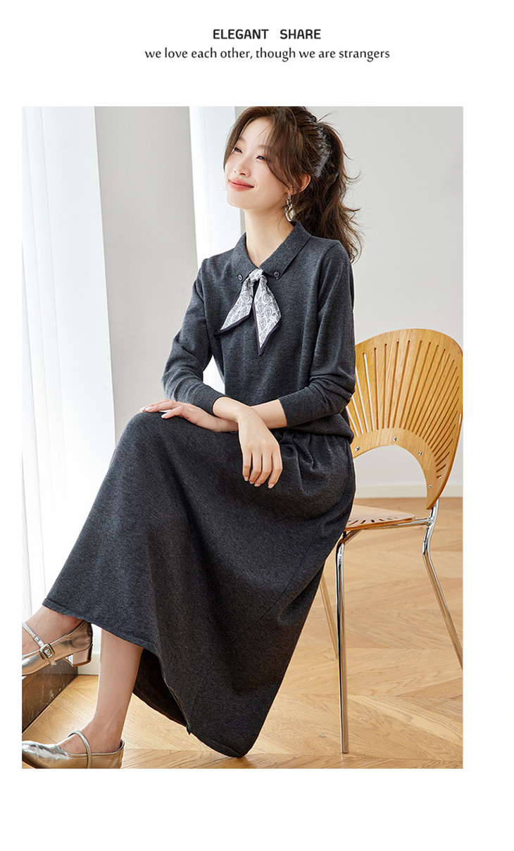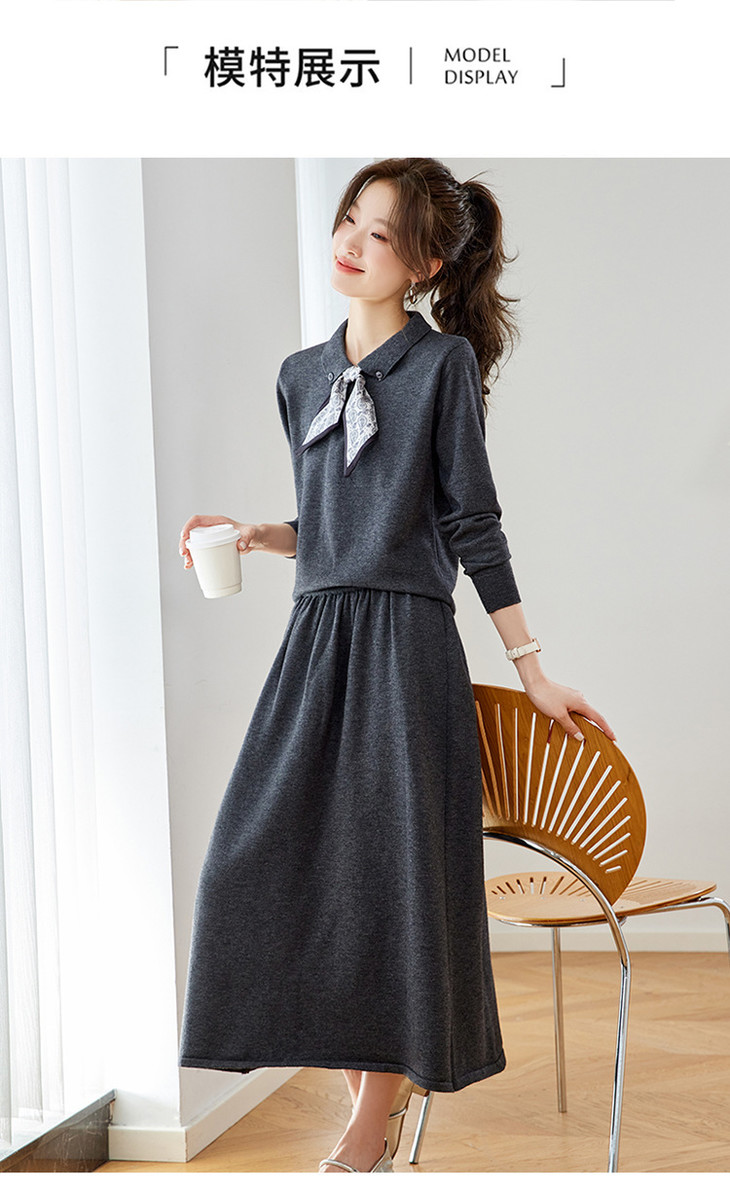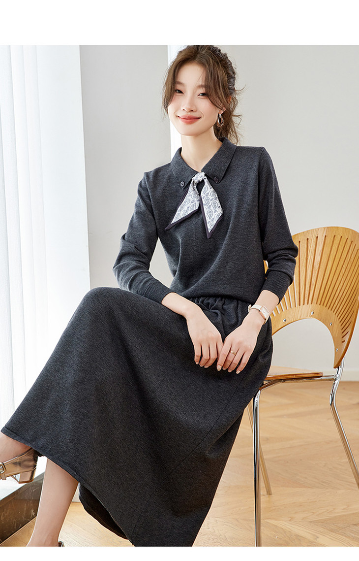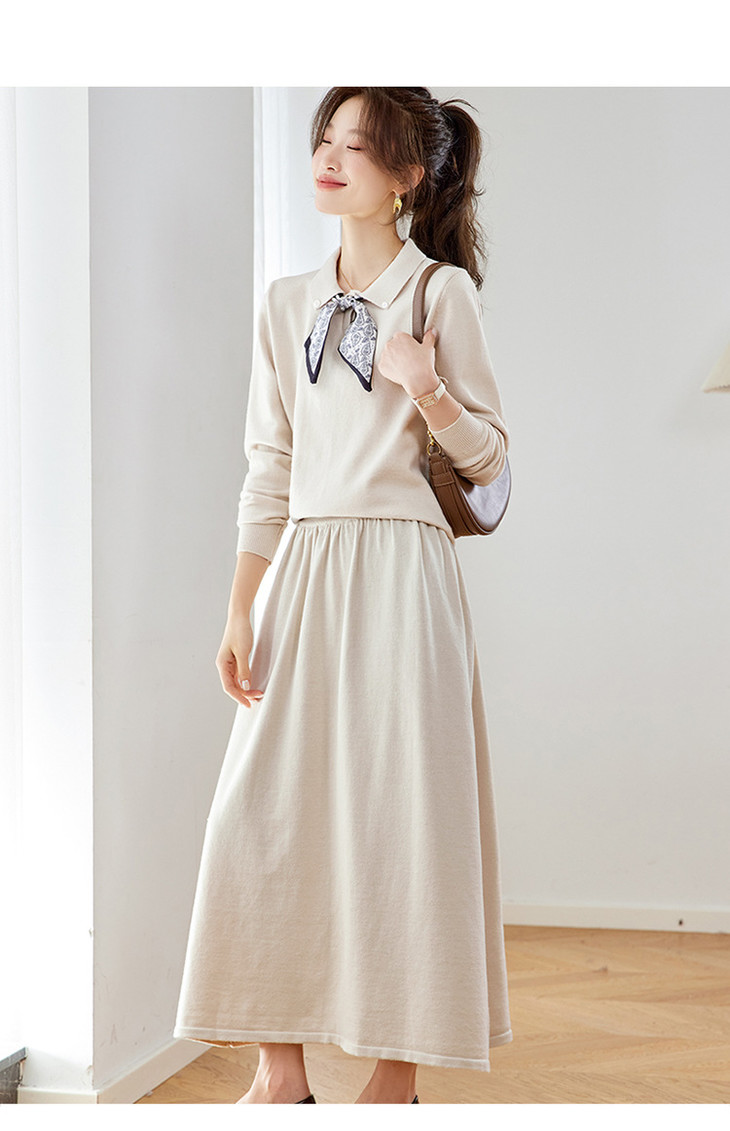 法式温柔风丝巾翻领上衣,针织半身裙套装CC-ML-9967