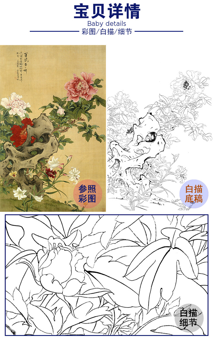 竖幅工笔花鸟白描底稿-牡丹-俞致贞百花争妍-JV03