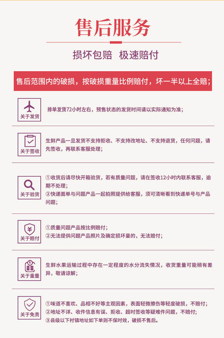 品名:新疆喀什法兰西西梅 规格1:2斤中果彩箱装(单果15~20g;约50~65枚) 规格2:3斤中果彩箱装(单果15~20g;约75~100枚) 规格3:3斤大果礼盒装(单果20~25g;约60~75枚) 规格4:3斤超大果礼盒装(单果25g+;约50~60枚);拍几份发几个包裹,不一定能同时到达,请耐心等待 发货产地:新疆&成都 包装方式:礼盒+吸塑盒+网套 物流信息:默认顺丰快递,不支持指定快递 发货区域:西藏、新疆、内蒙、黑龙江、吉林、辽宁不发; 物流详情:周六、周日及节假日除外,正常48小时内发货,到货时间约为2~5天,请耐心等待 售后说明:收到货后有质量问题,在24小时内都可以拍照(坏品+快递单面箱子一起拍)上传,申请按坏品比例理赔或联系客服,生鲜食品性质特殊,不支持7天无理由退换货;因地址错误,手机号联系不上,拒收等造成的损失无法售后,请理解; |