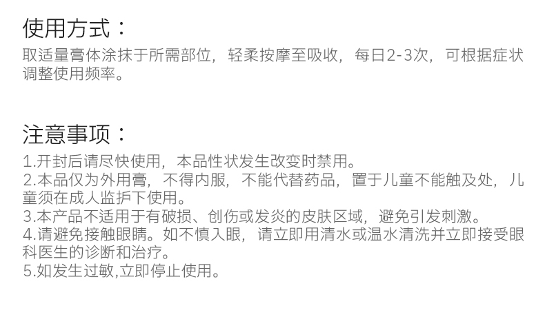 【使用方式】取适量膏体涂抹于所需部位,轻柔按摩至吸收,每日2-3次,可根据症状调整使用频率。