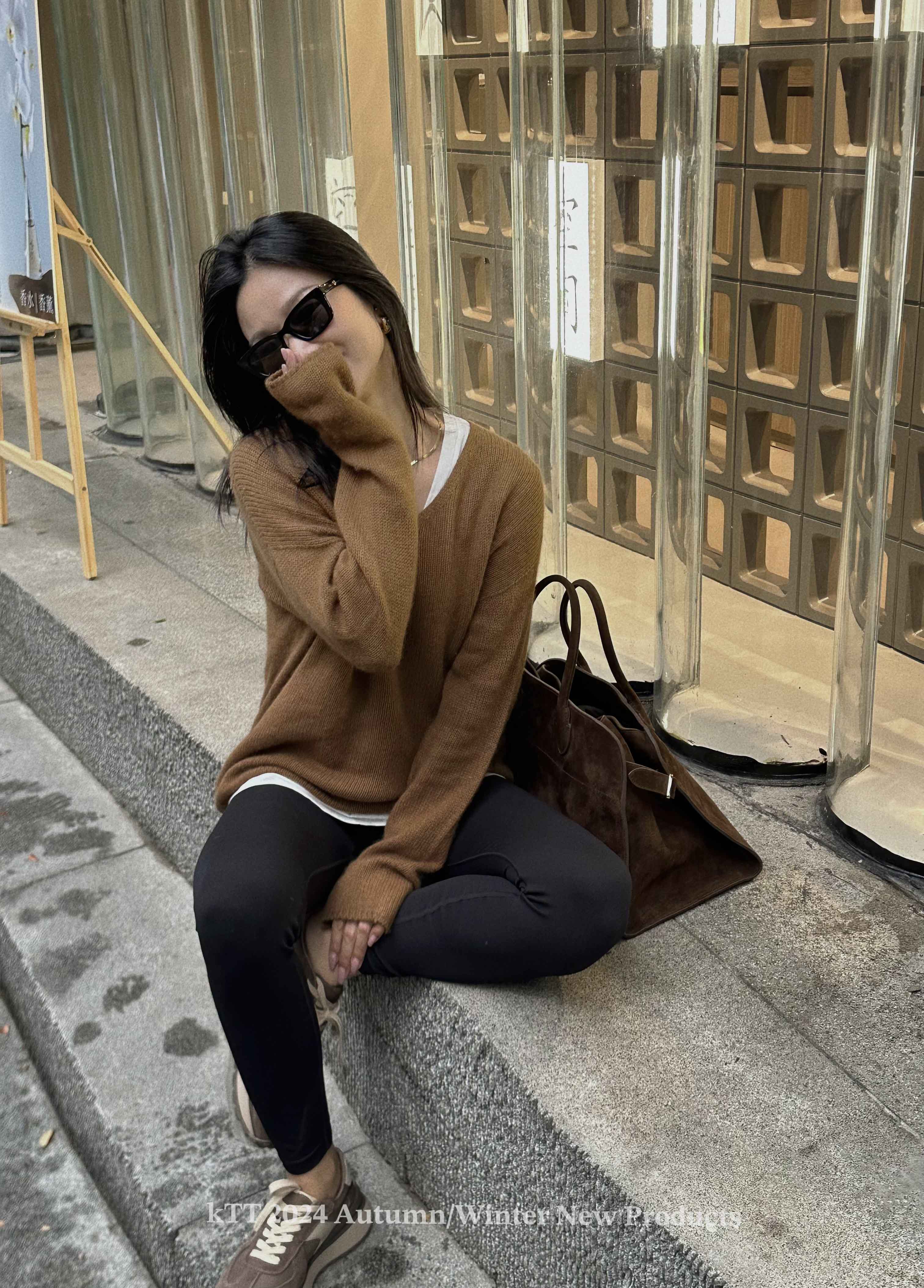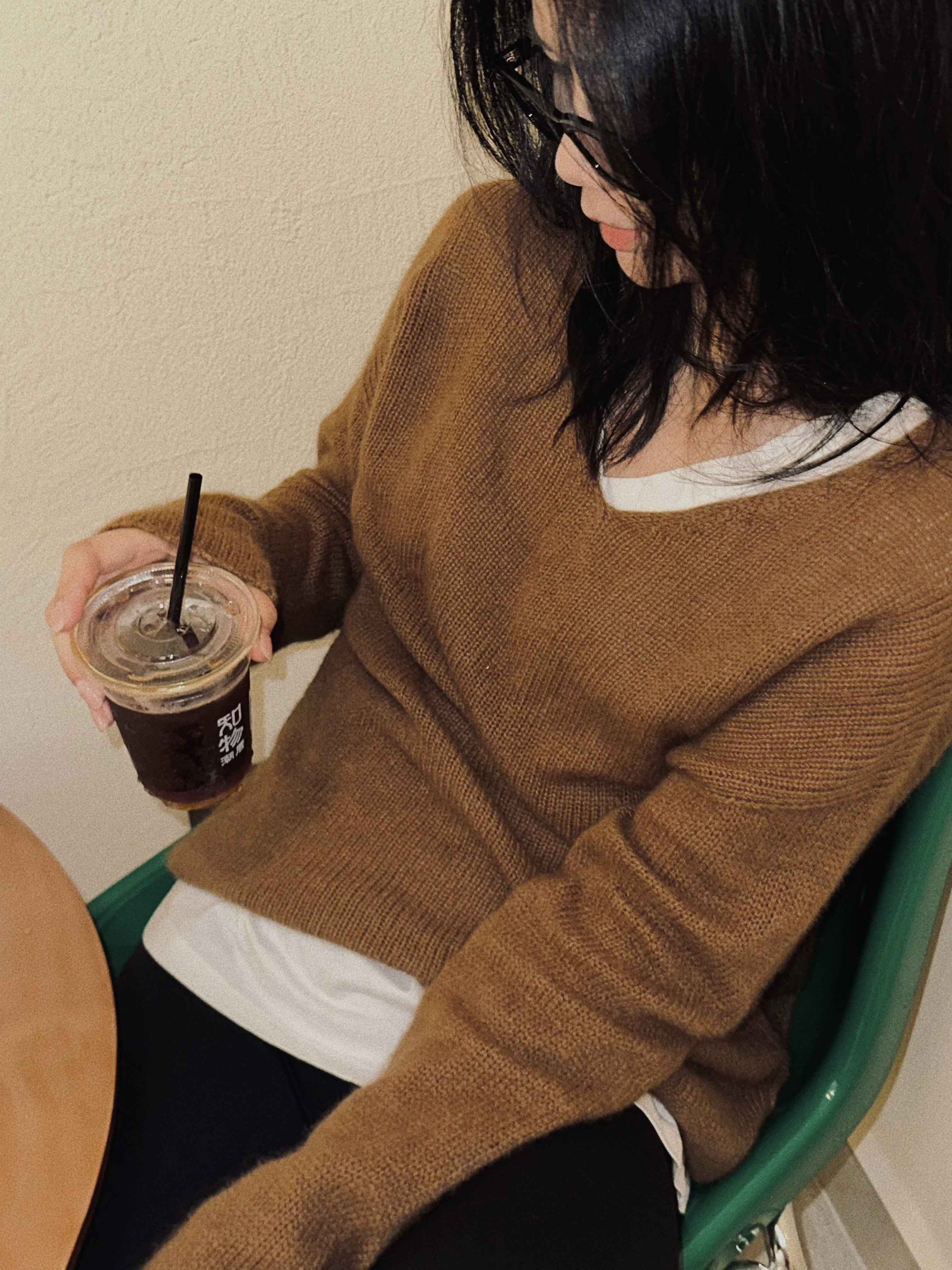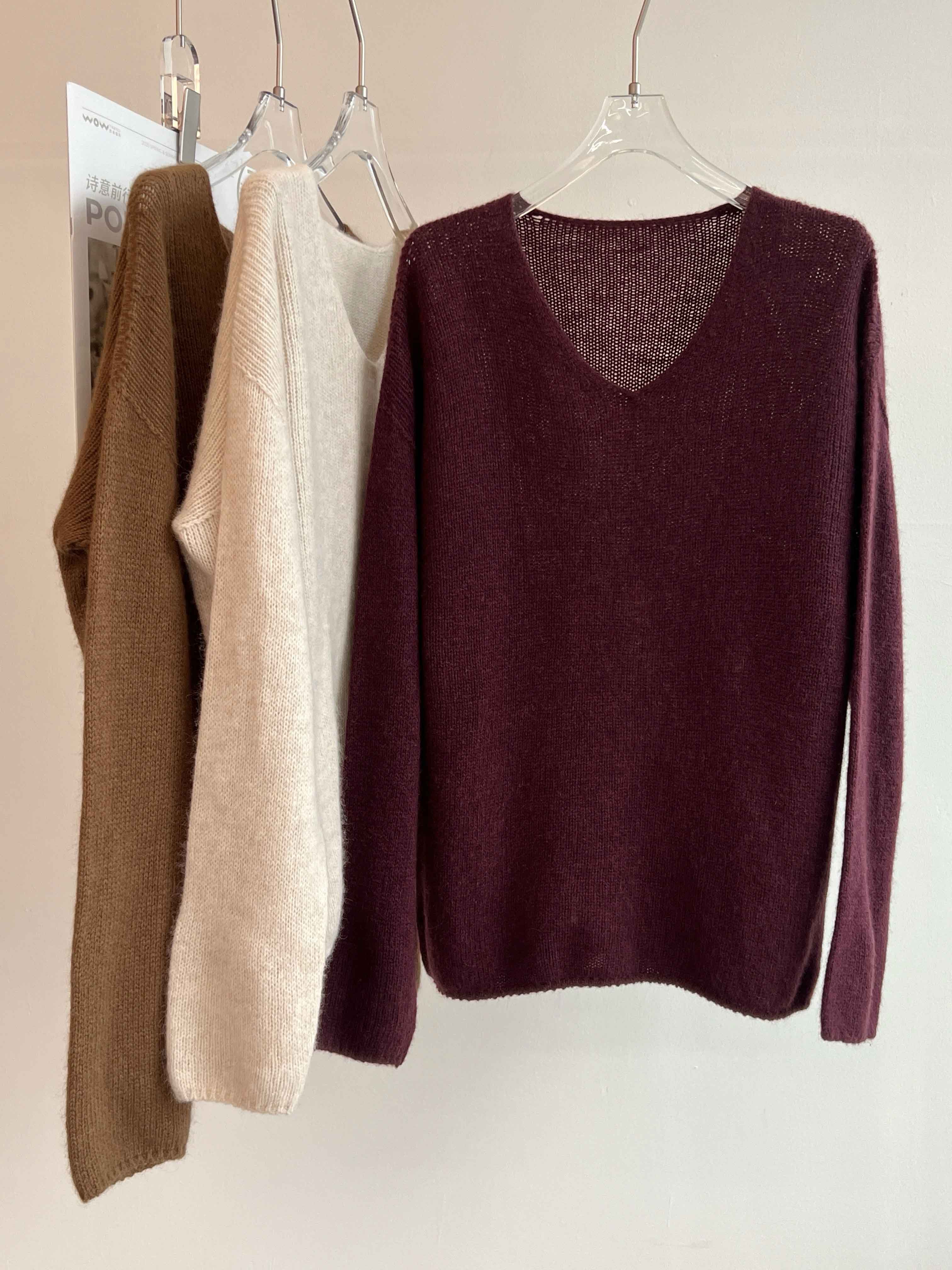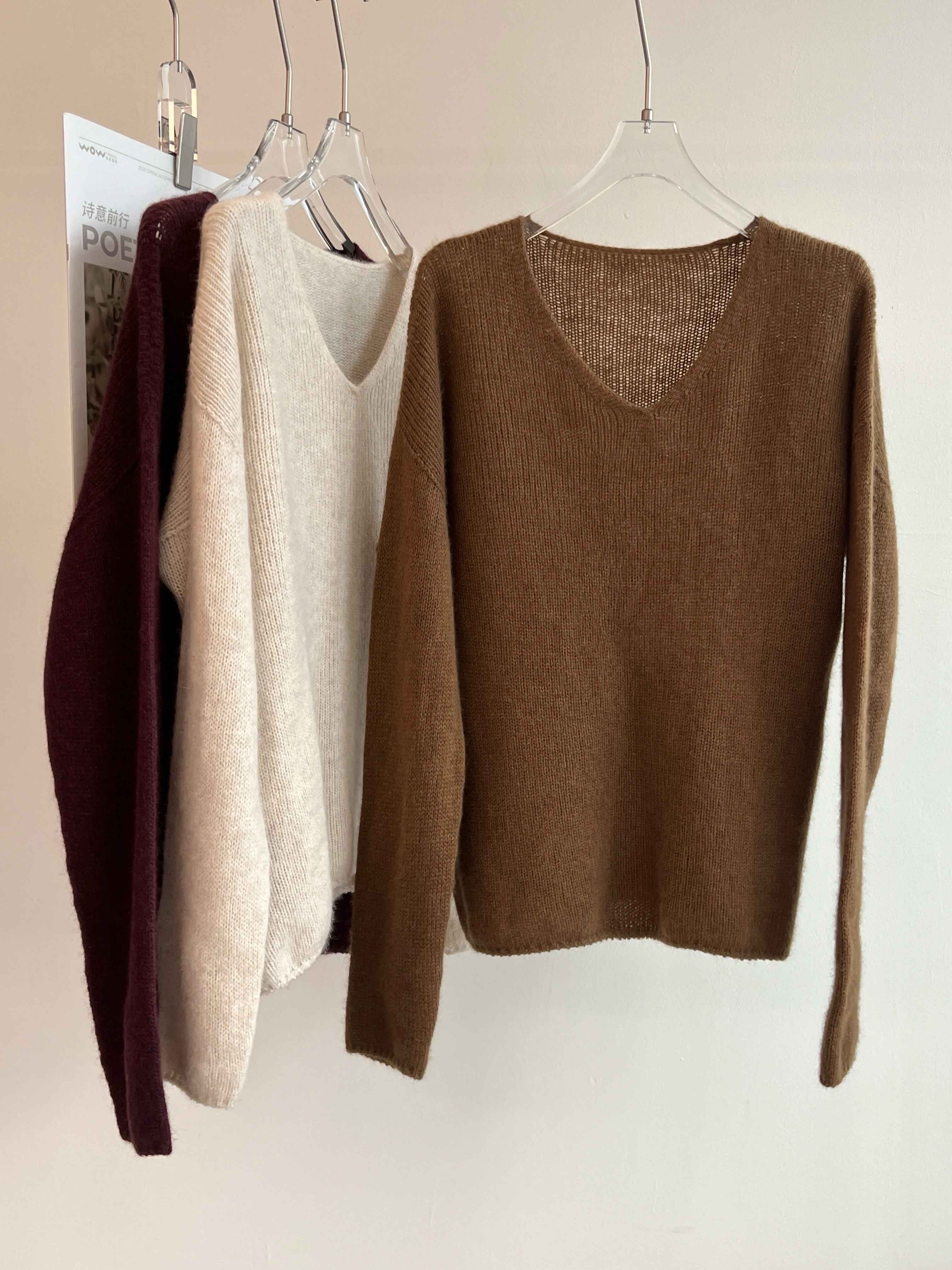 “毛绒绒”小浣熊无缝V领套头毛衣· 米色/咖色/安可拉红