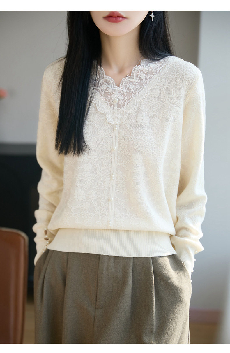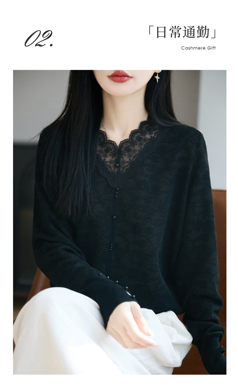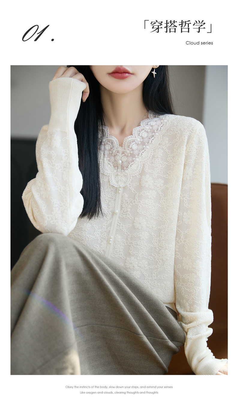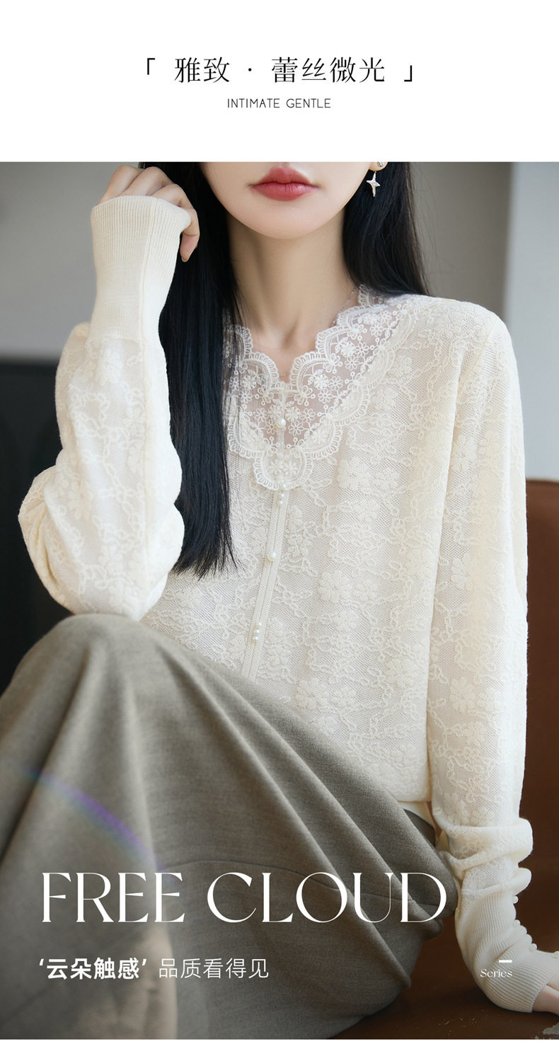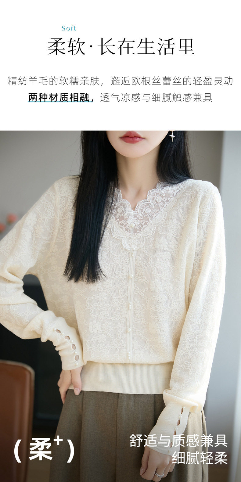 「自」全新升级【铂金会员137/天猫179/差价42】(94822)洛诗琳气质蕾丝拼接V领针织衫女2026新款女人味提花打底上衣