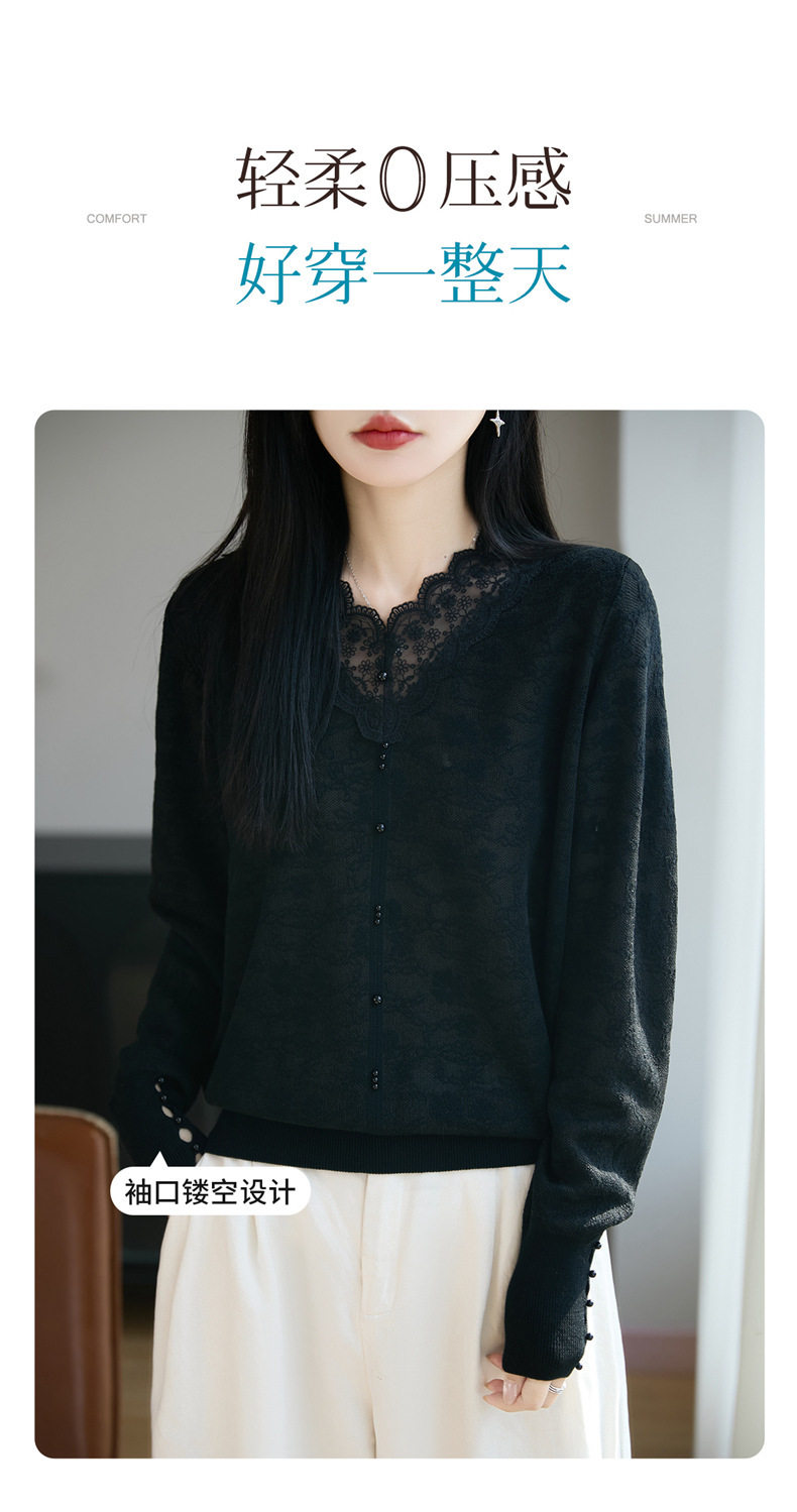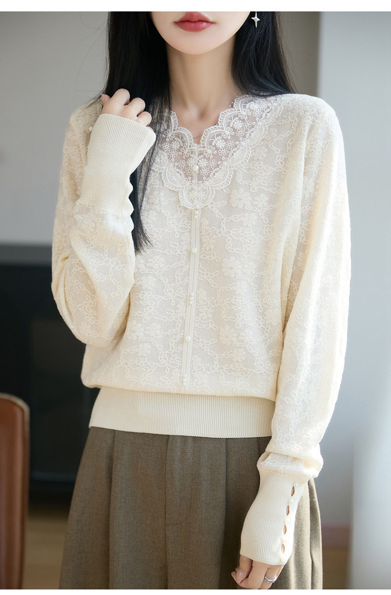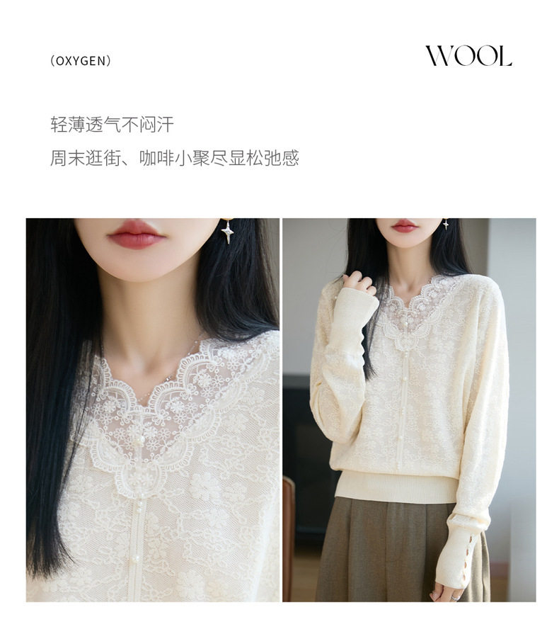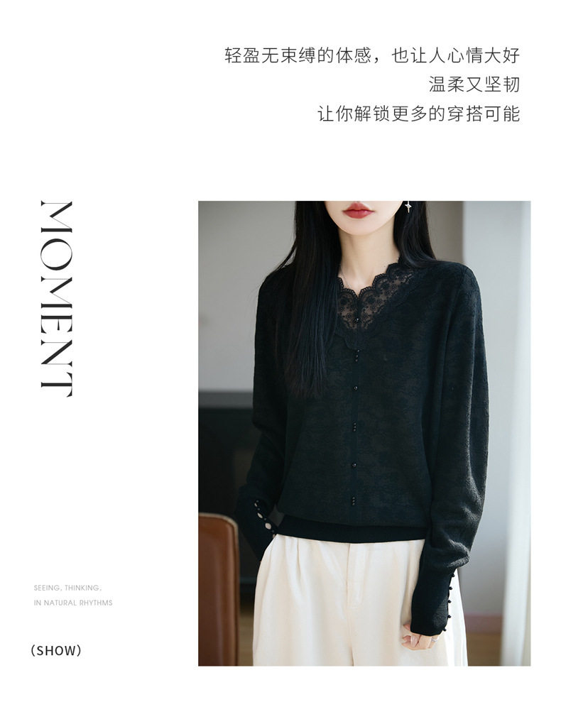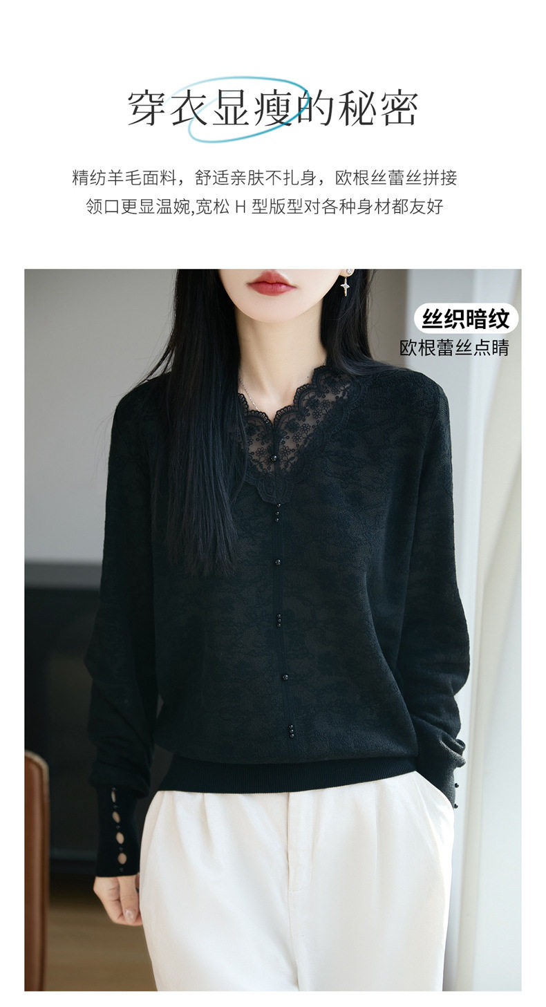 「自」全新升级【铂金会员137/天猫179/差价42】(94822)洛诗琳气质蕾丝拼接V领针织衫女2026新款女人味提花打底上衣