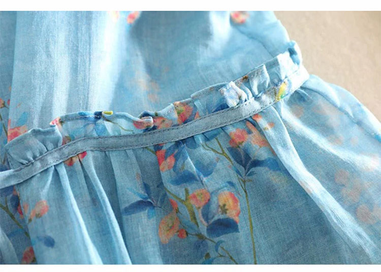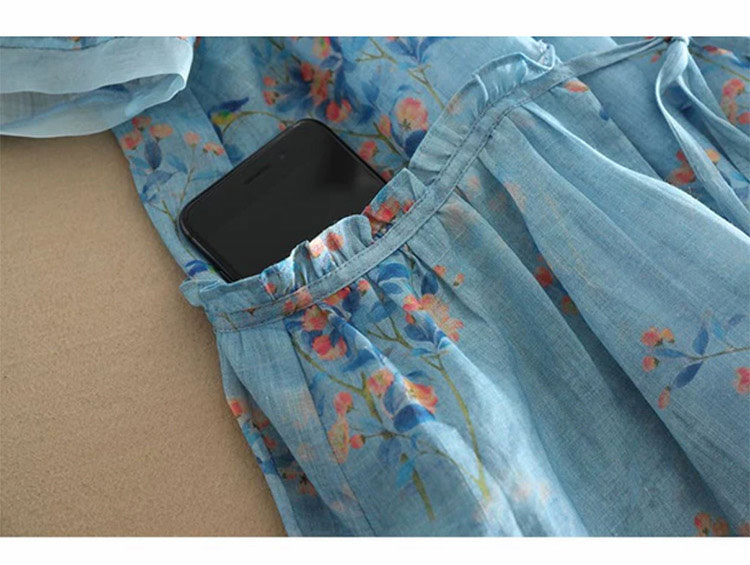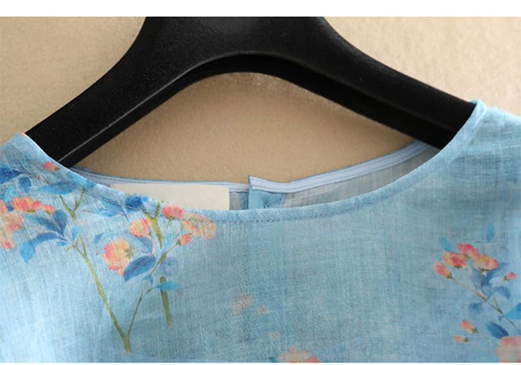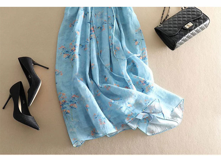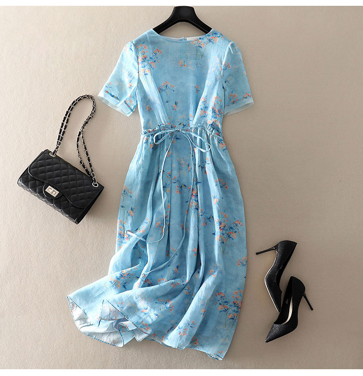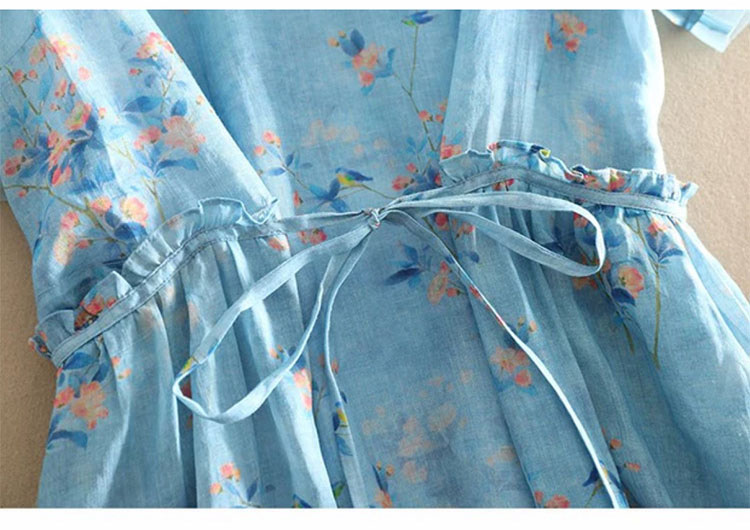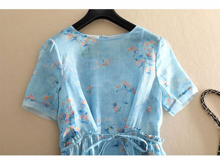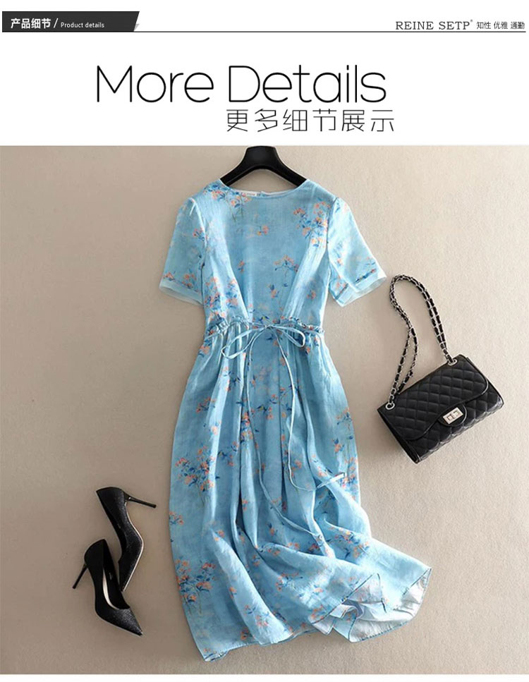 岐氏姐妹 真丝梢苎麻拼接清新印花系带旅行度假复古连衣裙20-146-DS399