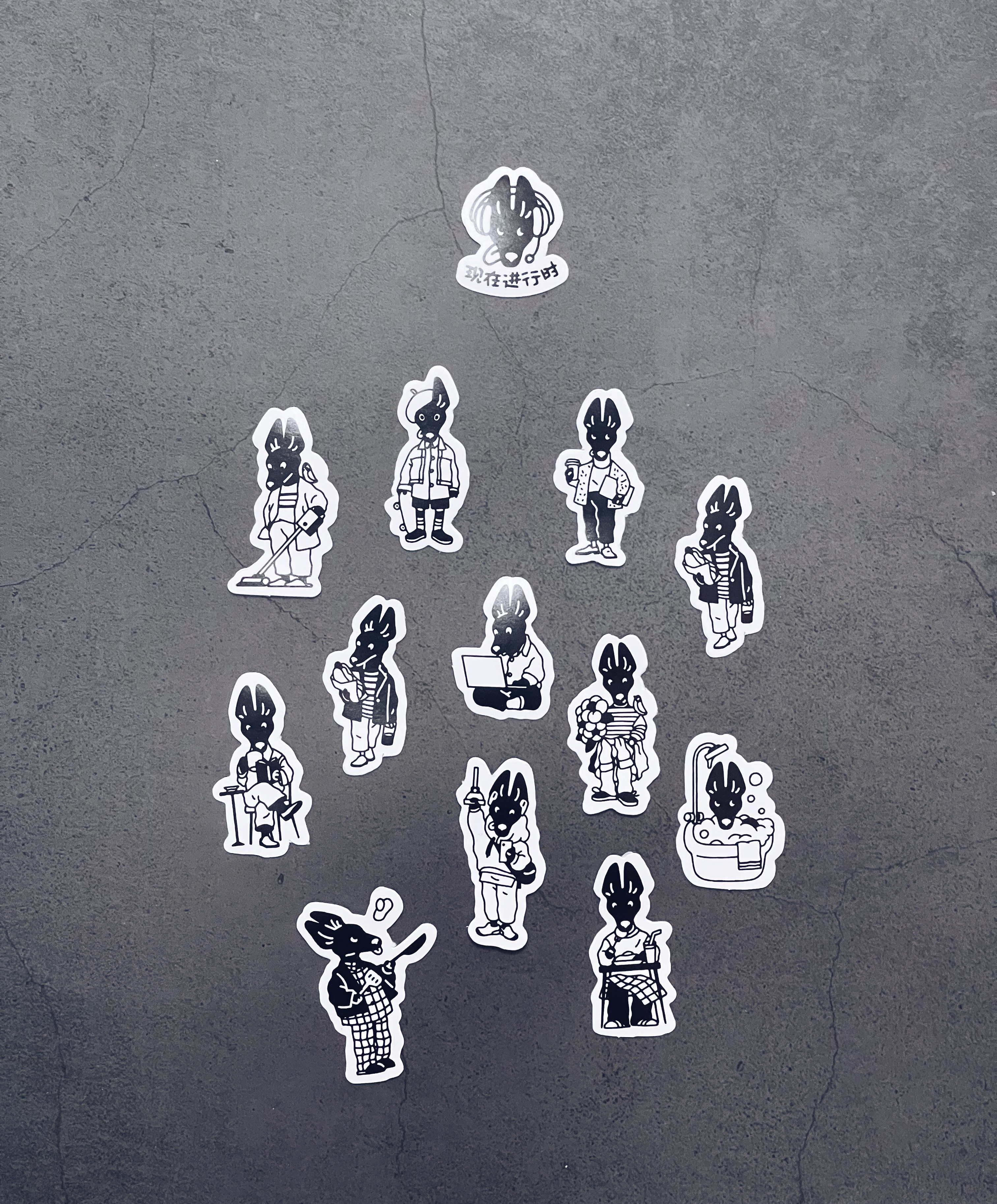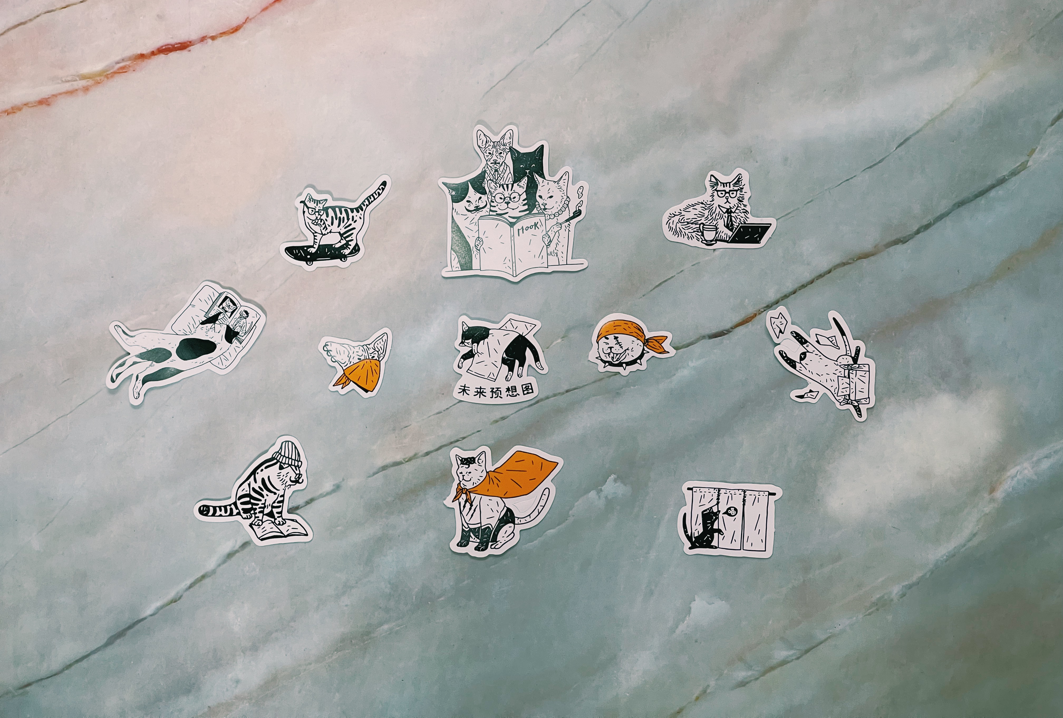 将这两个形象结合,我们制作了此次“猫狗双全”系列可移胶贴纸,整张设计稿为 A4 大小,我们会将 26 个图案裁切好装袋提供给大家。