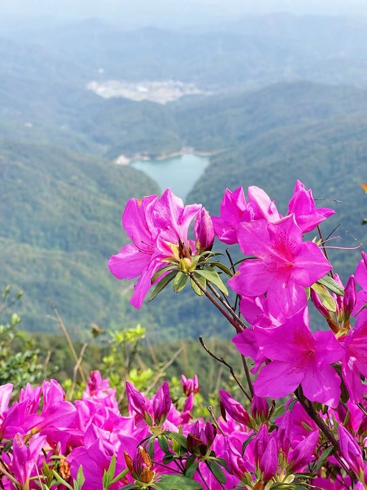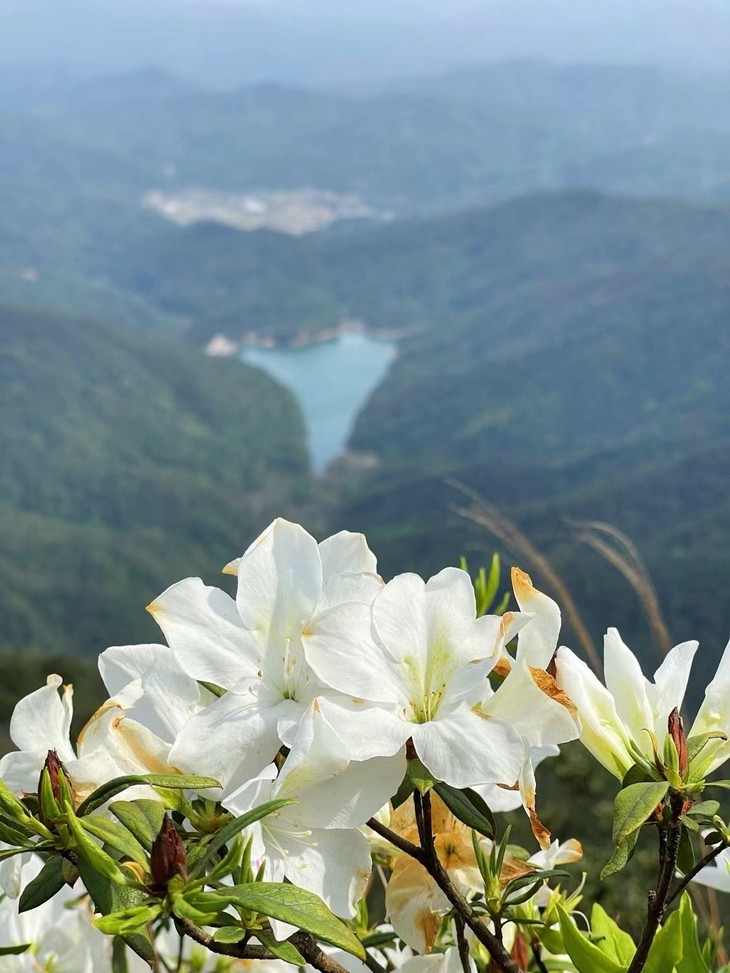 从半山腰看下去能看到上山路过的水库,山清水秀,花开满山,行走其间,就如进入了红花隧道,登山也变得更加有乐趣。